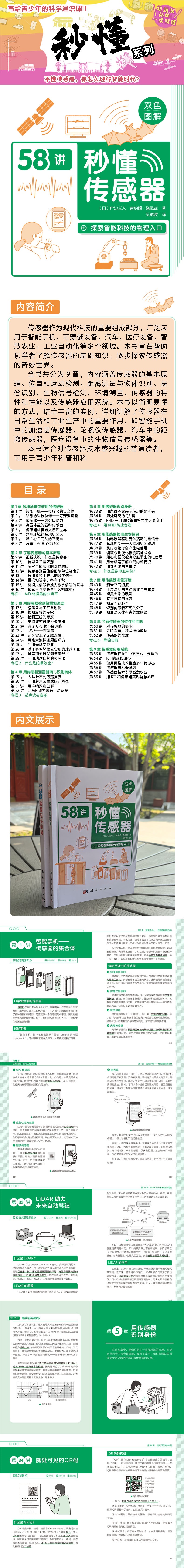 全书共分为9章,内容涵盖传感器的基本原理、位置和运动检测、距离测量与物体识别、身份识别、生物信号检测、环境测量、传感器的特性和性能以及传感器应用系统。本书以简明易懂的方式,结合丰富的实例,详细讲解了传感器在日常生活和工业生产中的重要作用,如智能手机中的加速度传感器、陀螺仪传感器,汽车中的距离传感器,医疗设备中的生物信号传感器等。