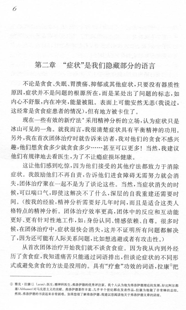 本书分三个部分:介绍了“让公众知道贪食症的重要性”、“各种常见的厌食贪食症治疗或辅助方法”(如认知行为疗法、匿名贪食症患者团体、传统精神分析及后弗洛伊德精神分析、人本主义疗法),展示了具体的治疗场景及成功案例。