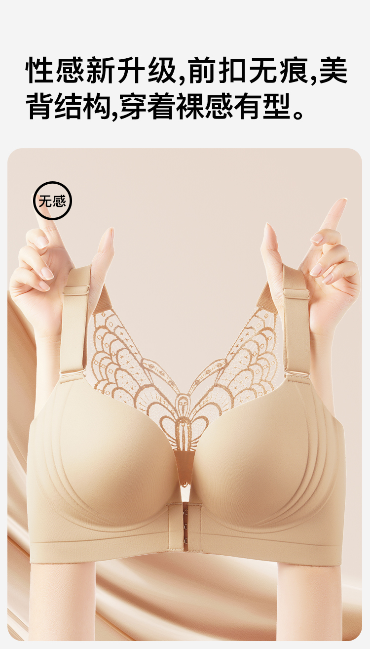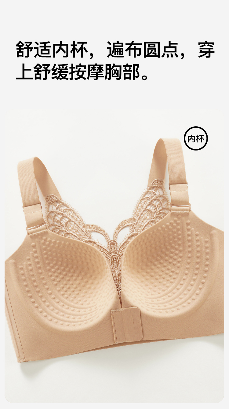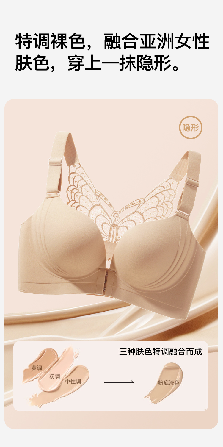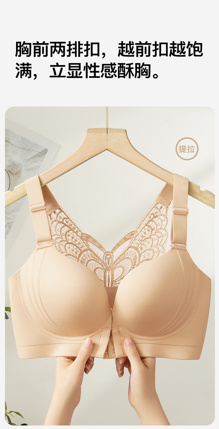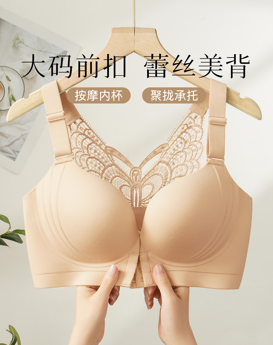 【隐形粉底液】内衣女大码前扣性感蝴蝶蕾丝美背文胸舒压按摩杯盈然花语