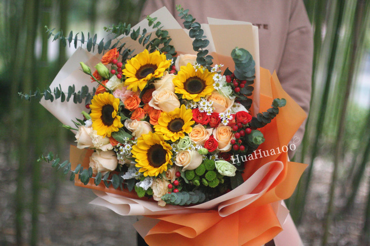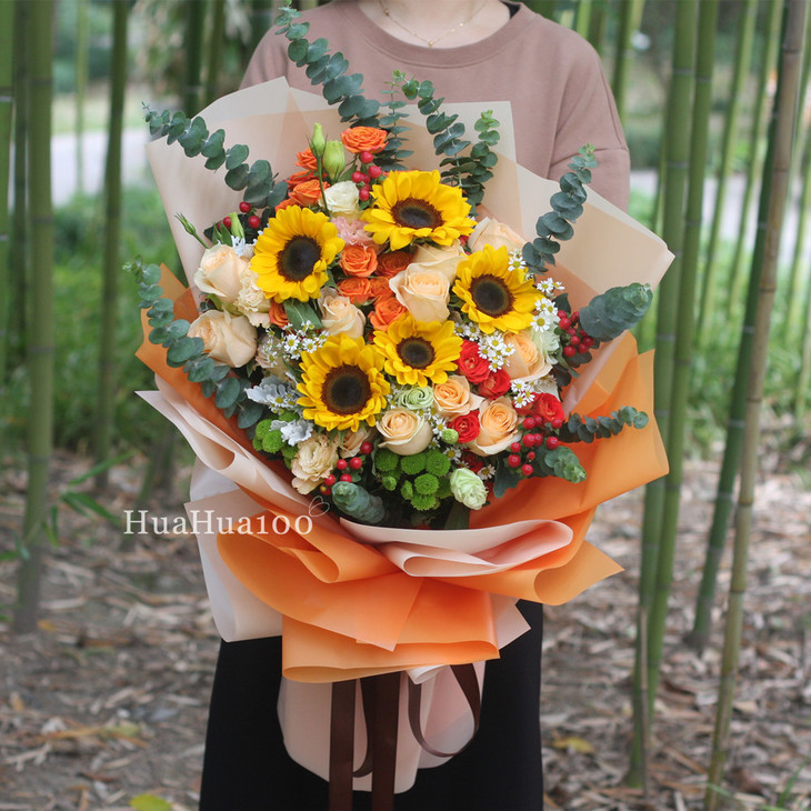 主花:狂欢玫瑰1一枝,橙色芭比2枝,香槟玫瑰11枝,向日葵5枝