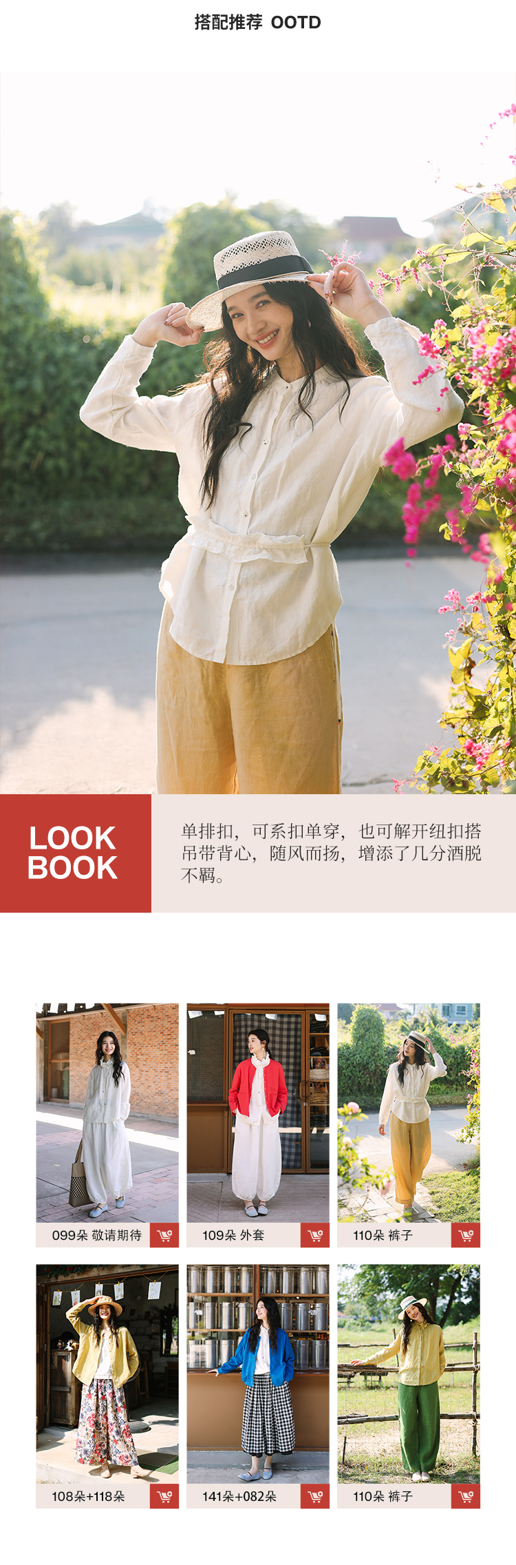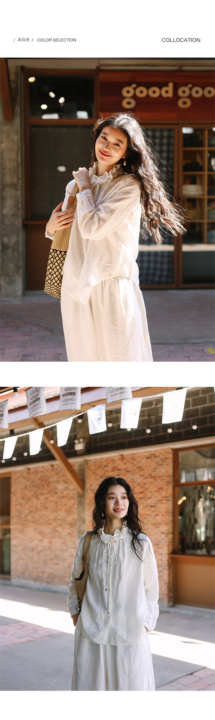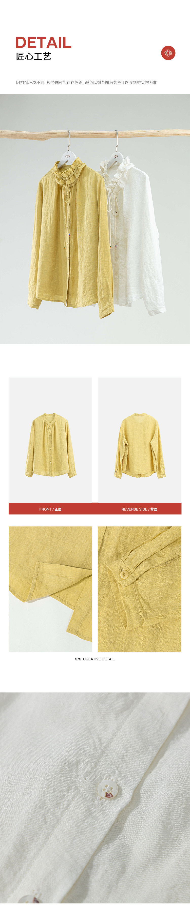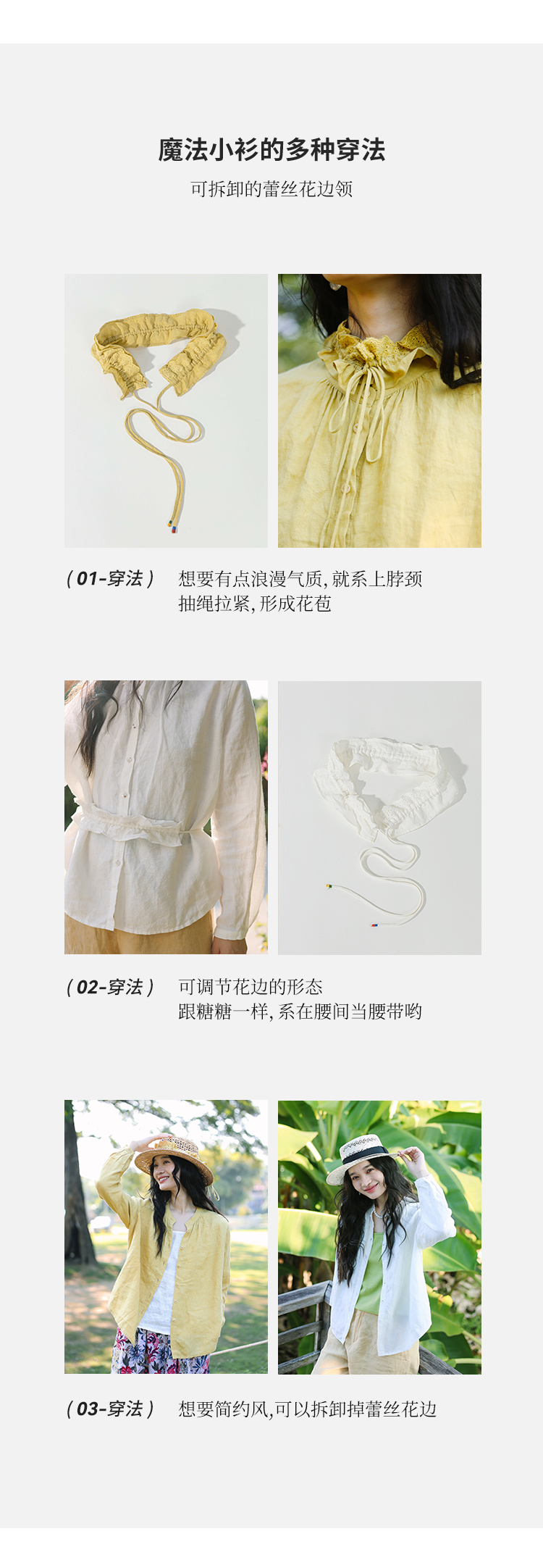 绽放旅行女装108朵/亚麻可拆卸蕾丝花边领正常肩长袖开襟简约衬衫