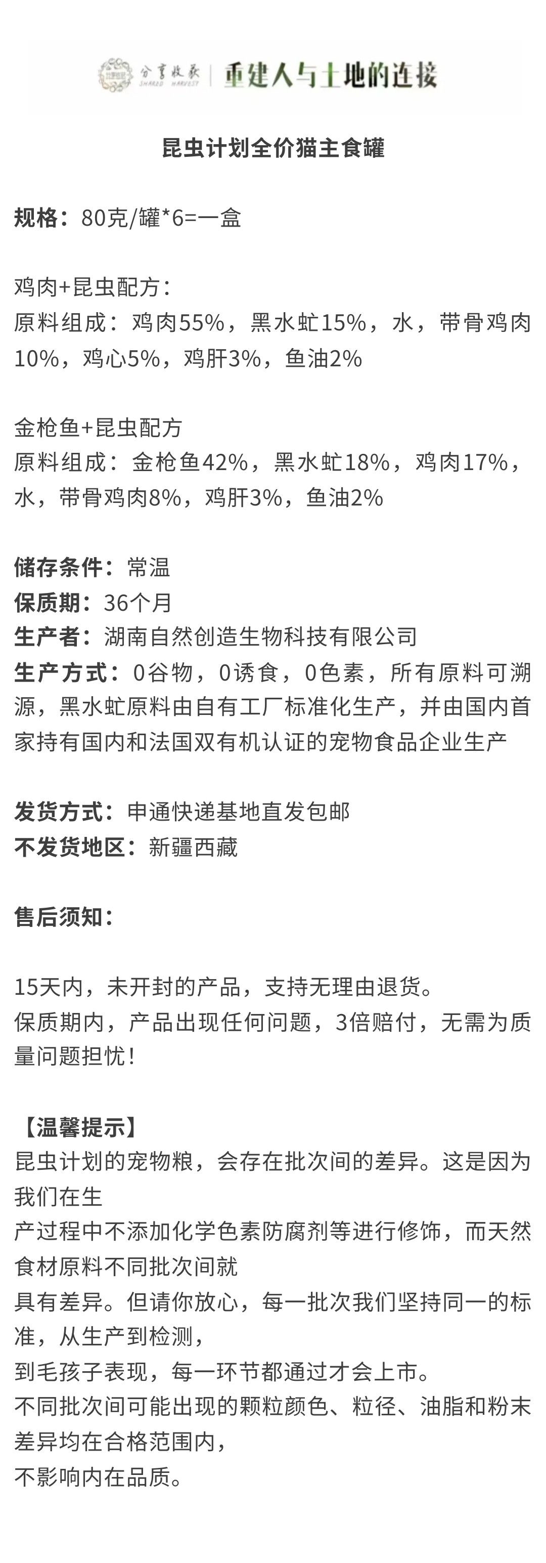 全价猫主食罐 | 双有机认证工厂加工 原料可溯源 | 不添加诱食剂和防腐剂 | 公平贸易 | 基地直发包邮*Insect Program Protein Cat Food