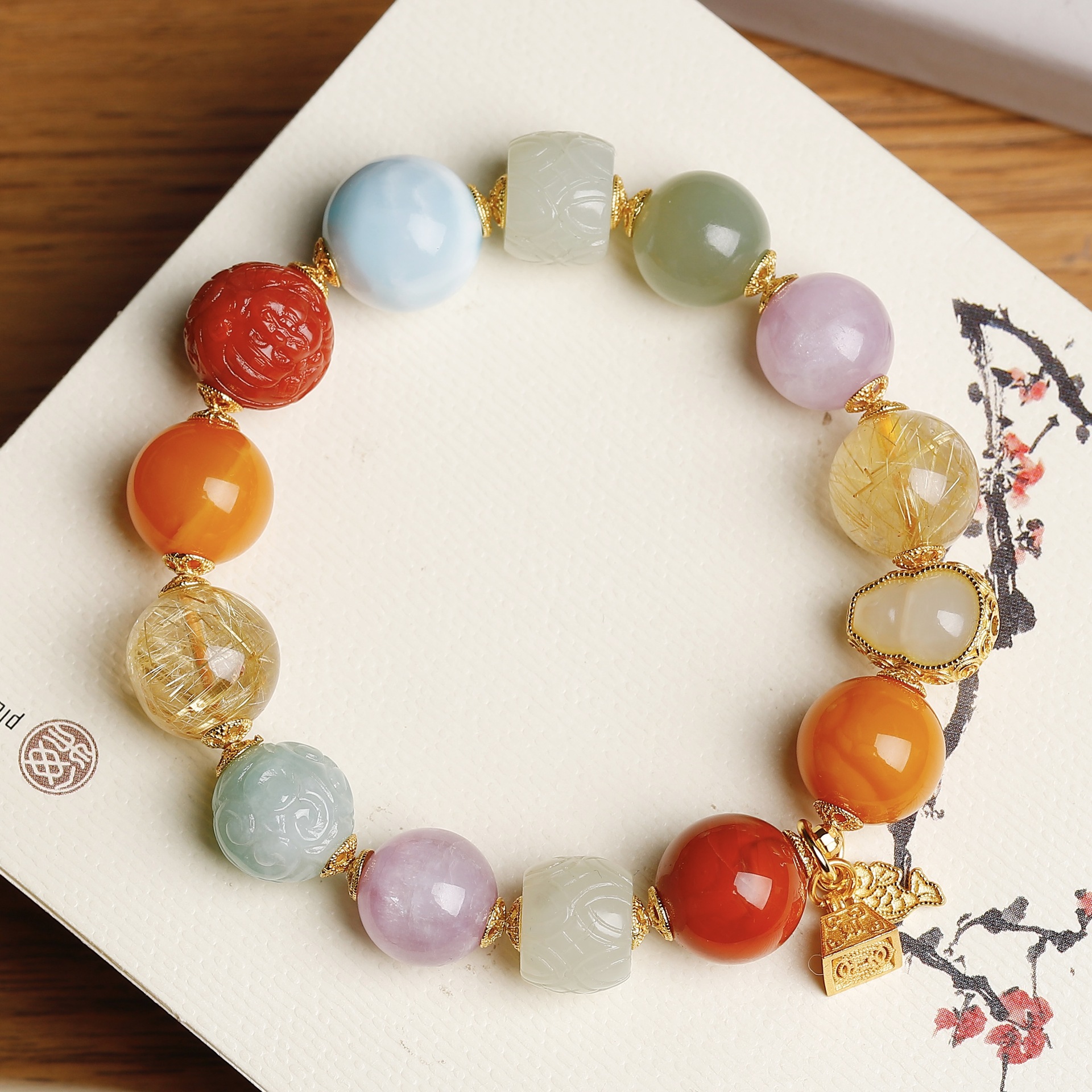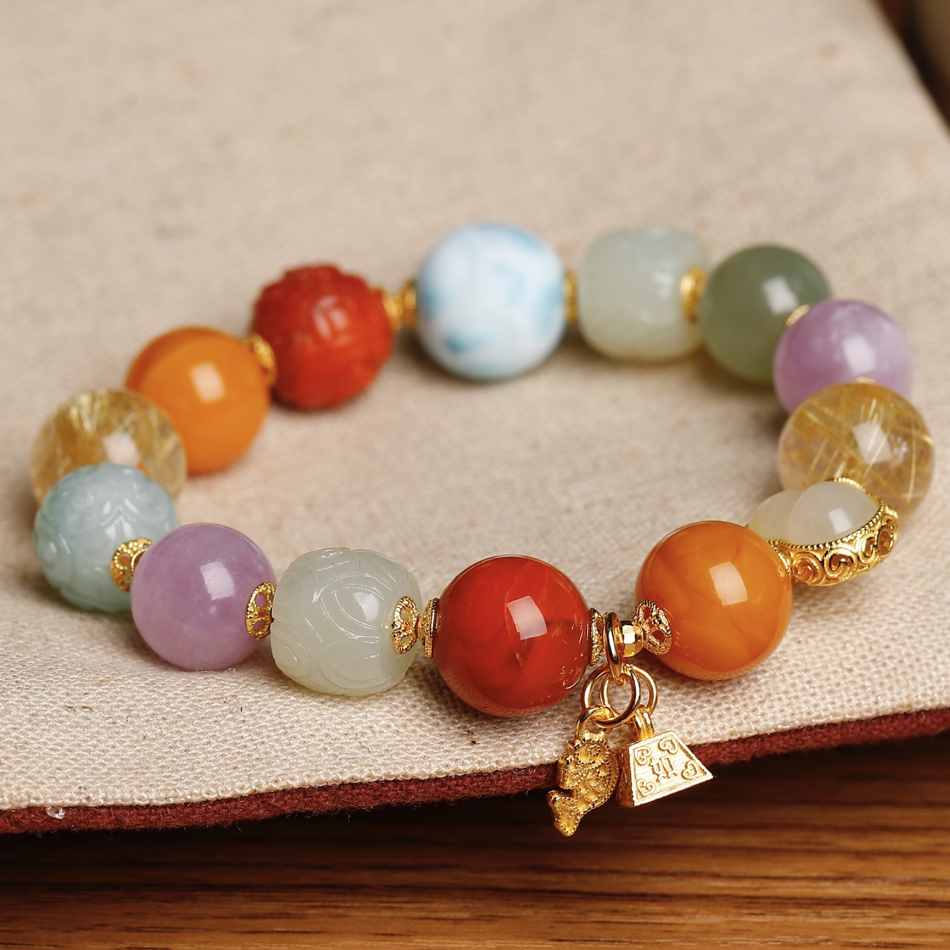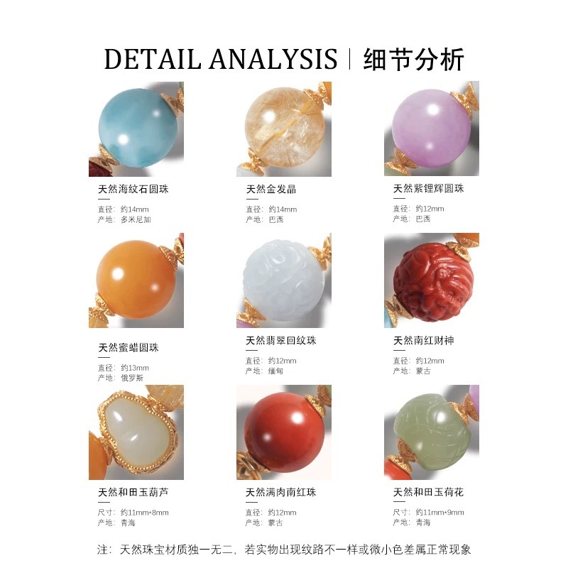 【材质】天然满肉满色南红珠12-13mm,满肉满色精雕“财富一生”南红12mm左右,天然多米尼加海纹石珠13mm左右,天然老蜜蜡珠12mm左右,天然金发晶珠13mm左右,天然A货翡翠回纹珠天然和田玉12mm,天然紫锂辉珠12mm左右,天然和田玉珠11.5mm左右,天然和田玉约12x9mm,925银镶嵌和田玉葫芦,925银称心如意、年年有鱼小吊坠