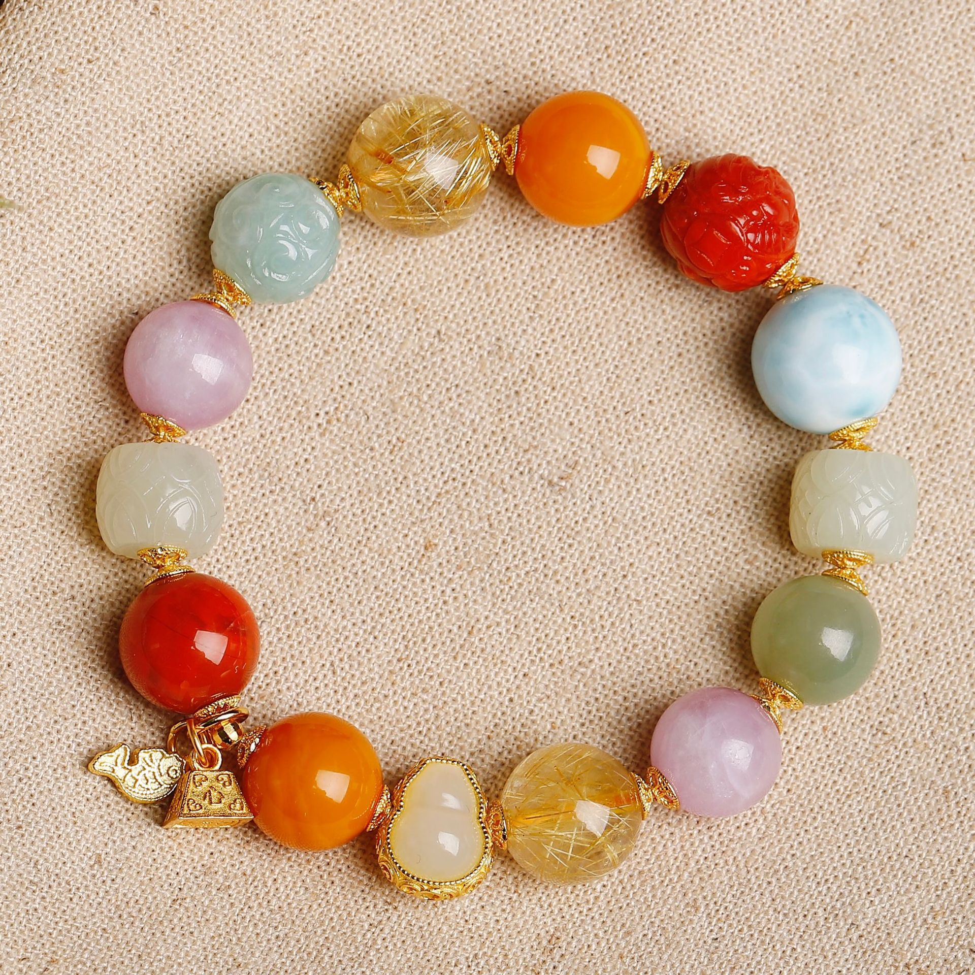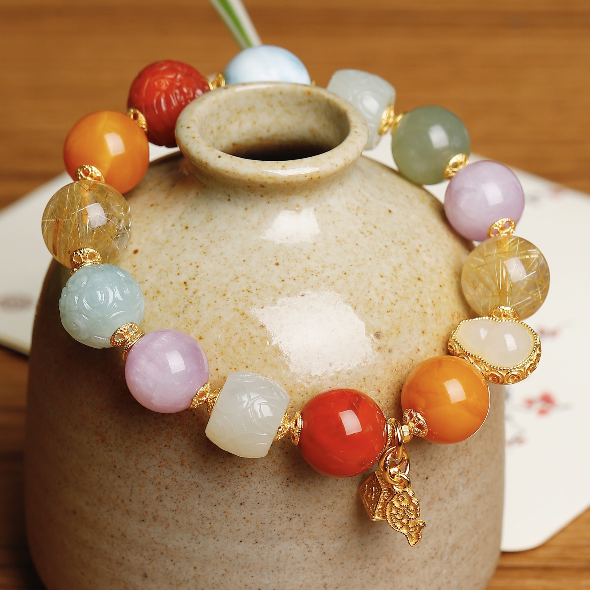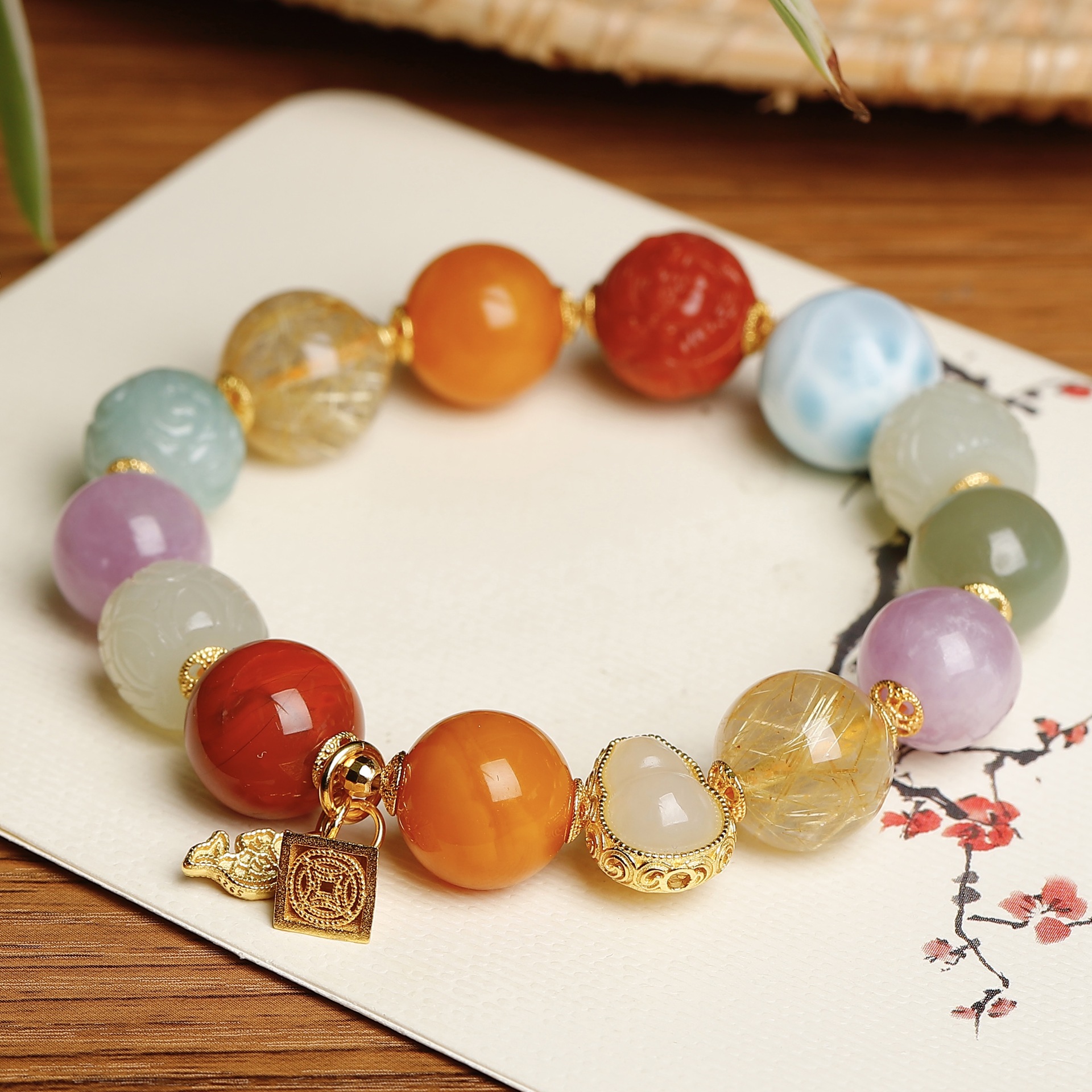 【材质】天然满肉满色南红珠12-13mm,满肉满色精雕“财富一生”南红12mm左右,天然多米尼加海纹石珠13mm左右,天然老蜜蜡珠12mm左右,天然金发晶珠13mm左右,天然A货翡翠回纹珠天然和田玉12mm,天然紫锂辉珠12mm左右,天然和田玉珠11.5mm左右,天然和田玉约12x9mm,925银镶嵌和田玉葫芦,925银称心如意、年年有鱼小吊坠