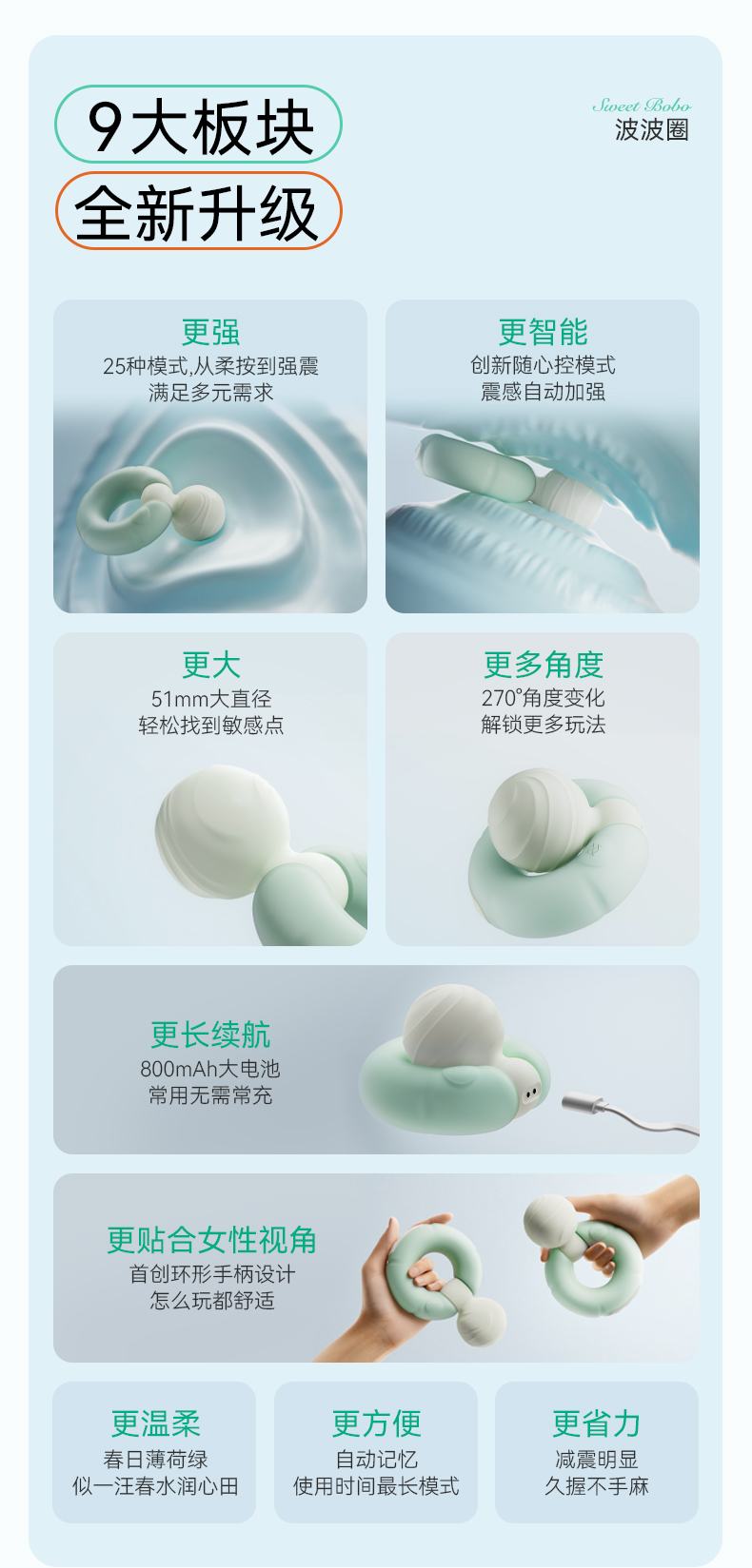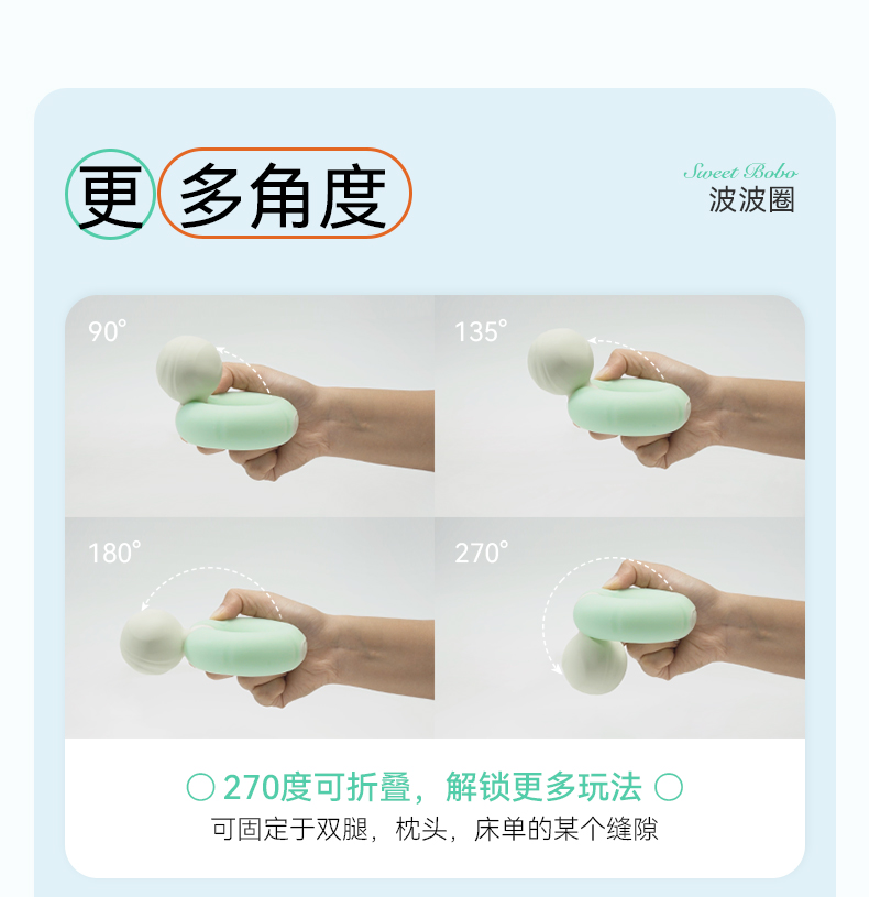 在私密护理与自我愉悦的赛道中,传统大头按摩棒数十年一成不变的设计,早已难以匹配现代女性的多元需求。为打破局限,大人糖以女性使用习惯为核心,打造出专属的Sweet Bobo波波圈!定制环形手柄握持轻盈无负担,不用再躬身找角度、费力下压,躺平状态下就可以轻松使用;创新的SenseTouch随心控技术,更颠覆了传统操作逻辑,不用费力找机身按键,只需通过夹腿、下压等自然动作,就能实现震感自动加强,达成专属默契,全程沉浸无干扰,让注意力全然聚焦于自身感受;更贴心的是,支持90°、135°、180°、270°多档位自由调节,还能固定在双腿、枕头或床单缝隙间,真正实现解放双手的惬意体验;IPX6级防水设计让清洁变得格外便捷,可直接置于水中冲洗,卫生无死角,使用更安心;内置大容量长效电池,续航能力拉满,震动最大档可连续使用3小时10分钟以上,最小档续航更可达4小时以上,日常使用每月仅需充电1次,彻底告别电量焦虑;噪音控制更是一大惊喜,运行声音≤45分贝,比落叶轻响更柔和,即便在静谧卧室或都市居家环境中,也能静享专属私密时刻,完全不必担心打扰他人。