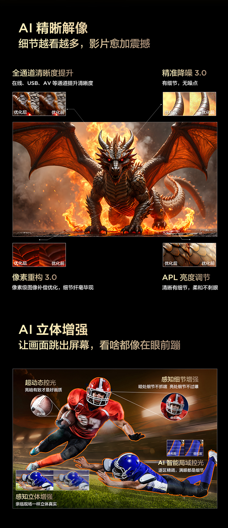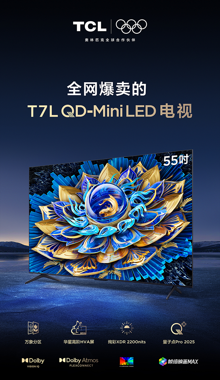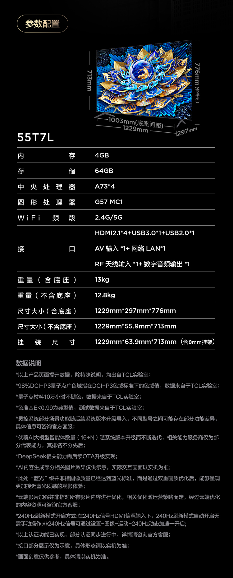 TCL电视 55T7L 55英寸 QD-Mini LED 华星高阶HVA屏 万象分区 绚彩XDR 2200nits 超薄电视