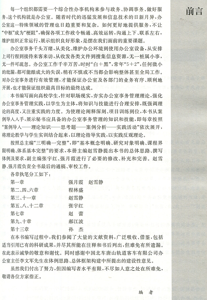 《办公室事务管理》根据近年来秘书办公室管理工作的需要,围绕秘书在办公室事务管理方方面面的工作展开论述,汇集了秘书的基础工作,即办公室事务管理的基本内容。全书共七章,包括绪论、办公室环境、常规办公室工作、办公用品管理、办公效率及时间管理、办公室信息资源管理和档案管理。本书每章开头都用案例导入,提出问题,引出正文,每个章节后都配有本章小结、关键概念、思考与练习和案例评点。