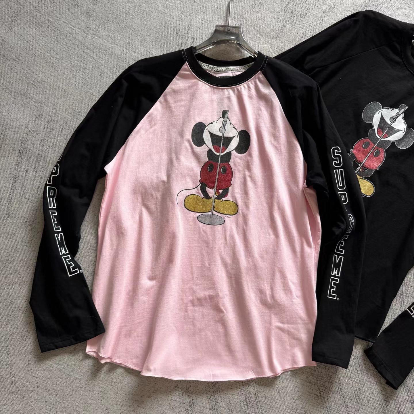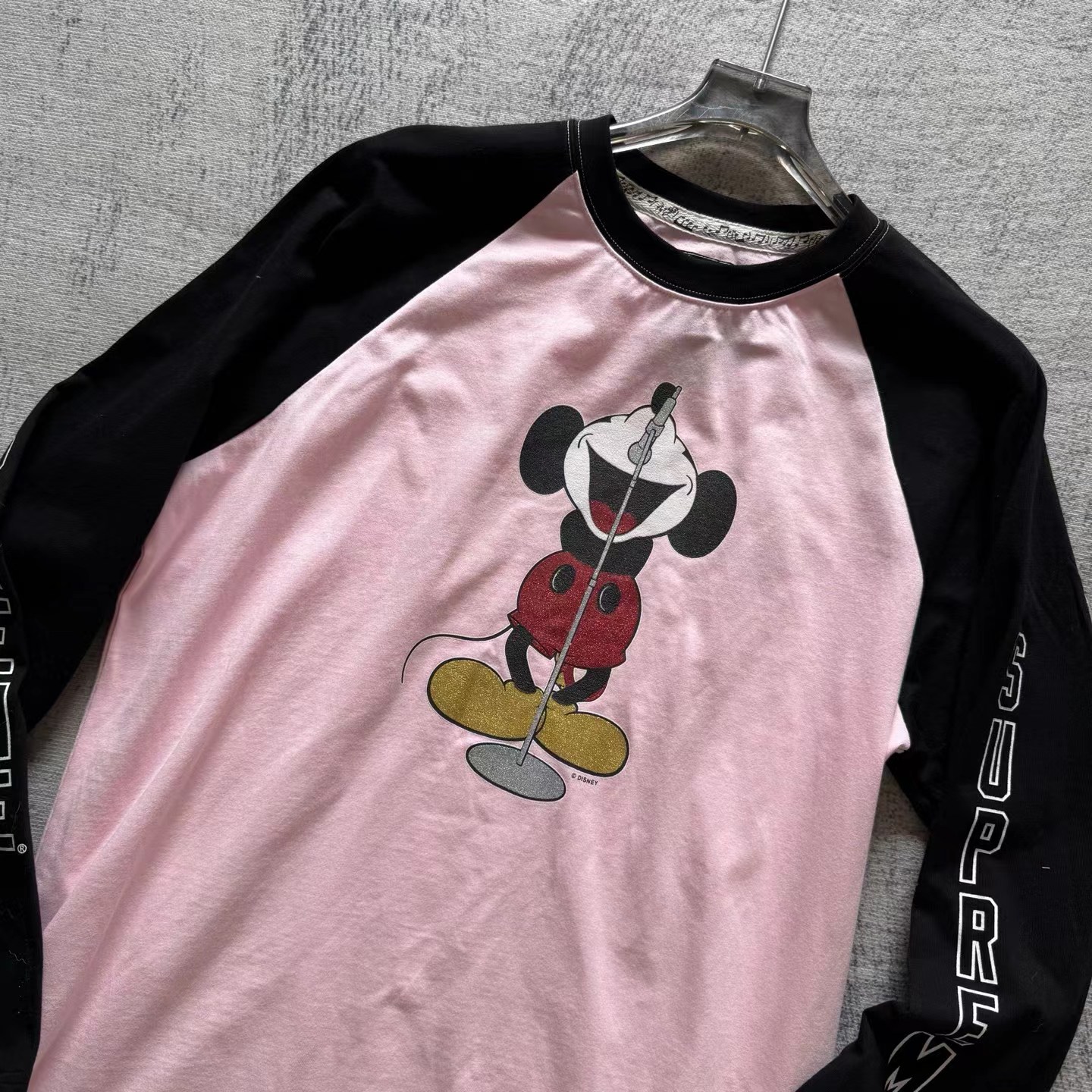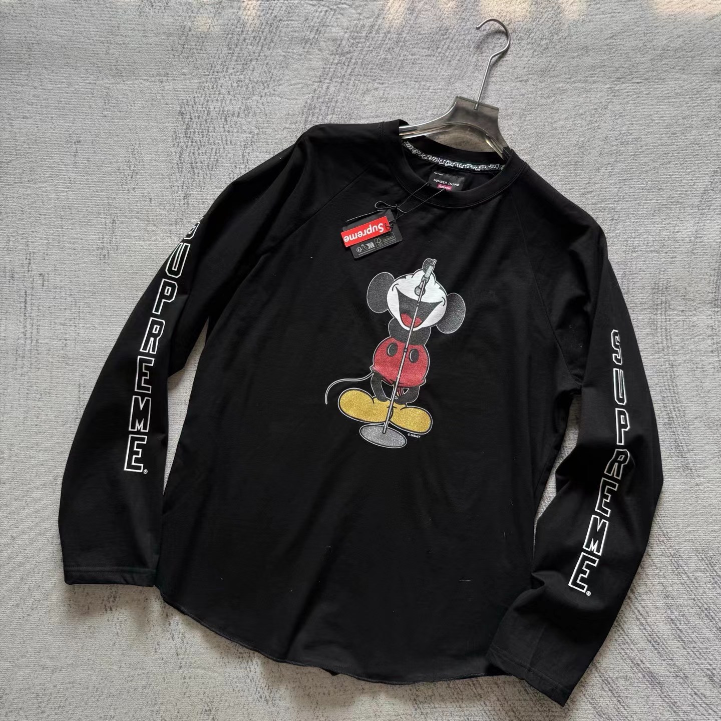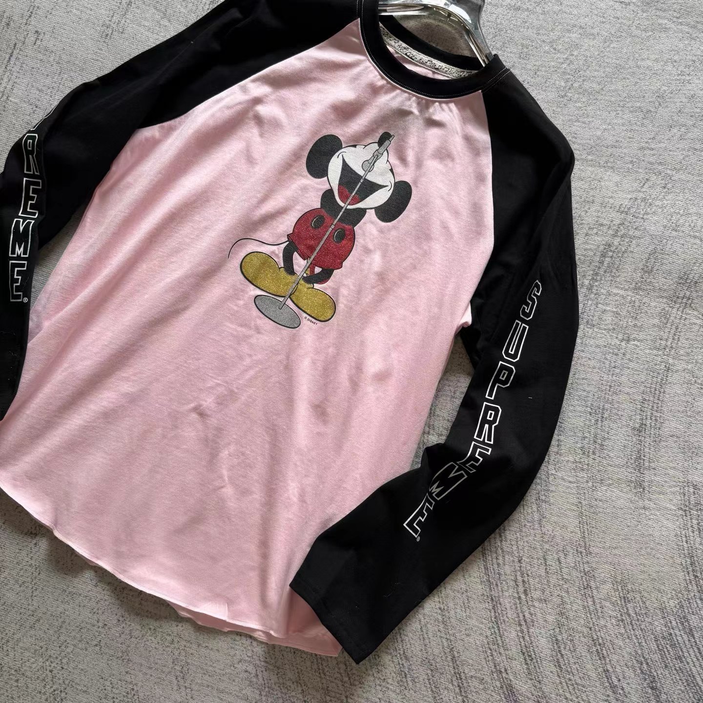 米奇印花图案圆领长袖T恤 男女同款!!摇滚唱歌米奇印花图案,闪粉工艺印花,闪闪发亮的,很有舞台Feel!两边袖子印花,后幅也很特别地印了米奇的背后,衣服面料采用高品质纯棉面料 做水洗工艺 不缩水不变形 手感更加柔软 全新黑色米奇联名吊牌,水洗辅料全部 wan美还原!!