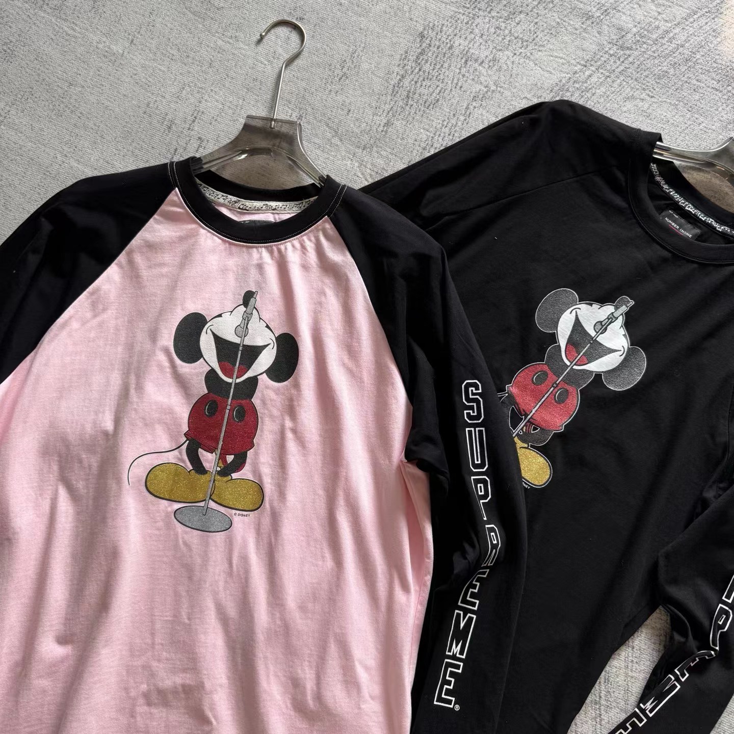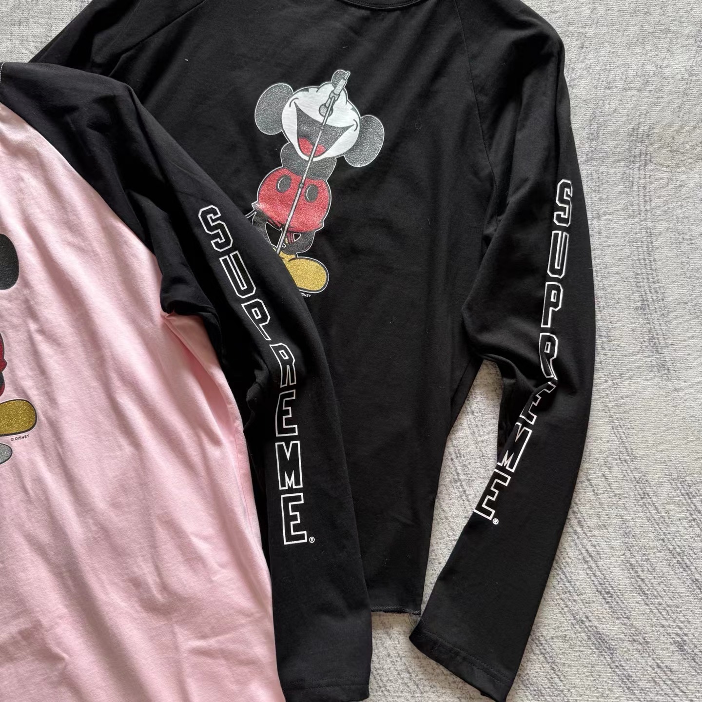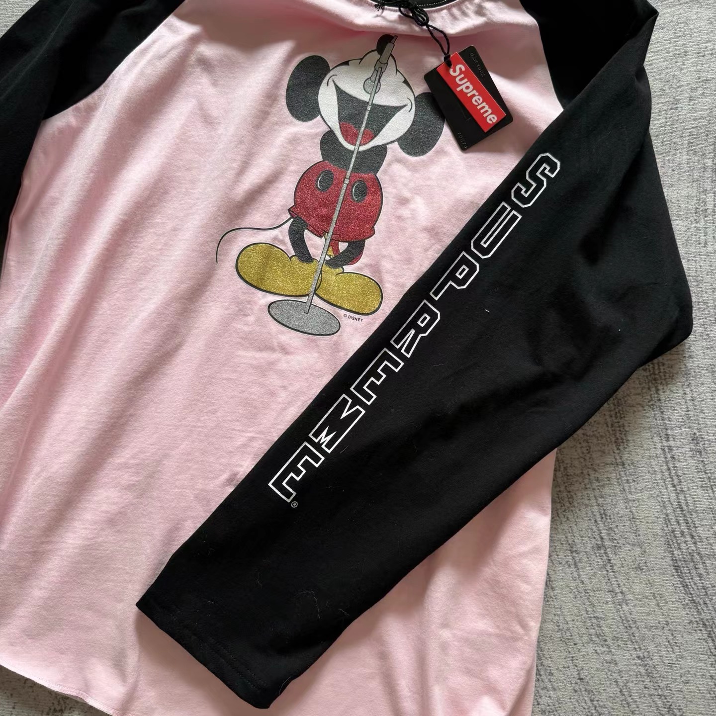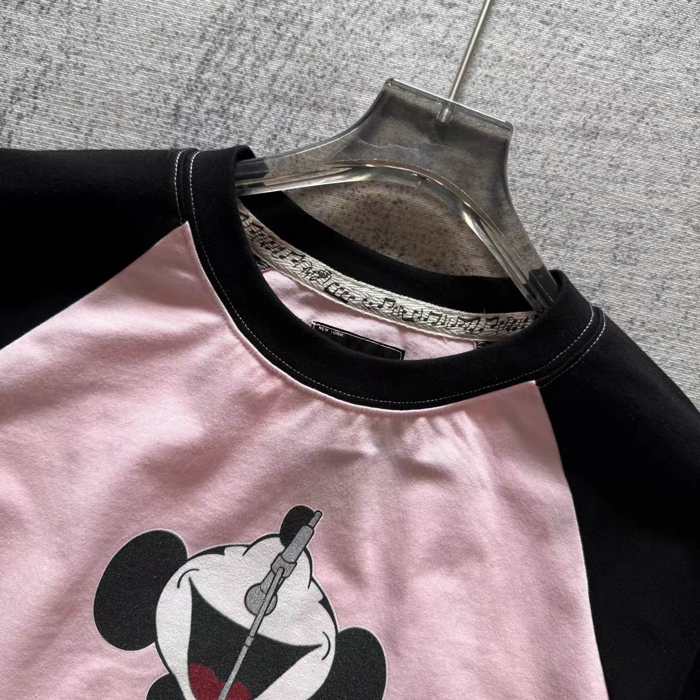 米奇印花图案圆领长袖T恤 男女同款!!摇滚唱歌米奇印花图案,闪粉工艺印花,闪闪发亮的,很有舞台Feel!两边袖子印花,后幅也很特别地印了米奇的背后,衣服面料采用高品质纯棉面料 做水洗工艺 不缩水不变形 手感更加柔软 全新黑色米奇联名吊牌,水洗辅料全部 wan美还原!!