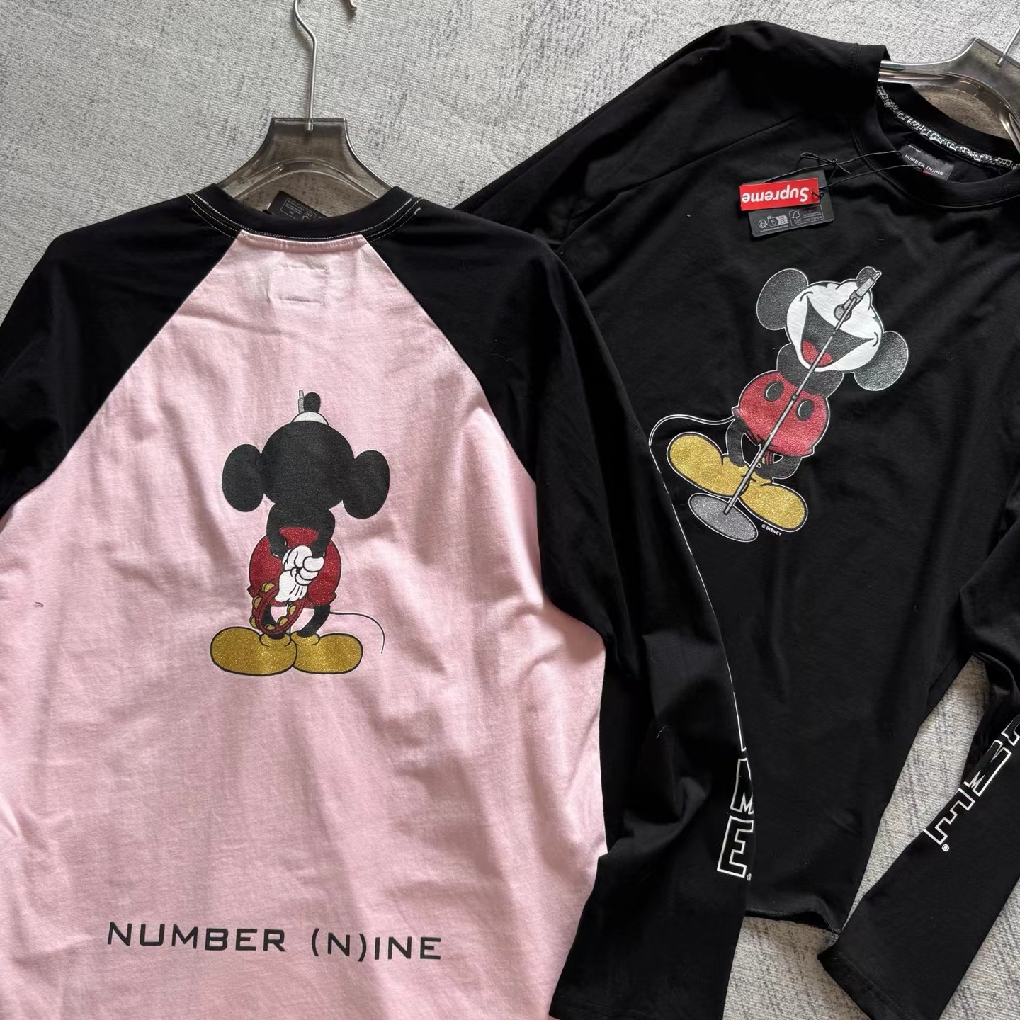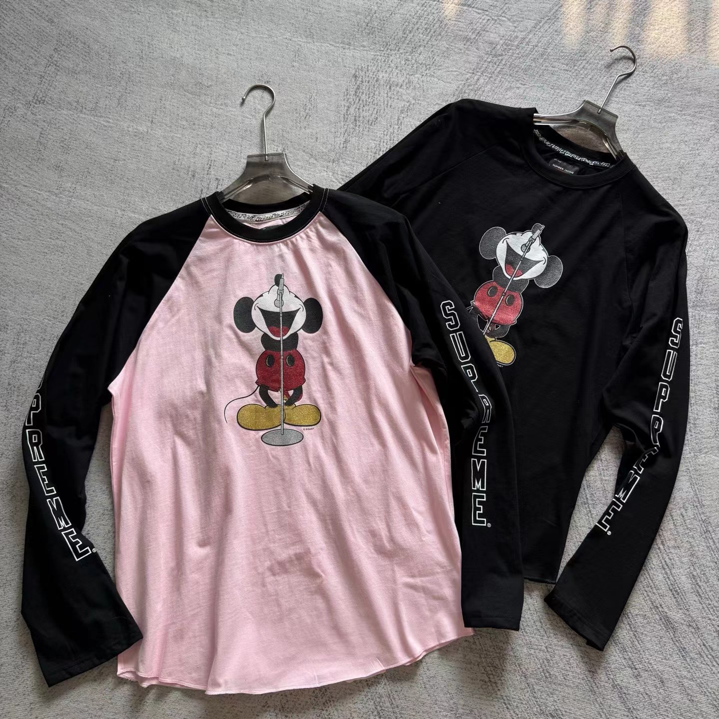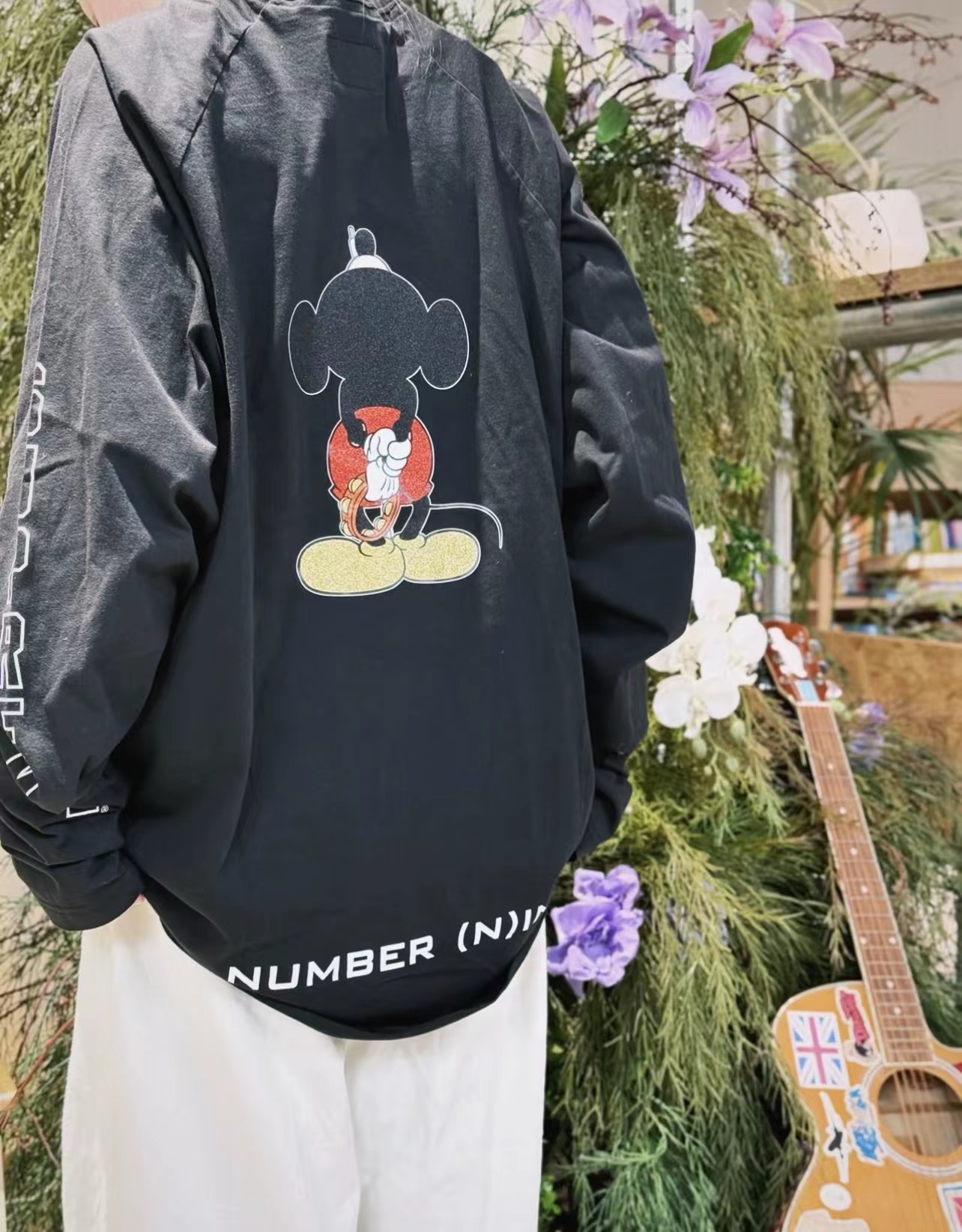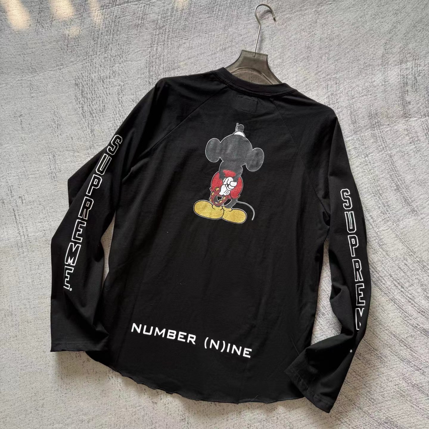 米奇印花图案圆领长袖T恤 男女同款!!摇滚唱歌米奇印花图案,闪粉工艺印花,闪闪发亮的,很有舞台Feel!两边袖子印花,后幅也很特别地印了米奇的背后,衣服面料采用高品质纯棉面料 做水洗工艺 不缩水不变形 手感更加柔软 全新黑色米奇联名吊牌,水洗辅料全部 wan美还原!!