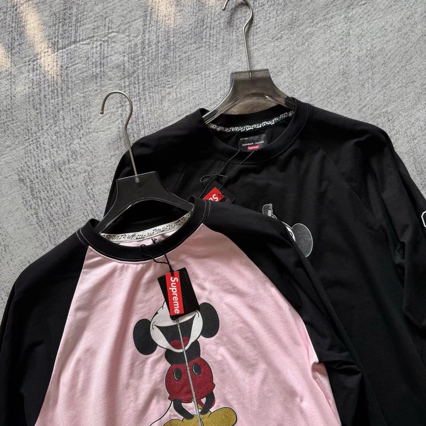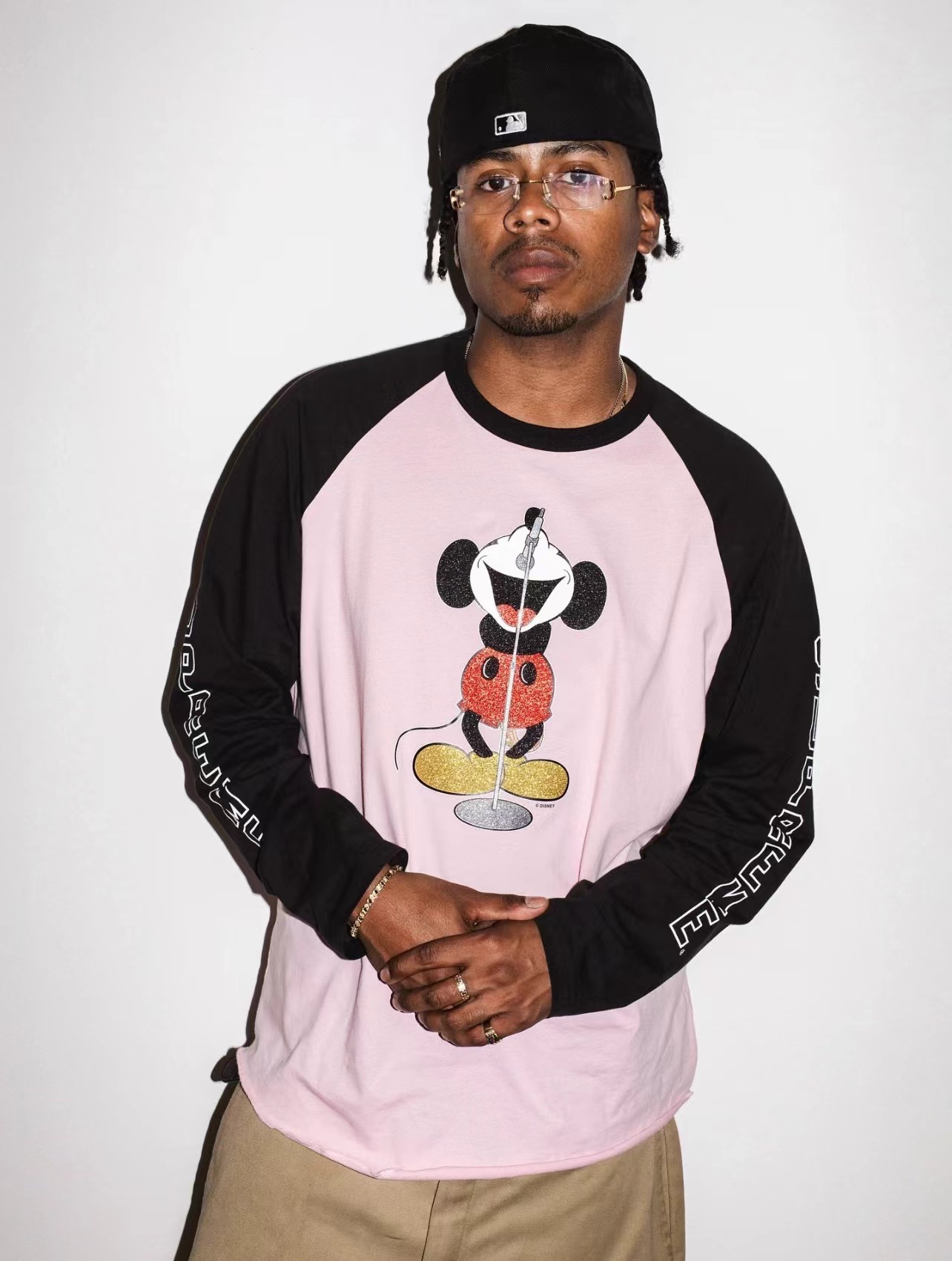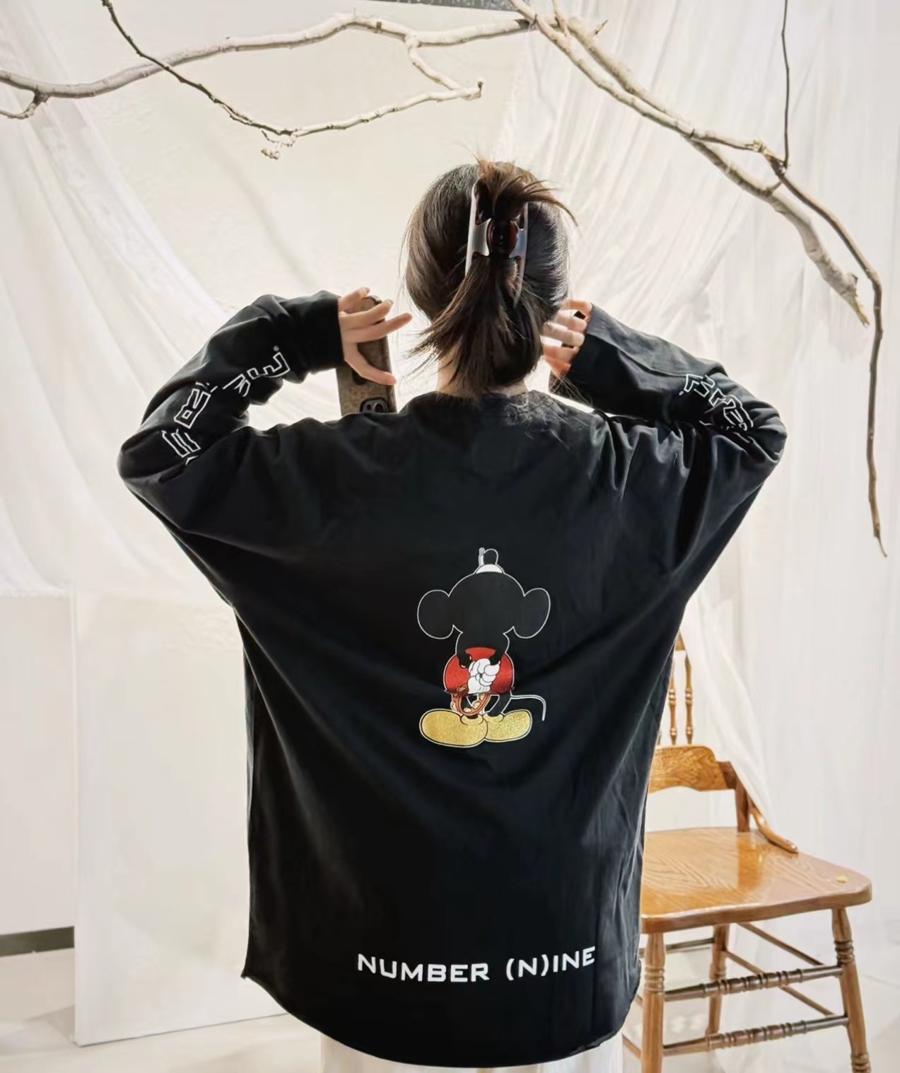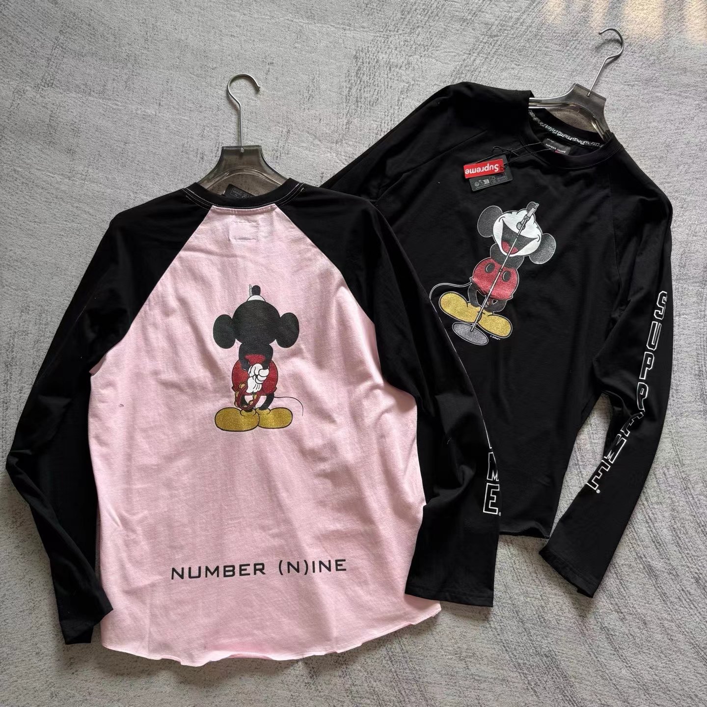 米奇印花图案圆领长袖T恤 男女同款!!摇滚唱歌米奇印花图案,闪粉工艺印花,闪闪发亮的,很有舞台Feel!两边袖子印花,后幅也很特别地印了米奇的背后,衣服面料采用高品质纯棉面料 做水洗工艺 不缩水不变形 手感更加柔软 全新黑色米奇联名吊牌,水洗辅料全部 wan美还原!!