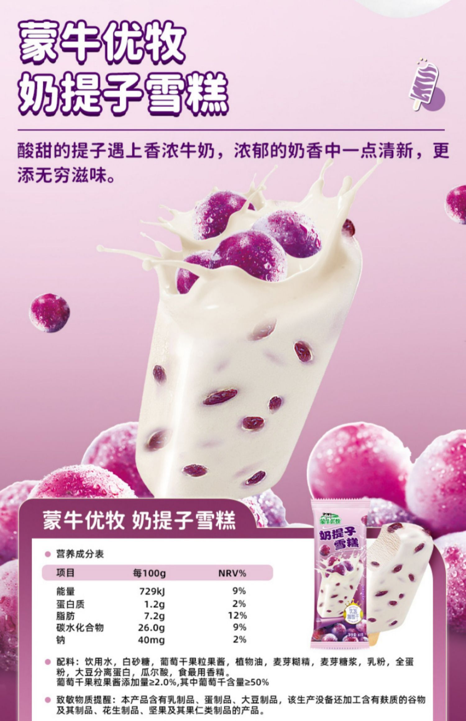 蒙牛优牧奶提子雪糕葡萄干牛奶冰淇淋65g/袋雪糕冰糕批发