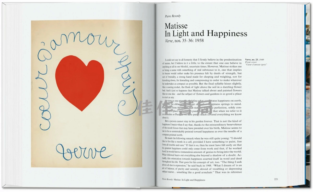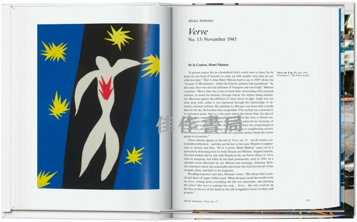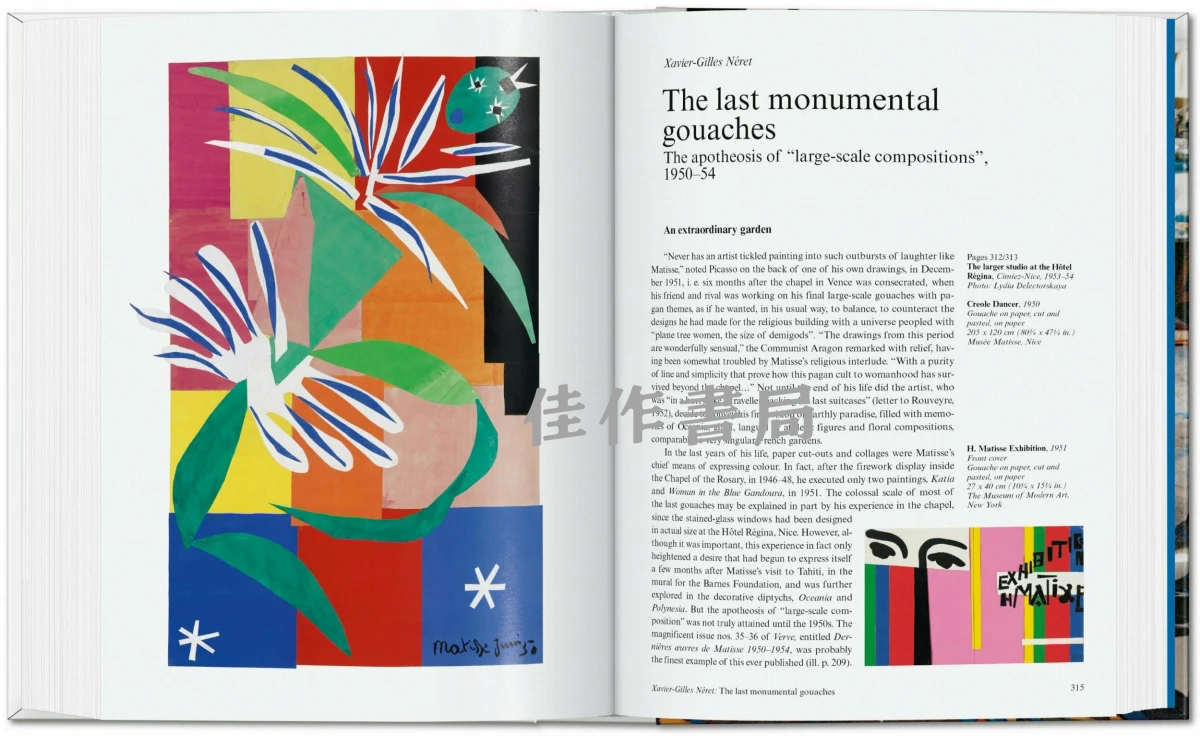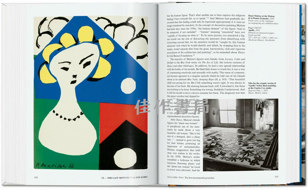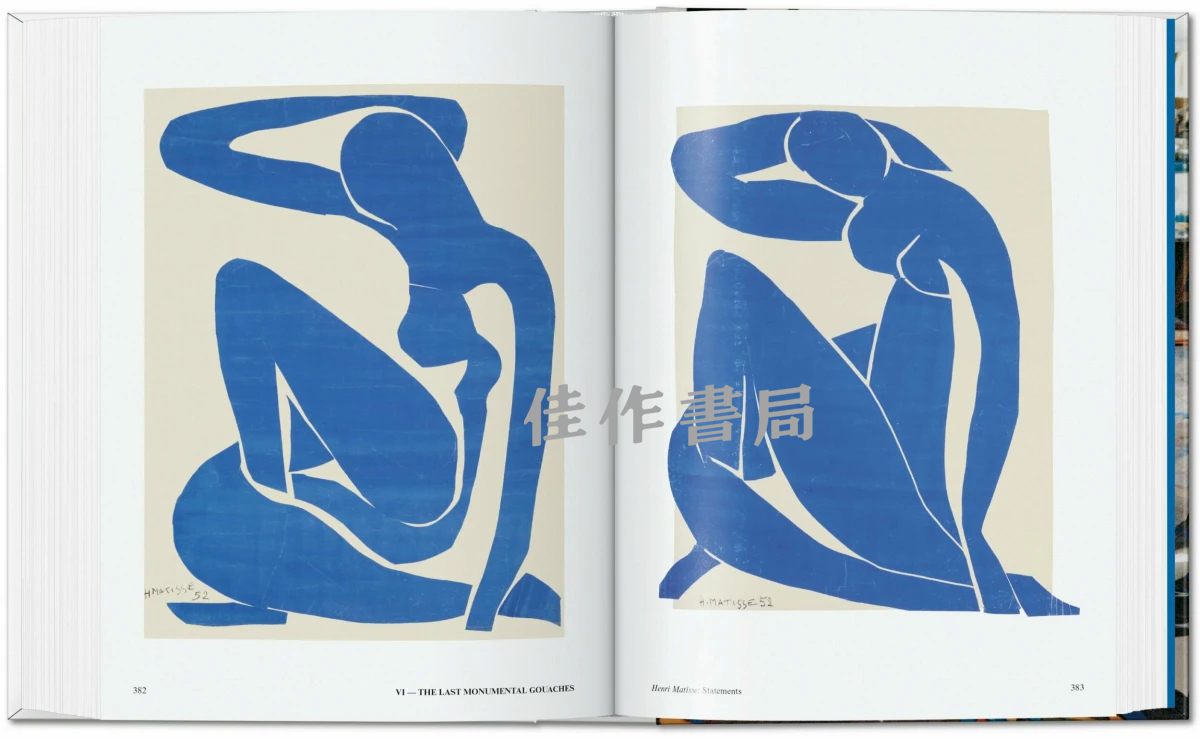 我们这本原版获奖超大尺寸书籍第一卷的这个版本,为马蒂斯的纸贴画提供了详尽的历史背景,追溯其根源至他1930年的塔希提之旅,并一直延续到他在尼斯度过的晚年。书中收录了许多马蒂斯的照片,以及亨利·卡蒂埃-布列松和电影制作人F. W. 茂瑙的一些罕见影像,还包含了马蒂斯本人、出版商E. 泰里亚德、诗人路易·阿拉贡、亨利·米肖、皮埃尔·勒韦迪以及马蒂斯的女婿乔治·杜图伊的文字作品。
