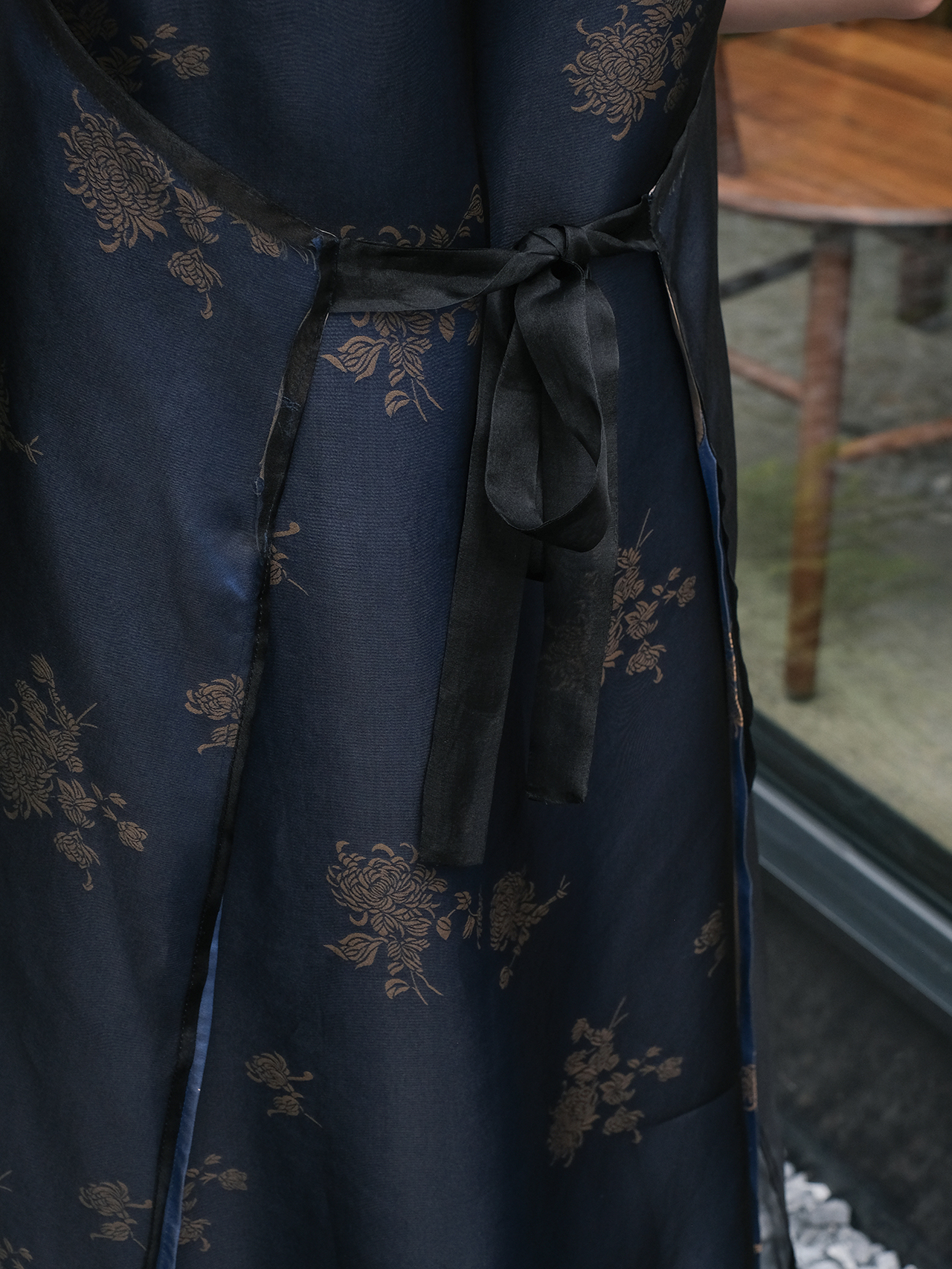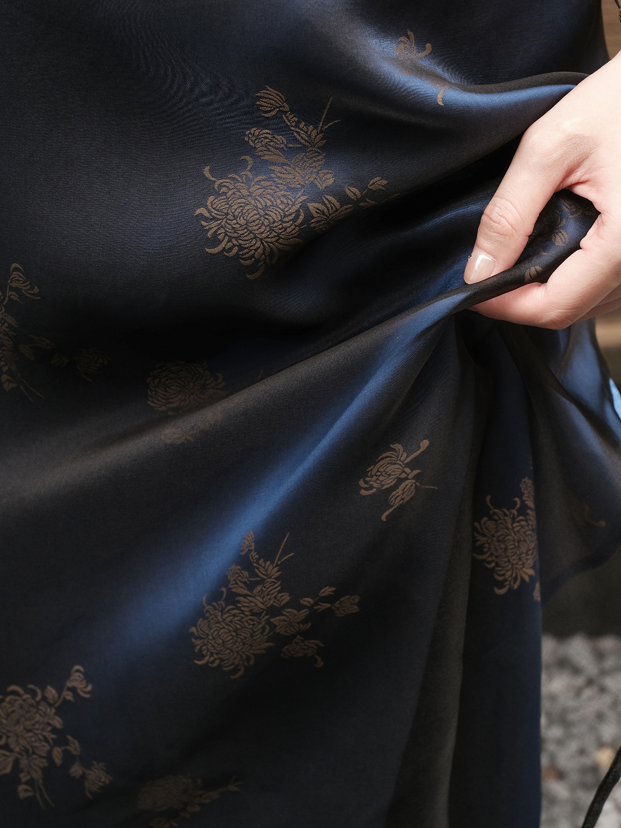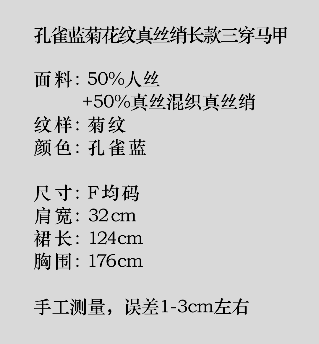 盛唐牡丹 |孔雀蓝菊花纹真丝绡长款三穿马甲