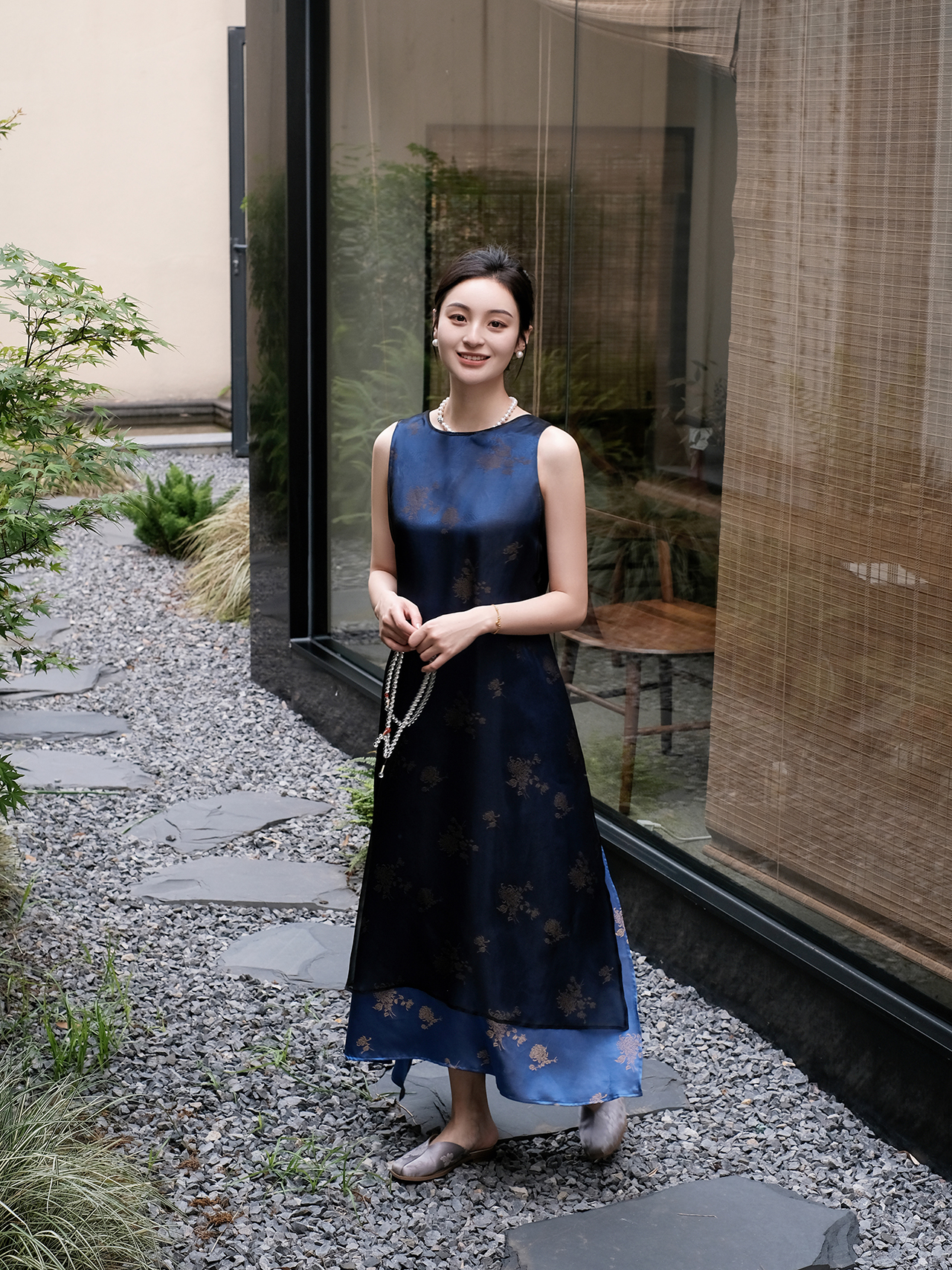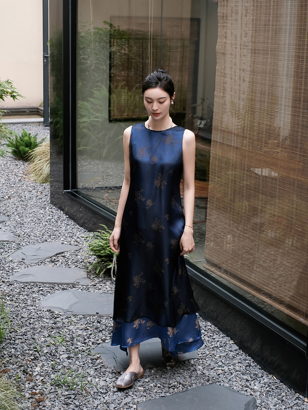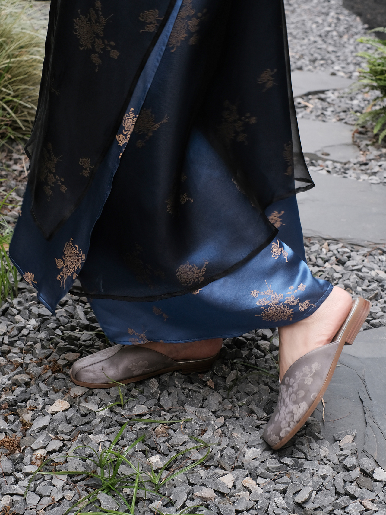 盛唐牡丹 |孔雀蓝菊花纹真丝绡长款三穿马甲