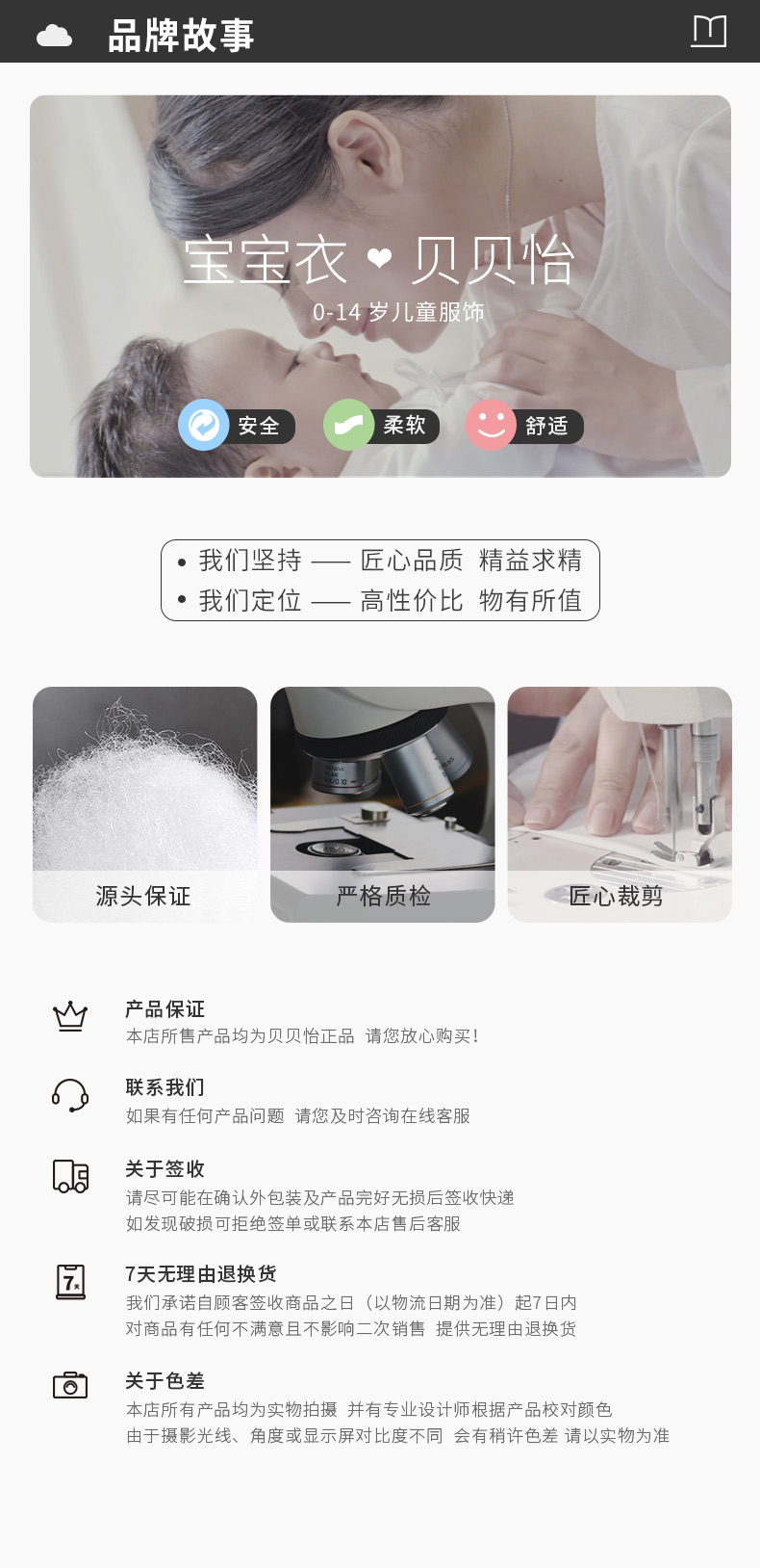 - 贝贝怡专注0-6岁婴幼儿服饰,坚持安全、柔软、舒适的产品理念,为千万中国家庭提供超高品质、安全可靠的婴幼儿服饰产品,妈妈放心,宝宝开心!