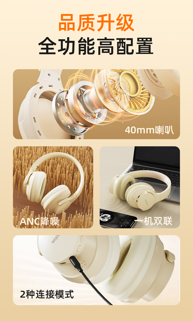 品牌直发【沃品 头戴式降噪蓝牙耳机BTS01】千元级别的音质!203g超轻机身 ANC降噪 HIFI环绕 音效全包裹空气耳罩,记忆棉设计柔软舒适不压耳