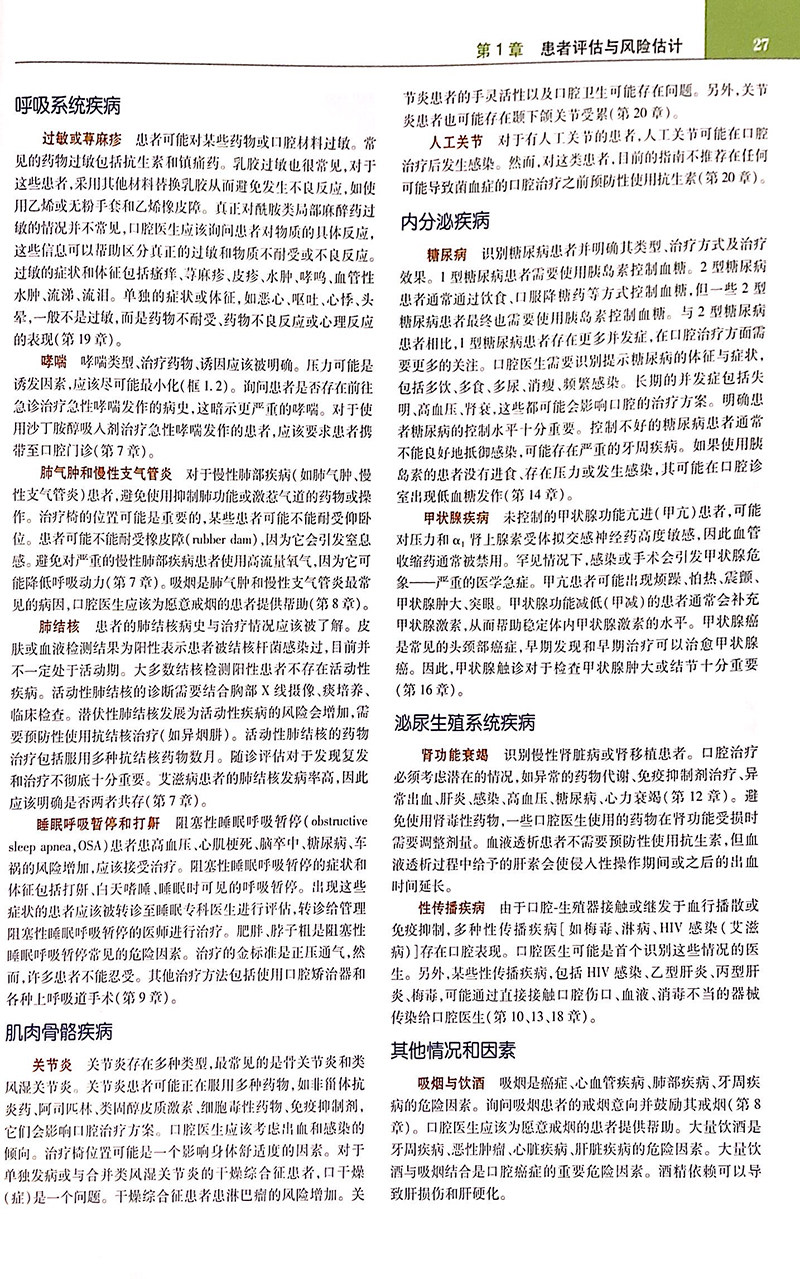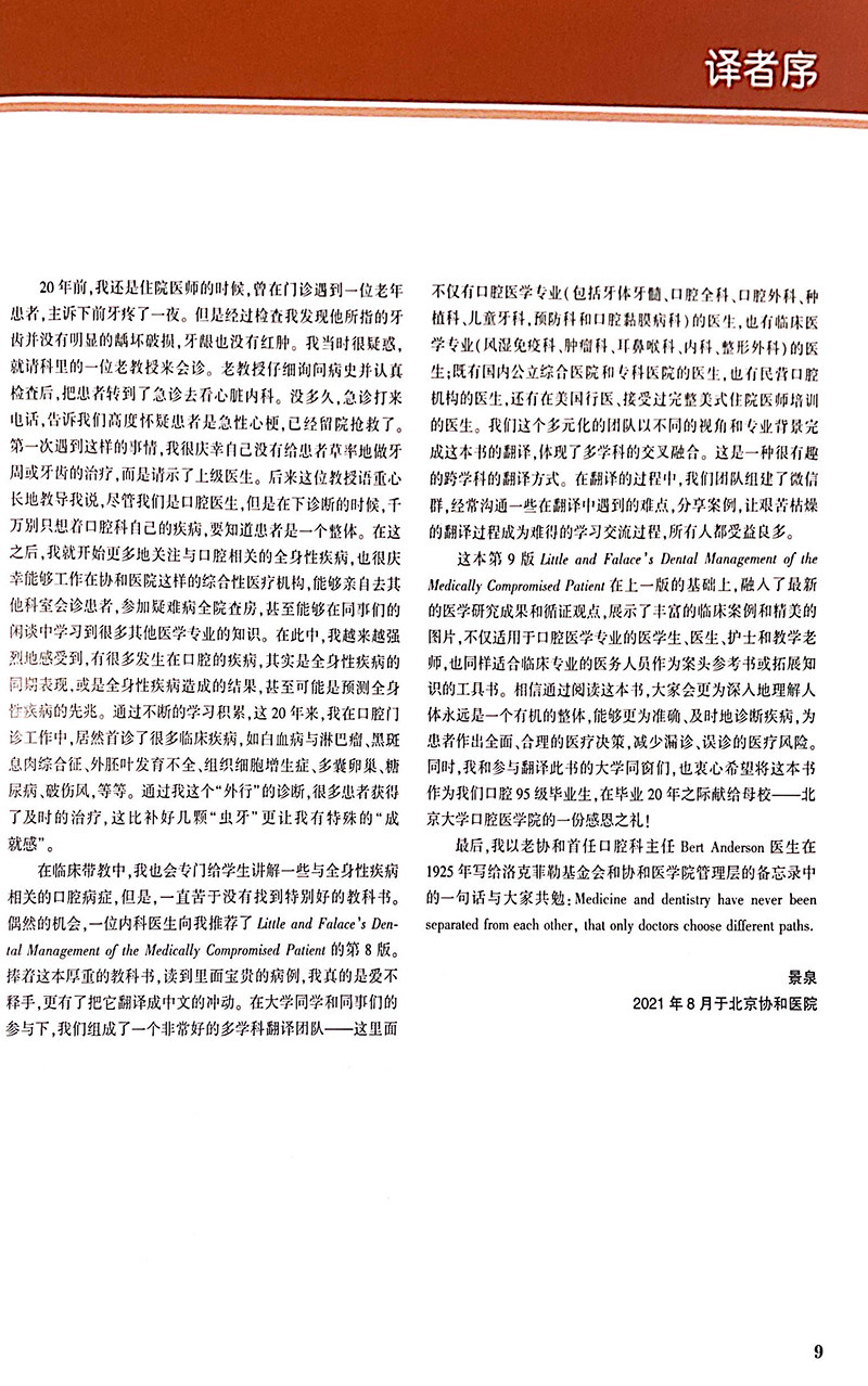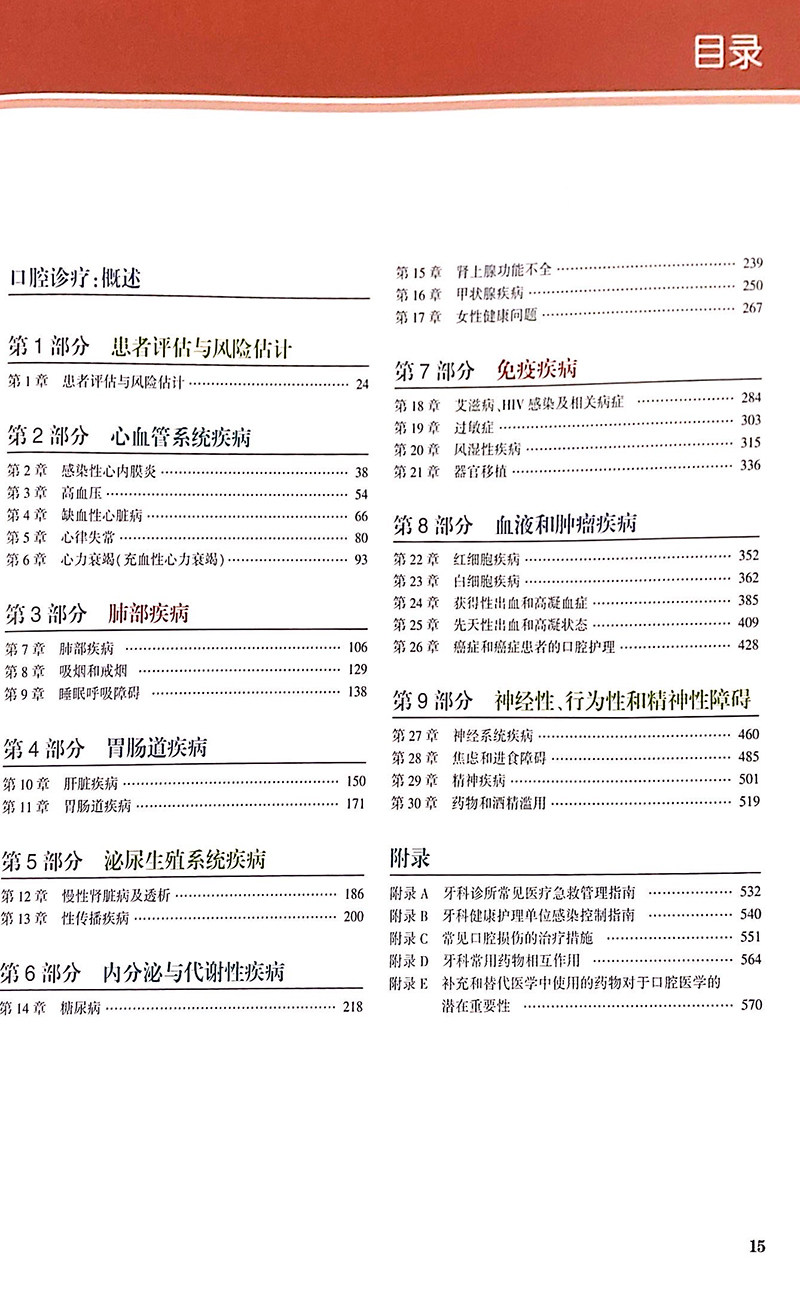 本书主要内容包括常见的全身系统疾病及特殊生理状态及其与口腔医学相关的一些临床表现,口腔诊疗中的特殊注意事项和风险防范,正确的诊疗原则等。这些内容的实用价值在于,就临床医生而言,可以正确识别病人的口腔疾患,分辨是否与全身疾病相关,有效、及时的提请口腔医生进行会诊;对于口腔医生而言,掌握这些知识,一方面可以通过口腔病症和表现首诊一些全身疾病,另外一方面可以为临床医生提请的会诊做出正确的应答和处置。同时,对于一些诊疗规范的正确解读,也有助于口腔医生在治疗有系统疾患的病人时,规避医疗风险,保障病人安全性。