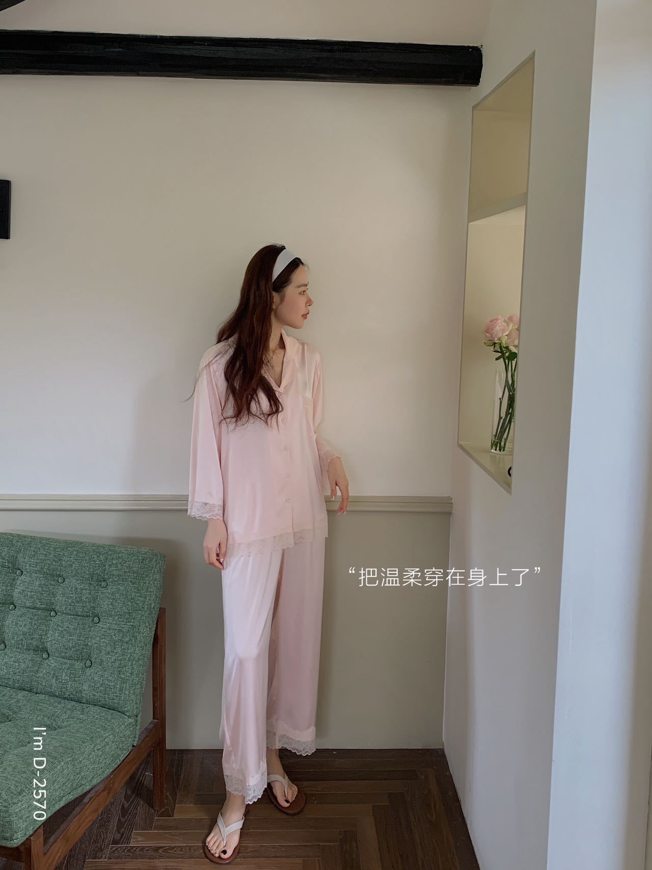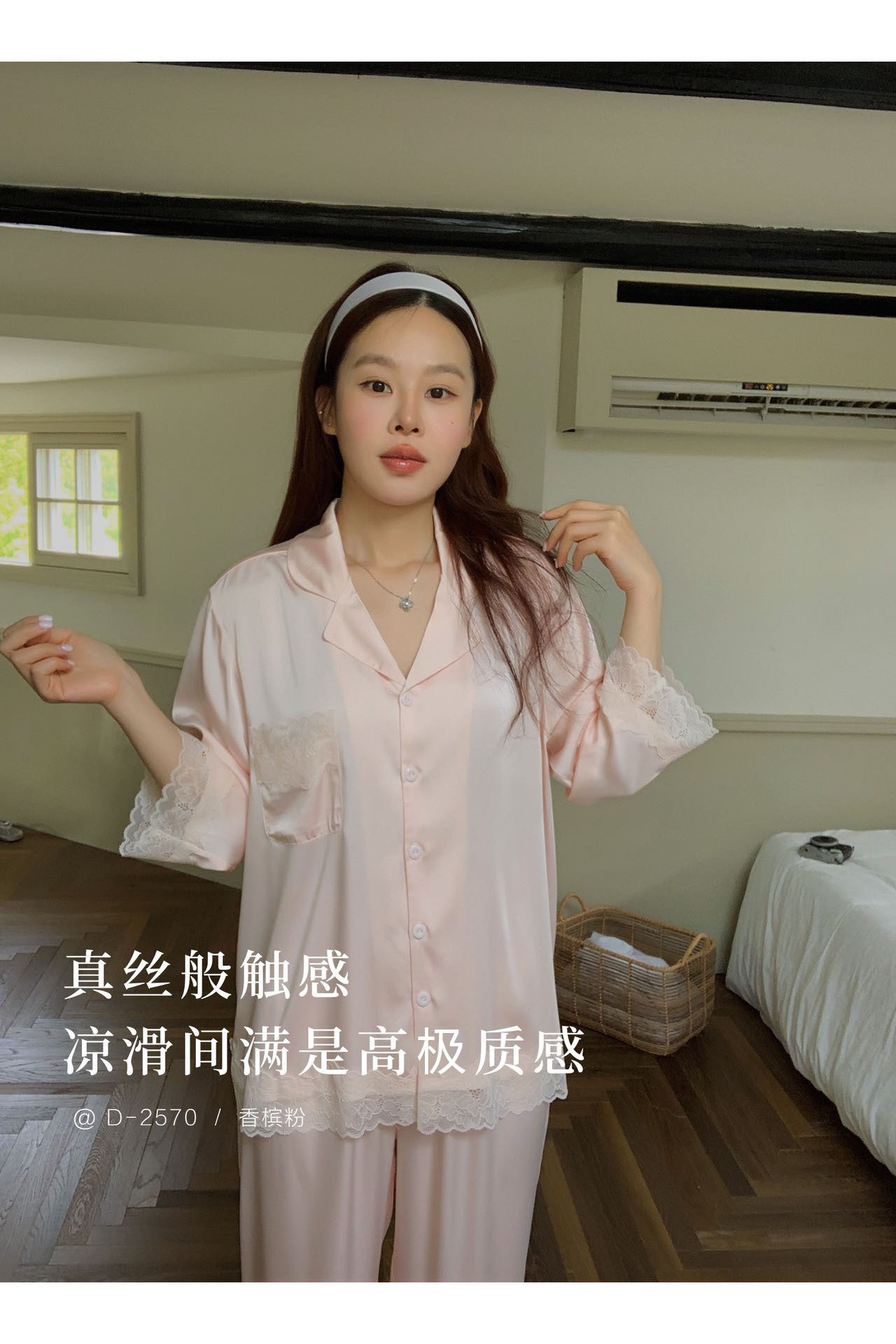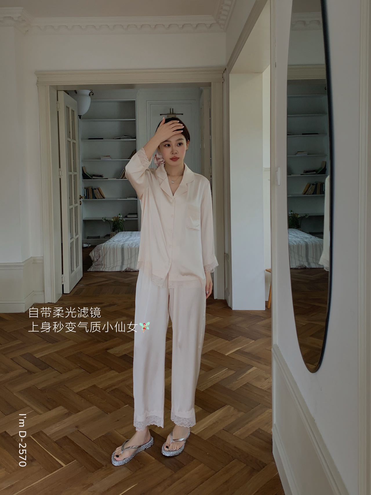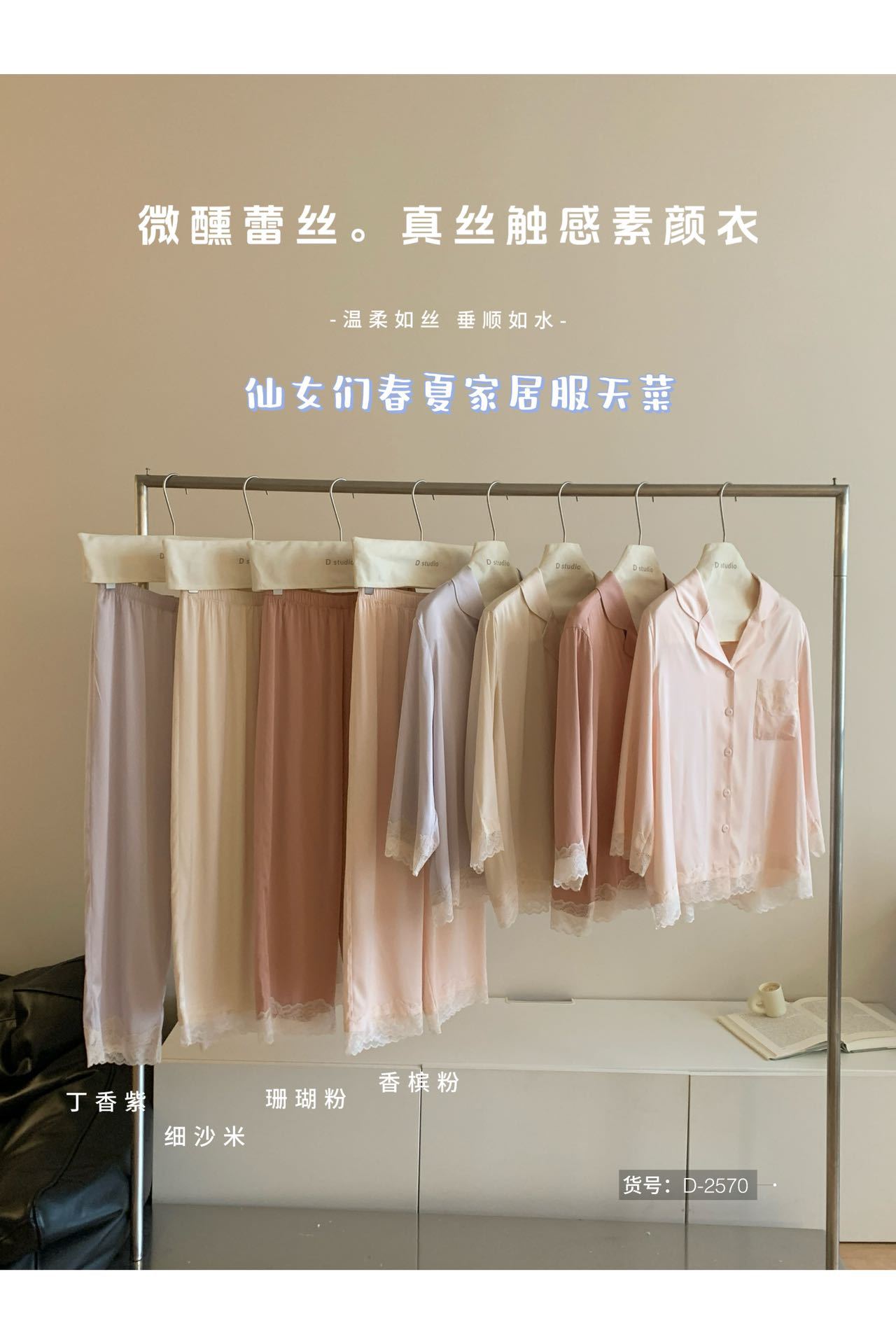 【柔滑垂顺舒适美貌 】2025新款微醺蕾丝仿真丝触感素颜衣长袖翻领家居服休闲两件套