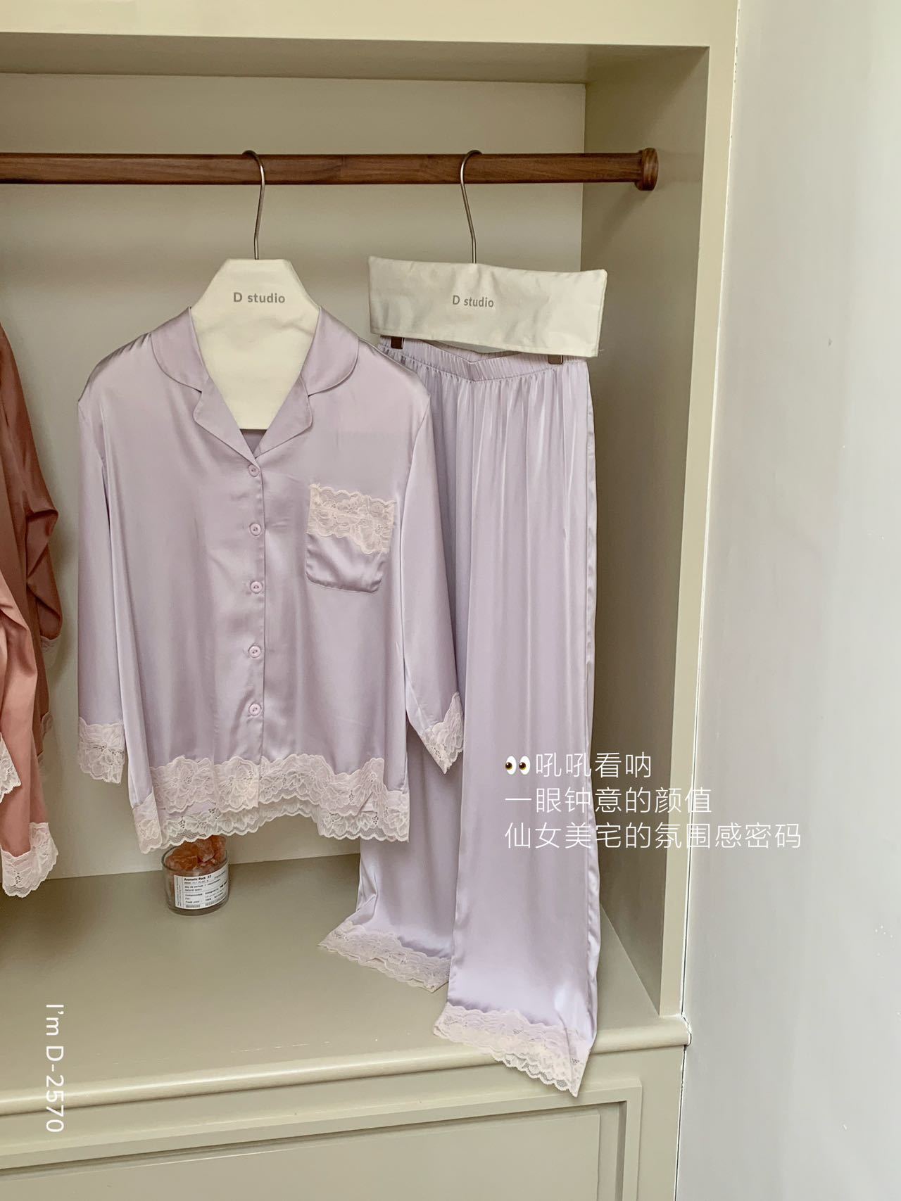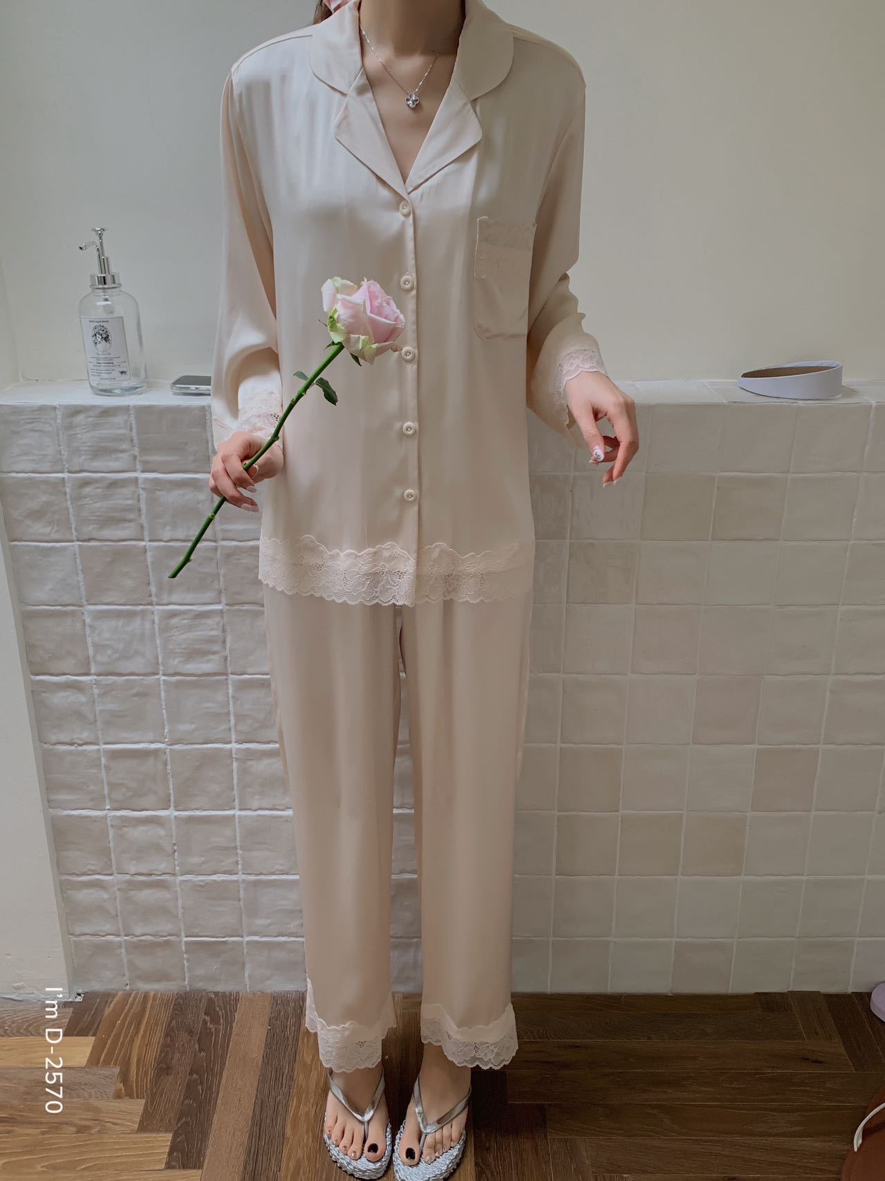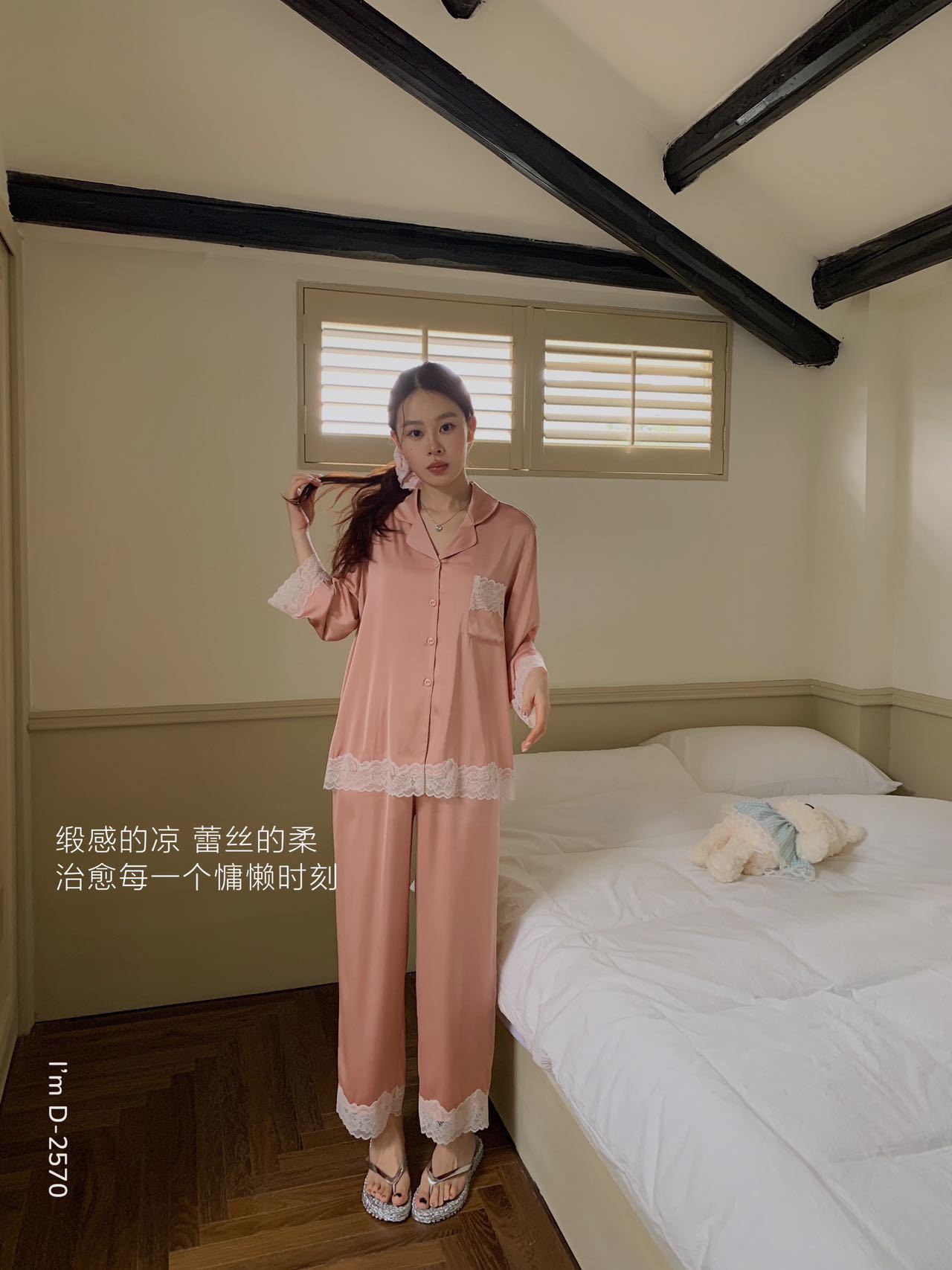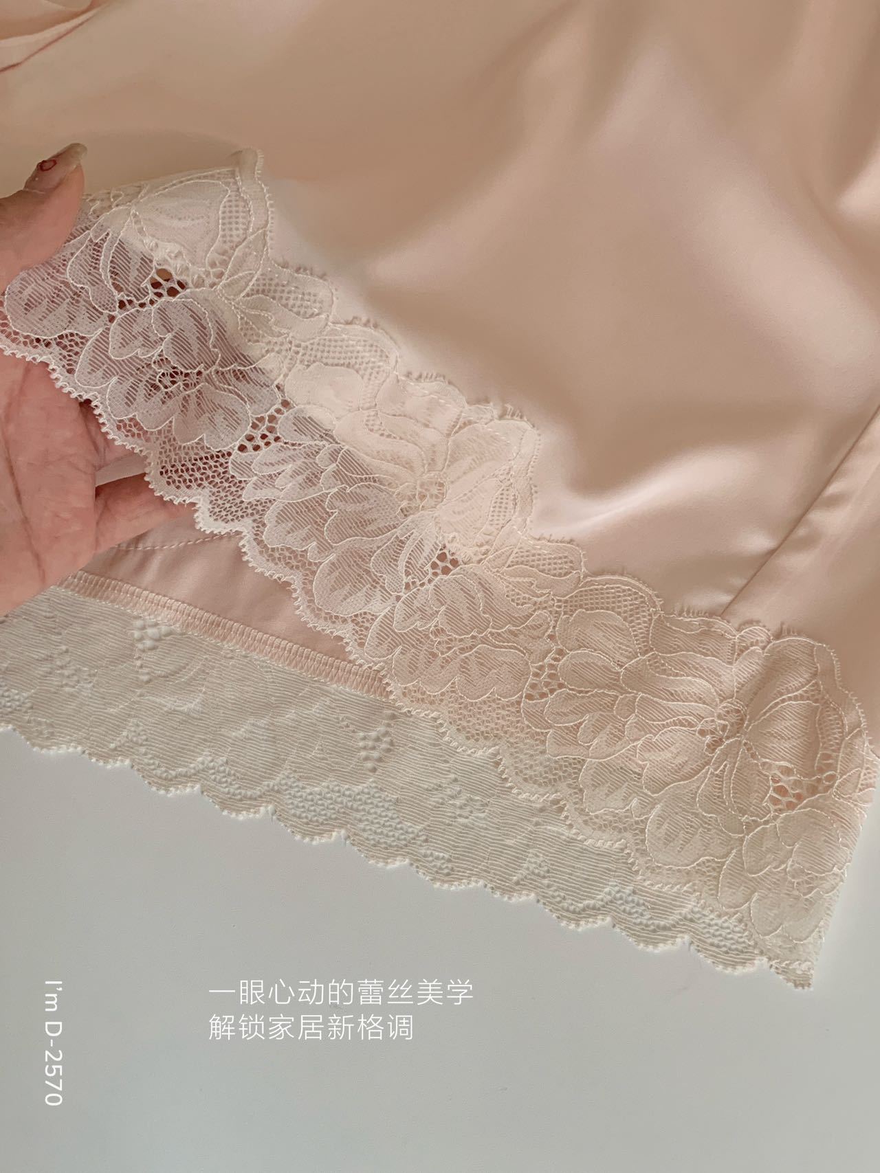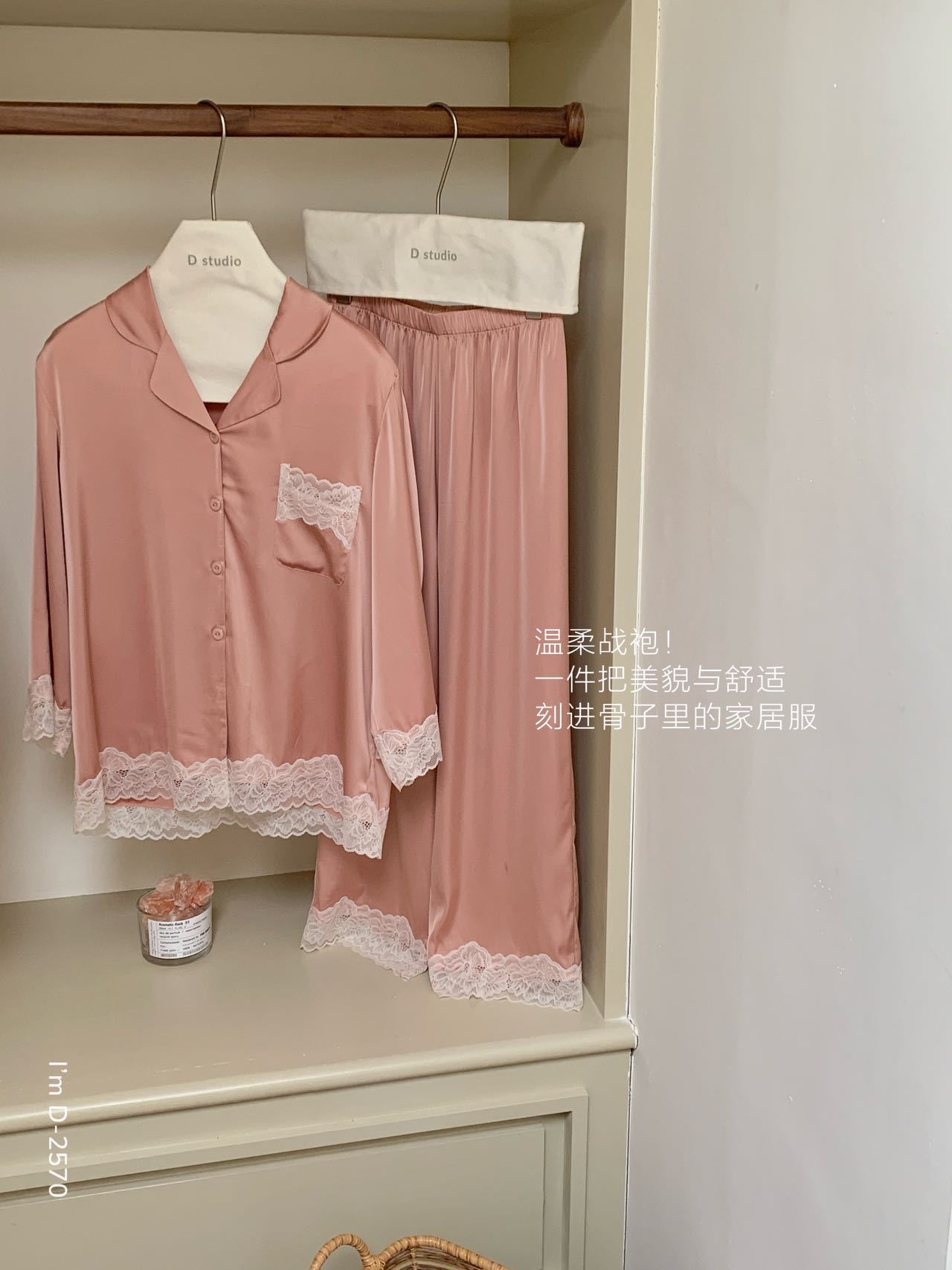 【柔滑垂顺舒适美貌 】2025新款微醺蕾丝仿真丝触感素颜衣长袖翻领家居服休闲两件套