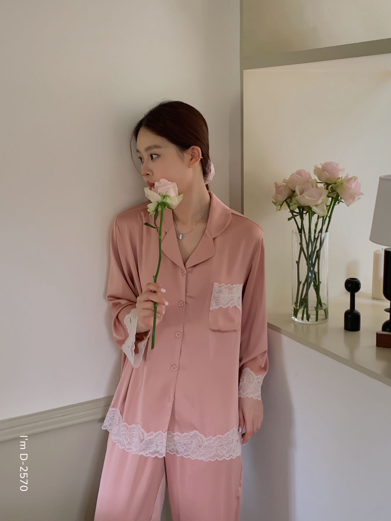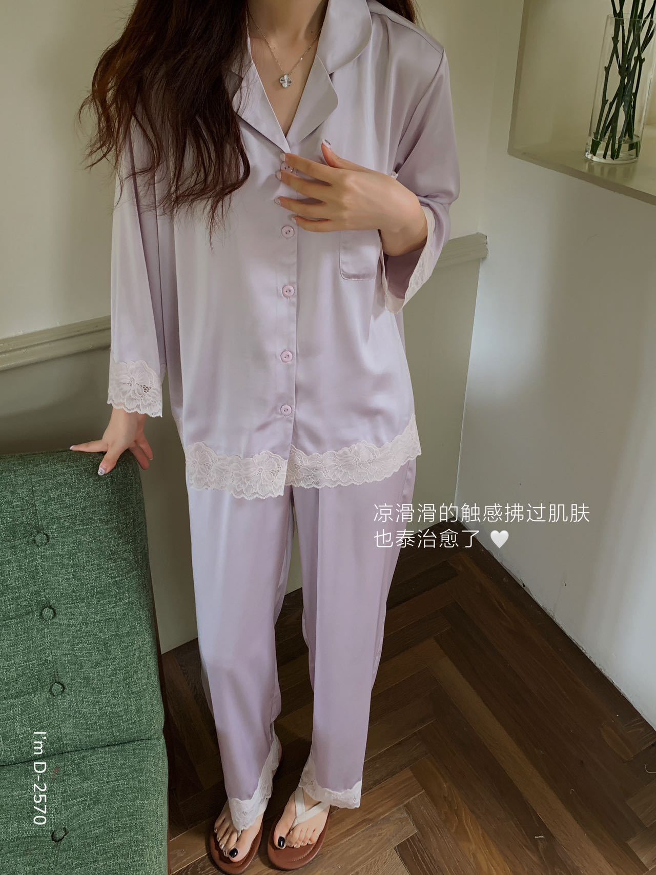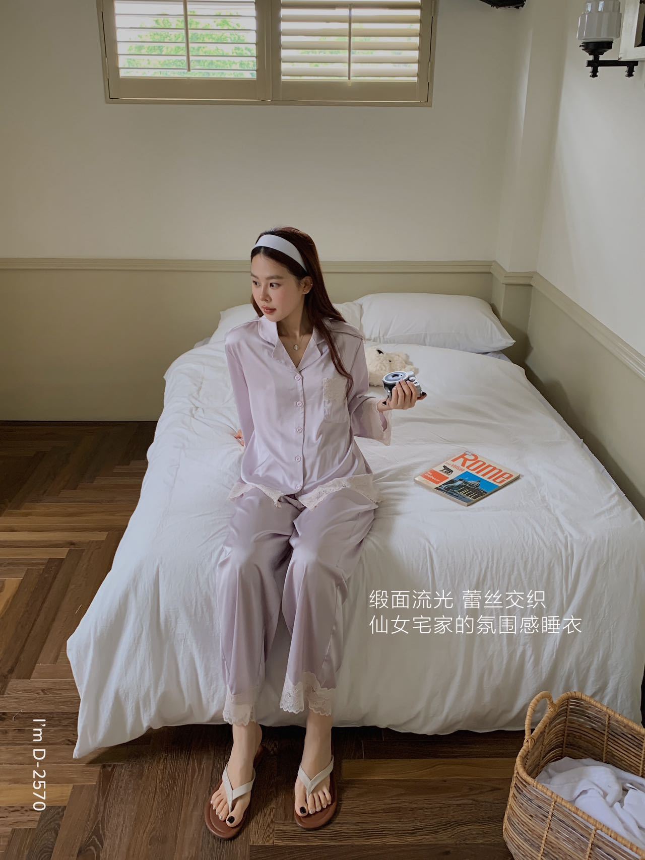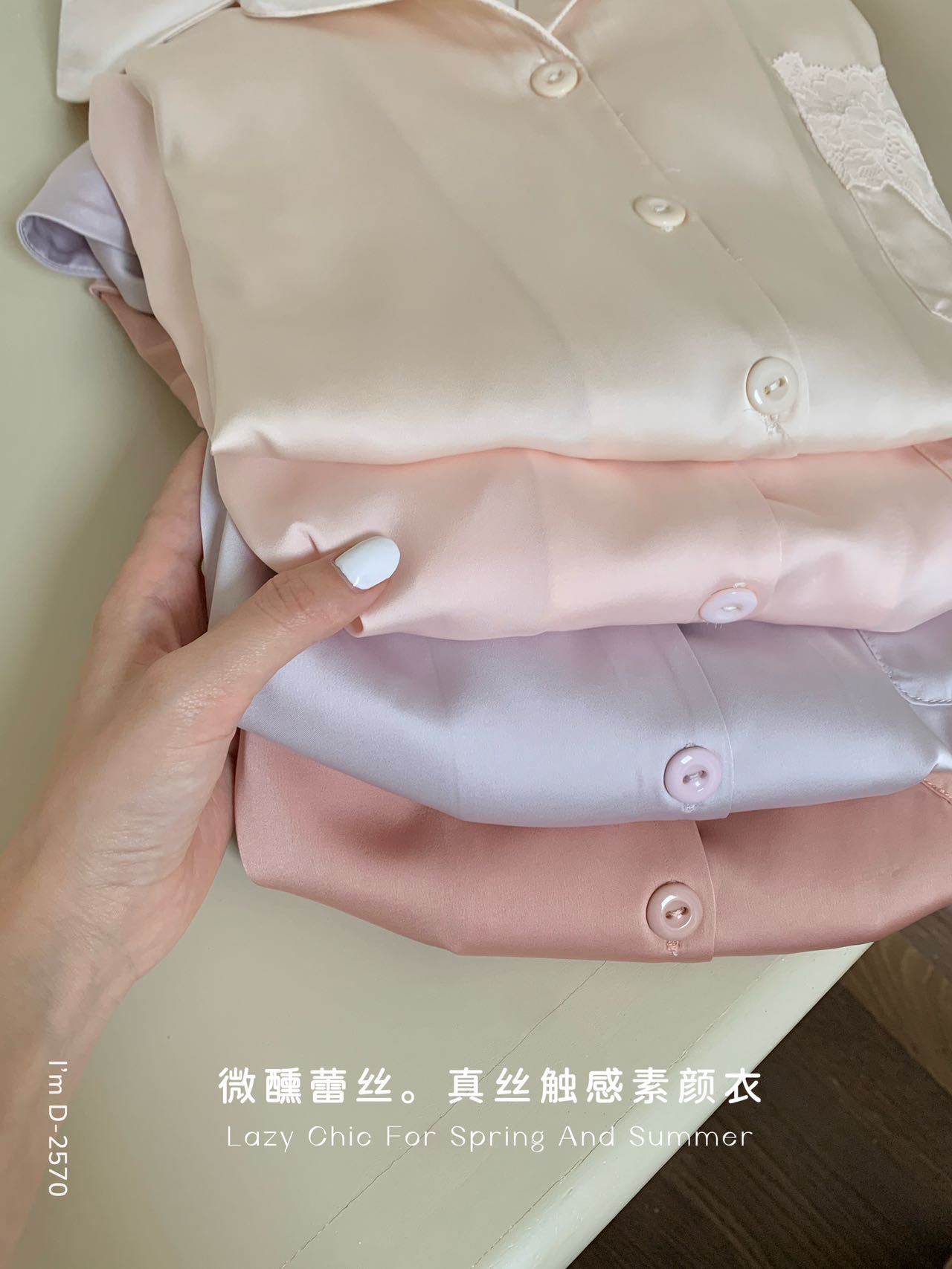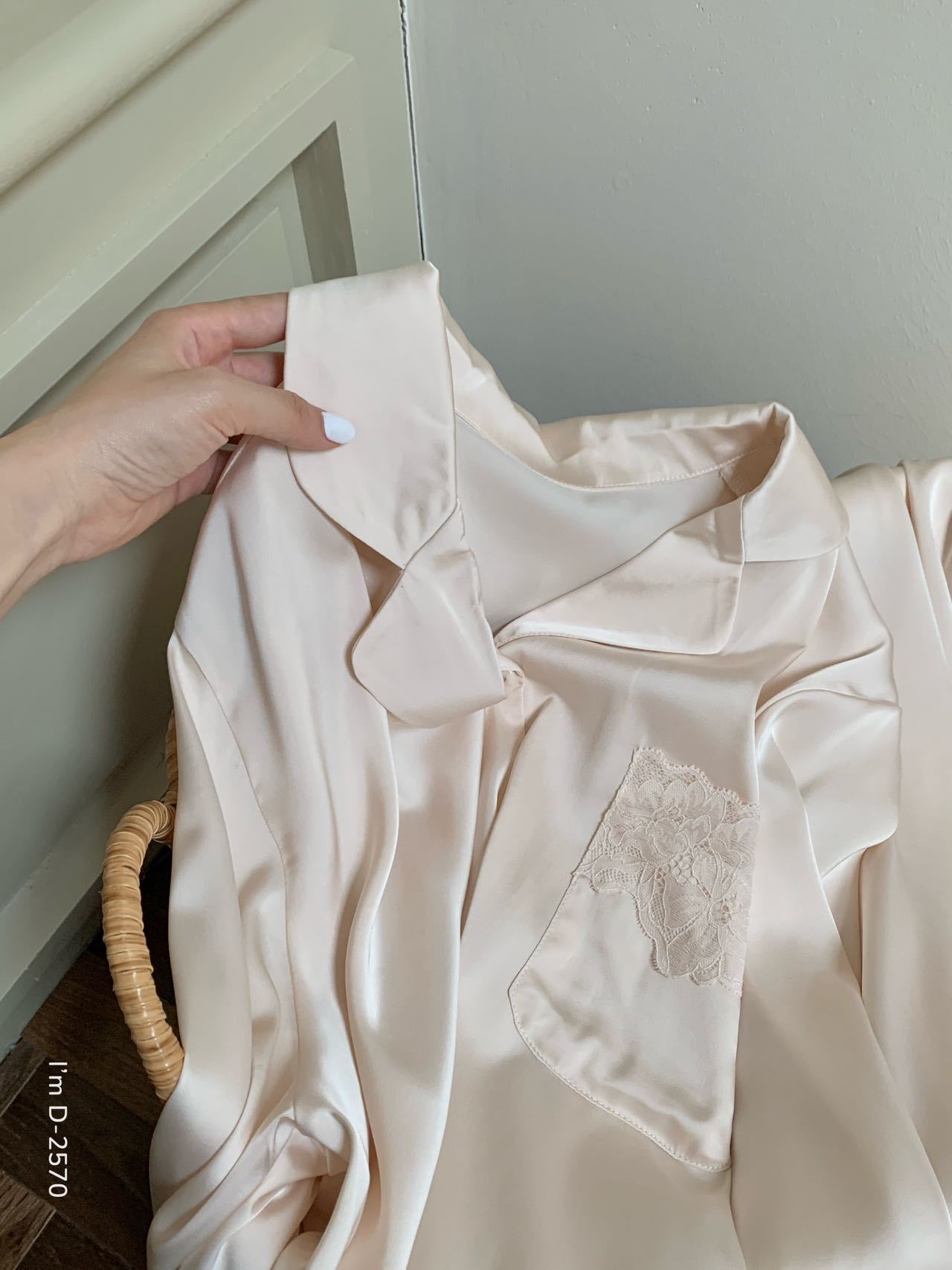 【柔滑垂顺舒适美貌 】2025新款微醺蕾丝仿真丝触感素颜衣长袖翻领家居服休闲两件套