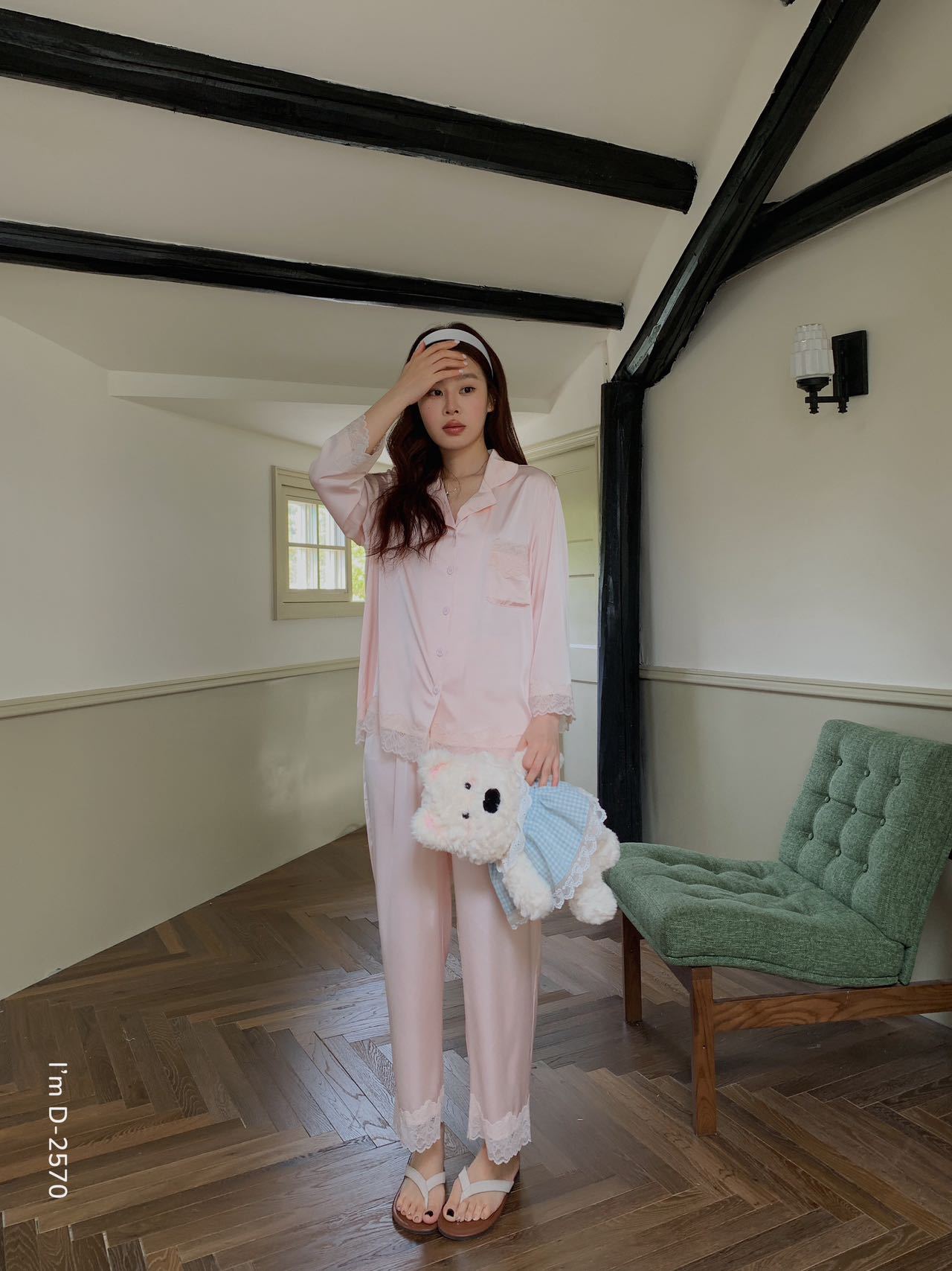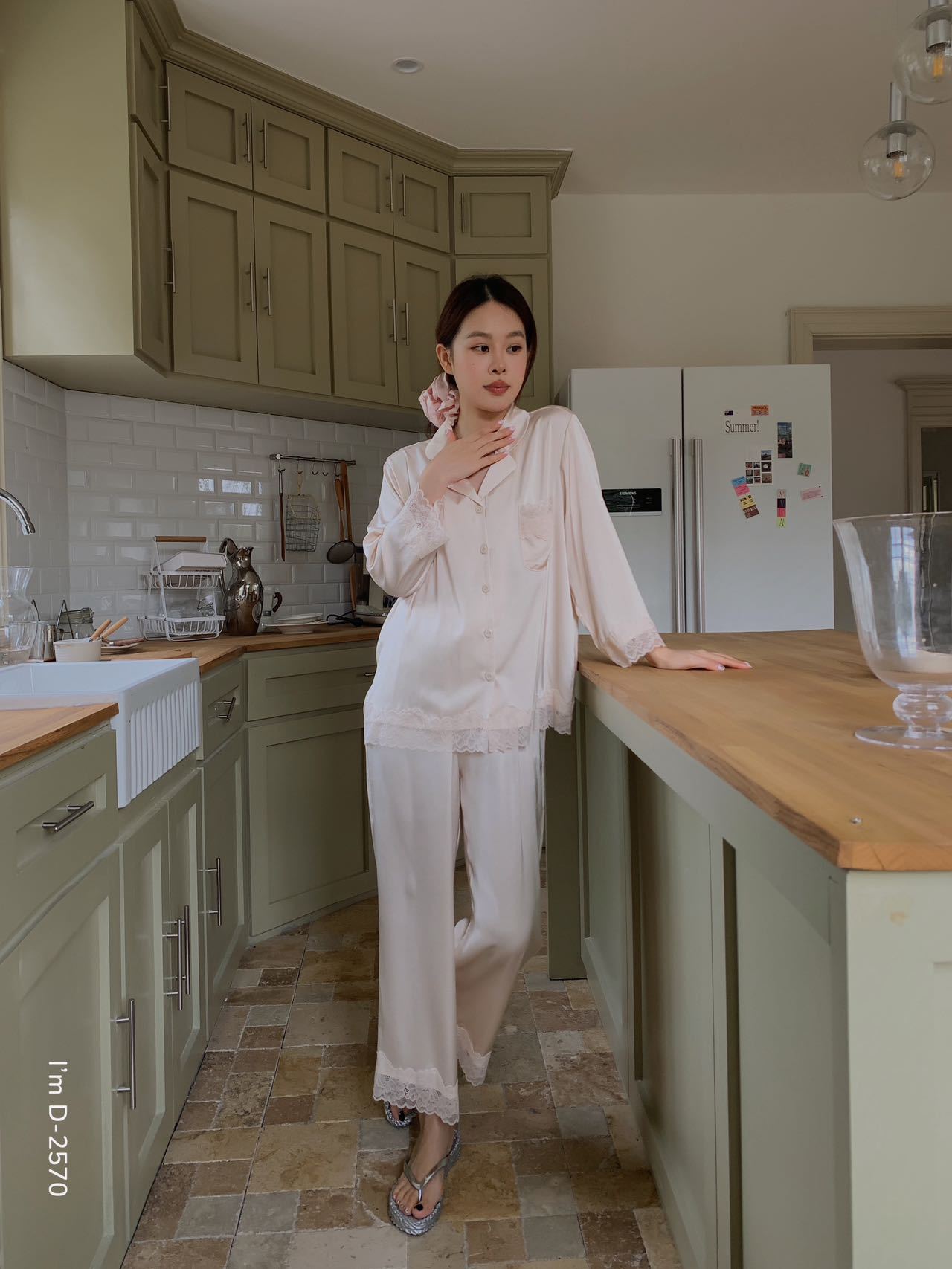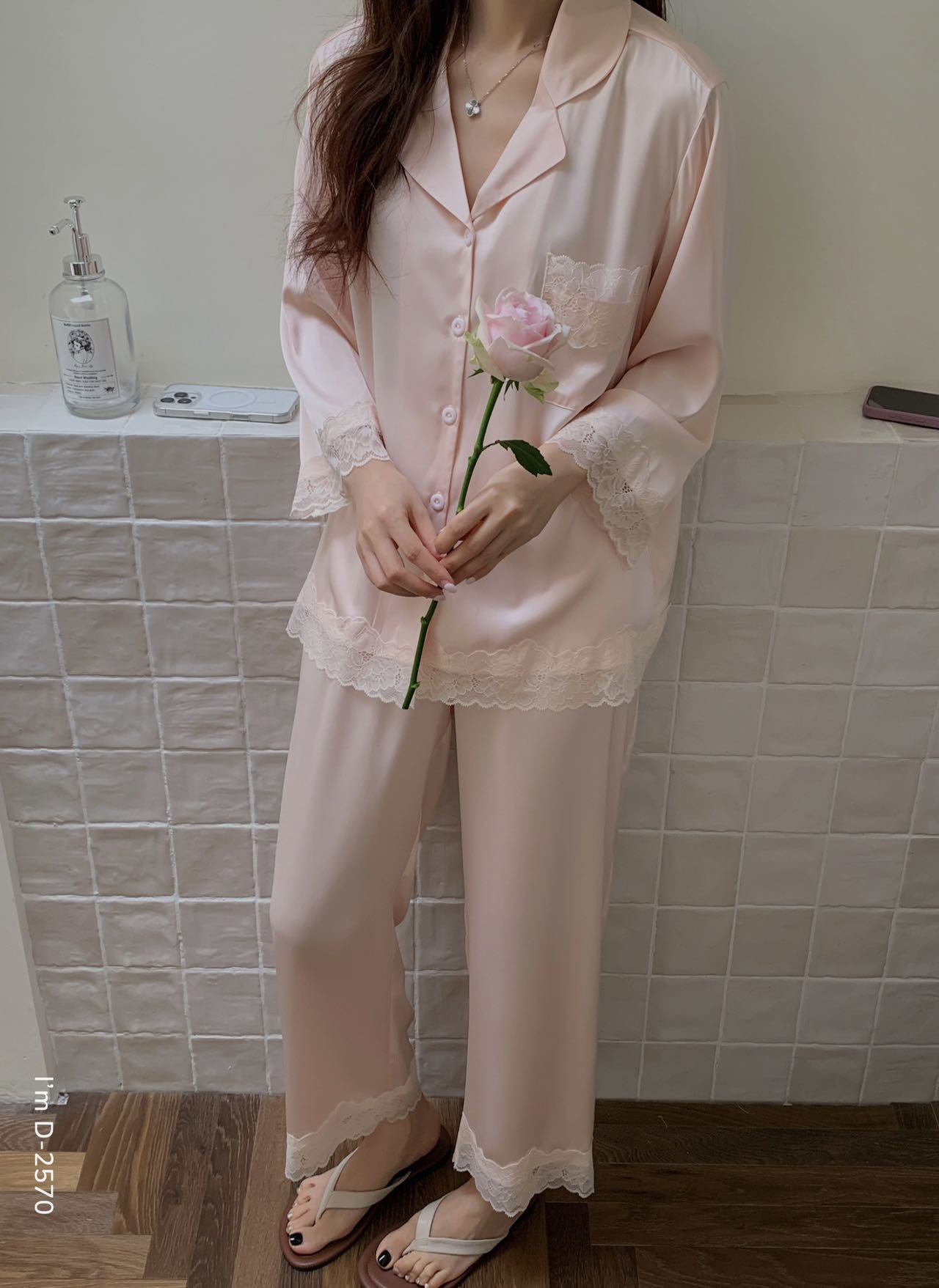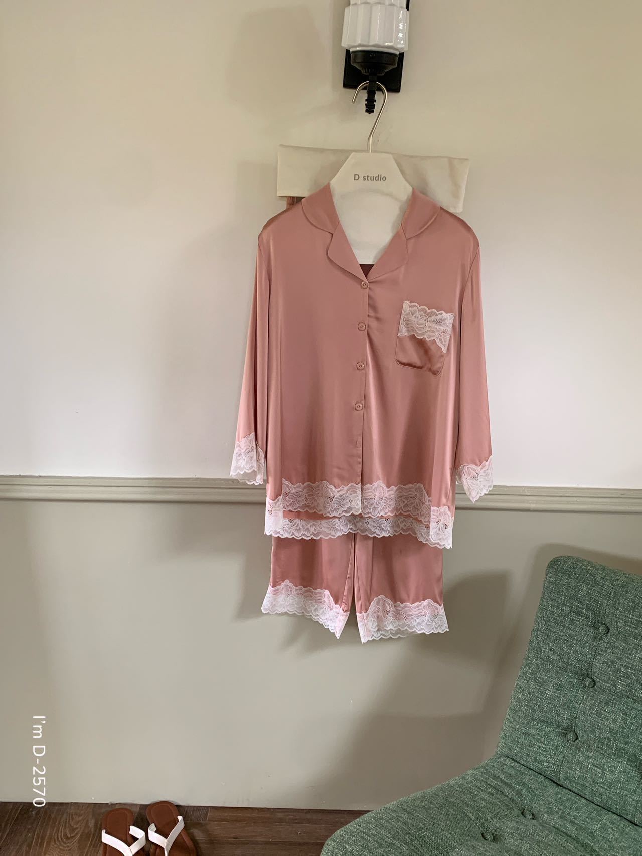 【柔滑垂顺舒适美貌 】2025新款微醺蕾丝仿真丝触感素颜衣长袖翻领家居服休闲两件套