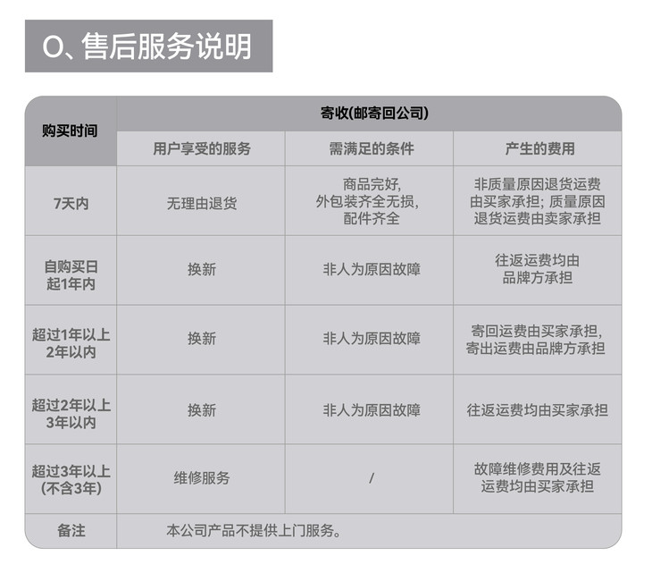 1、收到货后请勿随意丢弃包装,仅在包装完整寄回的情况下支持七天无理由退货;寄回时需保证商品完好,外包装齐全无损,配件齐全,非质量原因退货运费由买家承担;自购买日起3年内机器出现非人为原因故障免直接换新;3年后,收取维修费用提供维修服务。