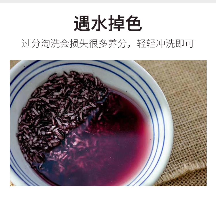 【温馨提示】紫米富含花青素,花青素是水溶性天然色素,遇水掉色,过分淘洗容易损失养分,不需要浸泡,轻轻冲洗即可。