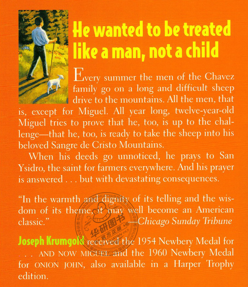 And Now Miguel《牧童历险记》是一个关于新墨西哥城牧羊人一家令人难忘和深深感动的故事,讲述了12岁的男孩米格尔渴望陪着家人和羊群在夏季放牧,以及想要被认可为一个独立个体的愿望。本书荣获纽伯瑞金奖作品,一经出版便深受读者的喜爱。