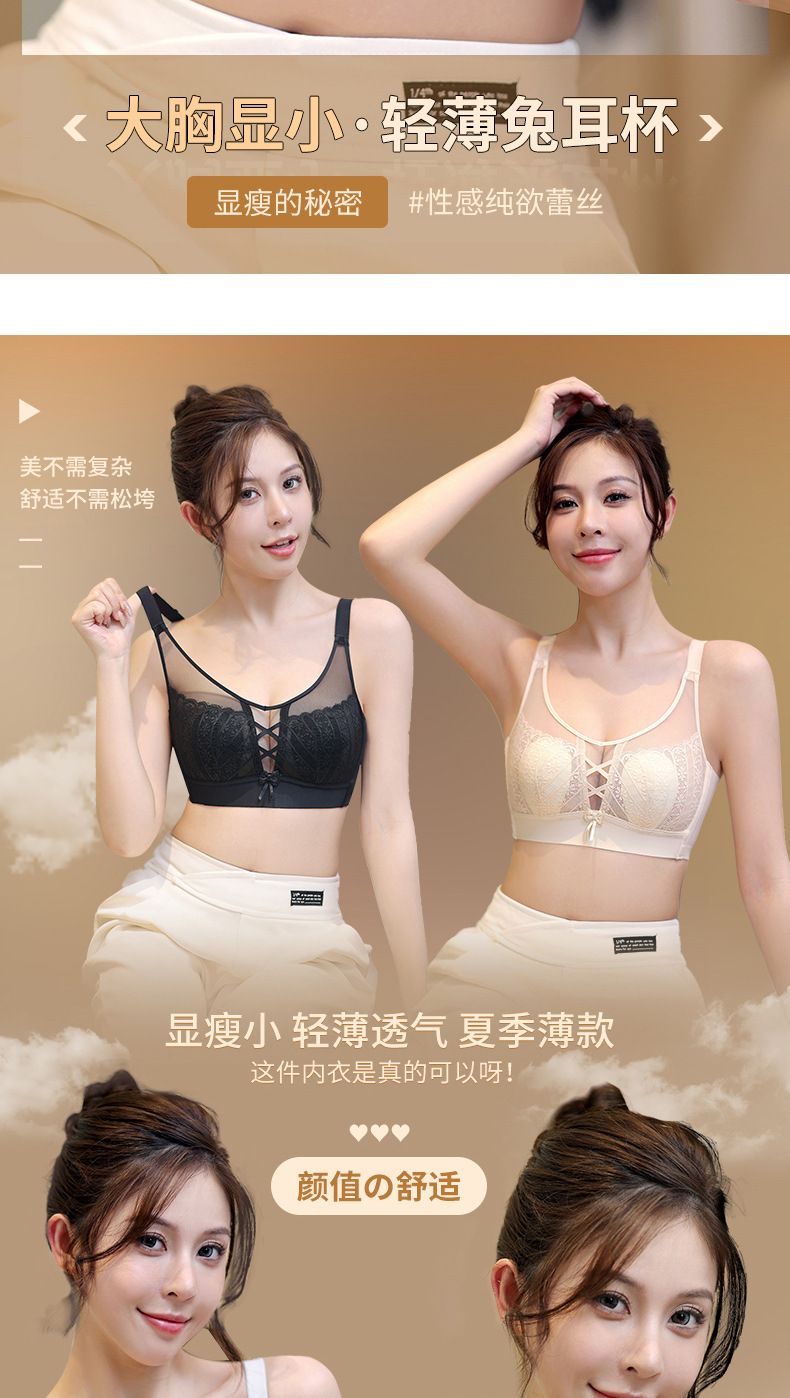 【2件更值❗轻薄兔耳杯内衣】超薄内衣女大胸显小,显瘦的秘密稳固承托胸部,防凸点防下垂轻柔托起,显瘦无钢圈收副乳防下垂性感聚拢全罩杯文胸罩QQ