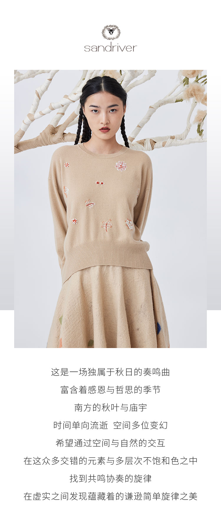 历年在巴黎时装周亮相,享誉世界的艺术羊绒品牌[Sandriver 沙涓]由羊绒布道者郭秀玲女士创立。阿拉善自有牧场纯种羔羊绒,日本国宝设计师小筱顺子,上海自有基地精工细作。承载羊绒情怀,坚持匠人品质。