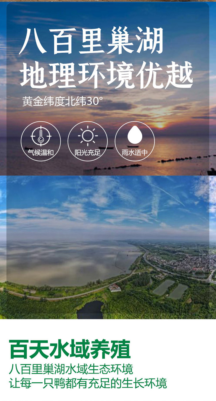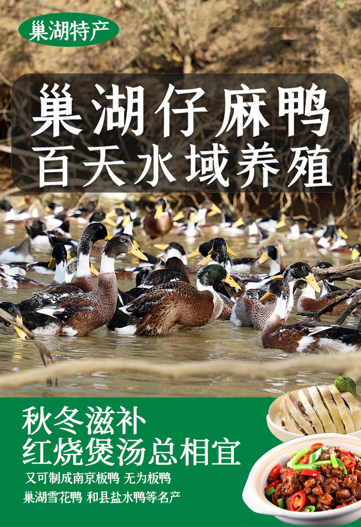 巢湖的麻鸭,是我国少有的地理标志保育品种,它介于家鸭和野鸭之间,以水生动植物为食,善于捕食螺、虾、昆虫,在自然环境下成长。为了保证巢湖麻鸭的品质和食用安全,过程中坚持有机养殖和福利养殖原则,拒绝使用抗生素、生长激素和违禁药品,自然散养70-100天,让鸭子能够在自然环境中健康成长。巢湖麻鸭的饲养过程也经过8大环节的处理,每天现杀速冻,通过真空包装,保持肉质细腻,并且检疫合格,确保不含抗生素、激素和重金属残留才能出厂,食用更安心!