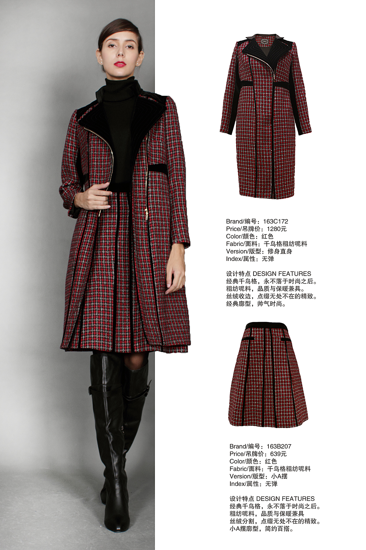 面料:千鸟格粗纺呢料 版型:修身直身 属性:无弹