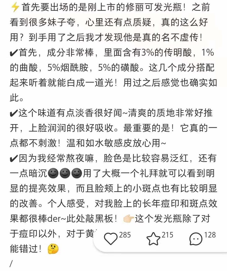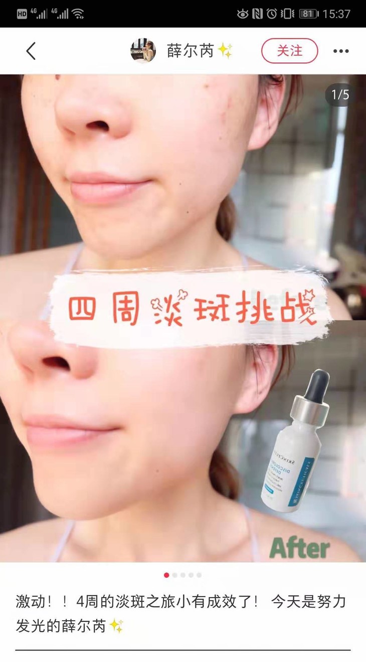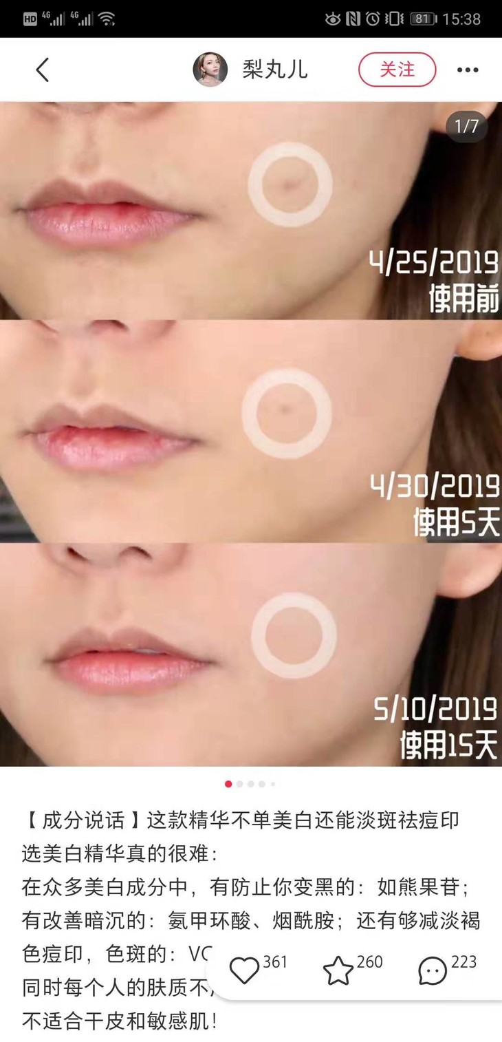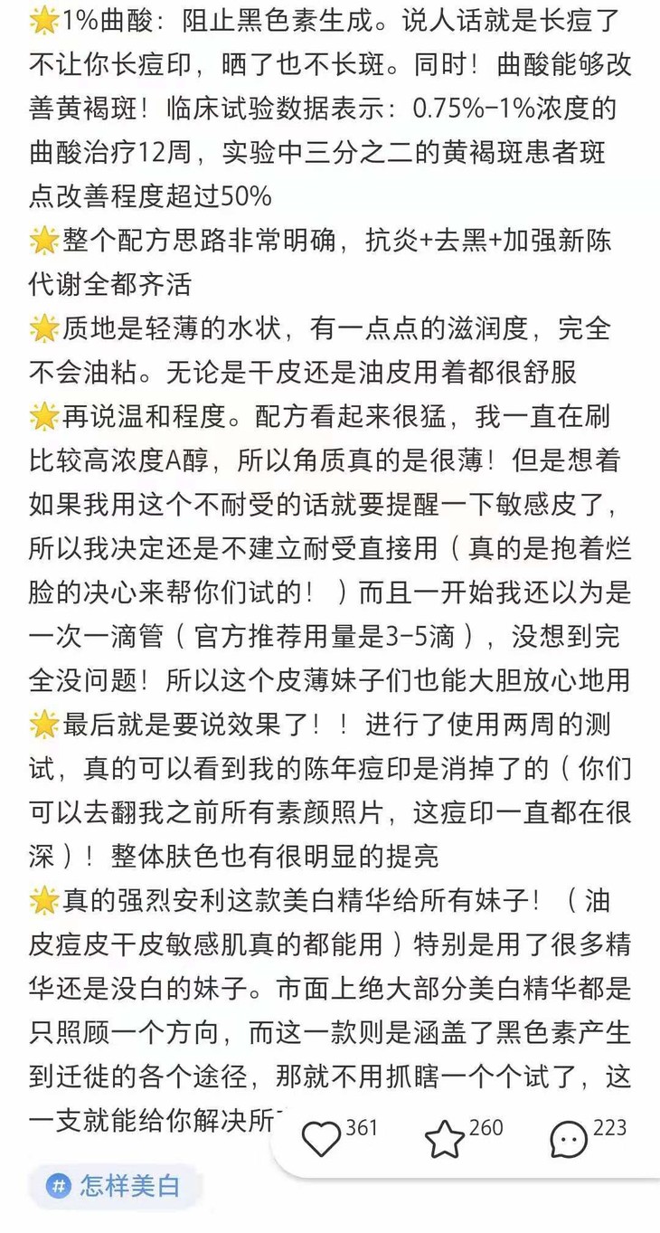 这款我要推荐给想去痘印和斑斑点点的小仙女,真的,完全不输小灯泡的存在,每次3-5滴,在爽肤水后用,全脸涂完之后在斑点痘印的位置着重按摩一下,效果更棒!