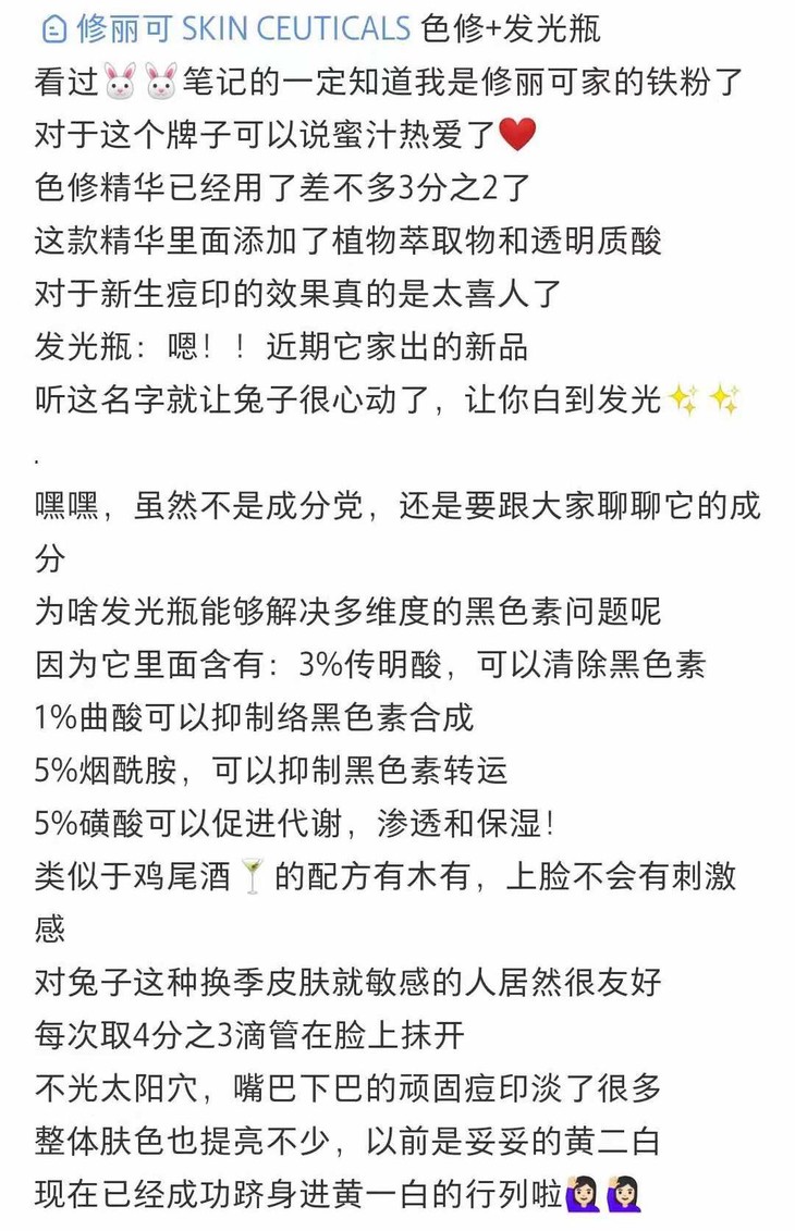 跟其他精华一样,包装还是沿袭了修丽可的冷淡简约风,它的亮点在于鸡尾酒式配方,用了好几种专业抗hei的成分来让肌肤“发光”。5%烟酰胺、3%传明酸、5%磺酸和1%曲酸,四重媄白成分,光听着就感觉,恩,很白。通过黄金配比,能够有效yi制黑色素,清chu黑色素,快速达到媄白的效果。