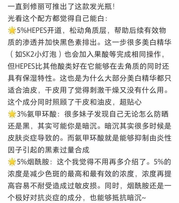主要成分:传明酸、烟酰胺、曲酸、磺酸、氨甲环酸、羥乙基哌嗪乙烷磺酸等