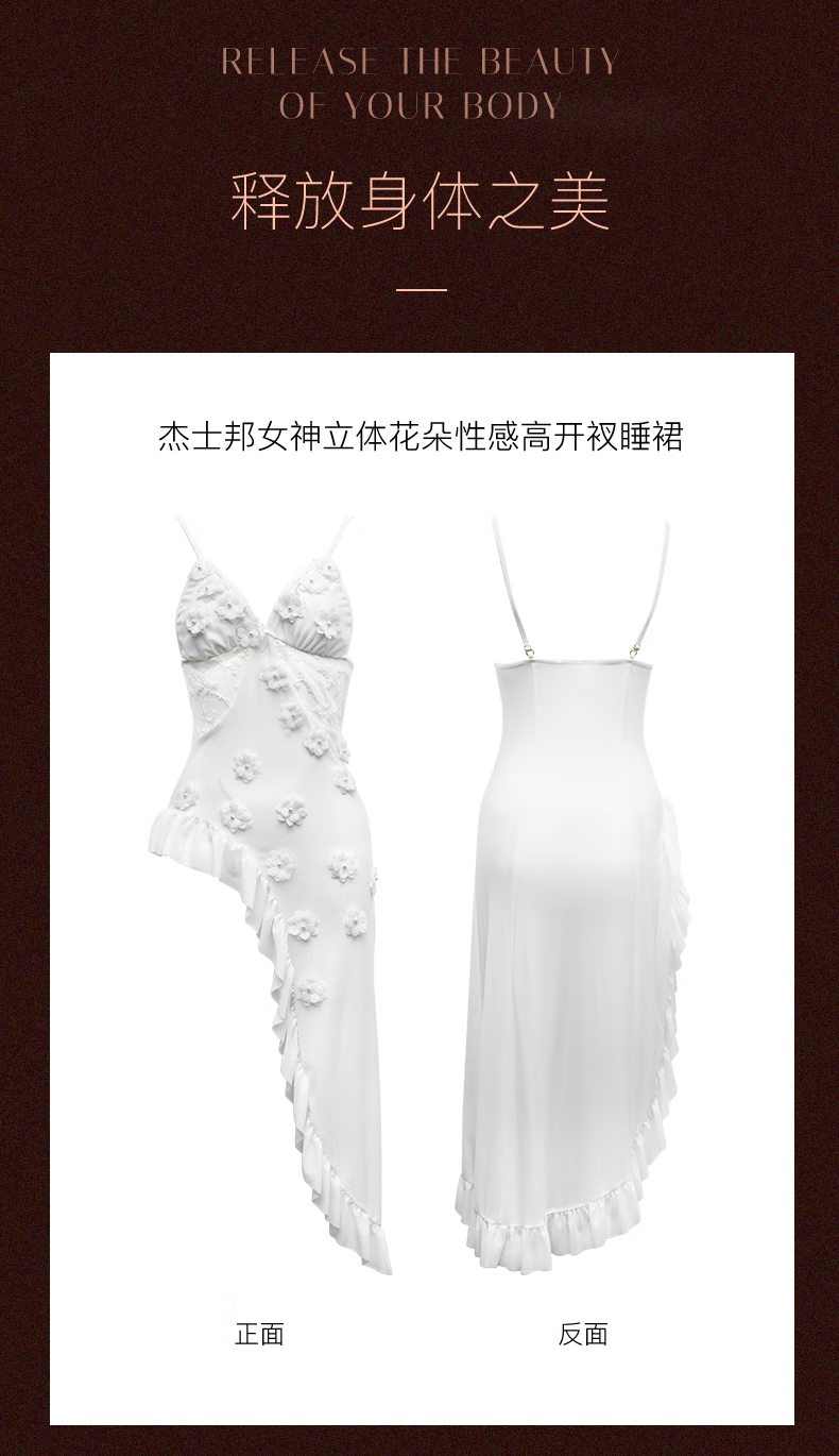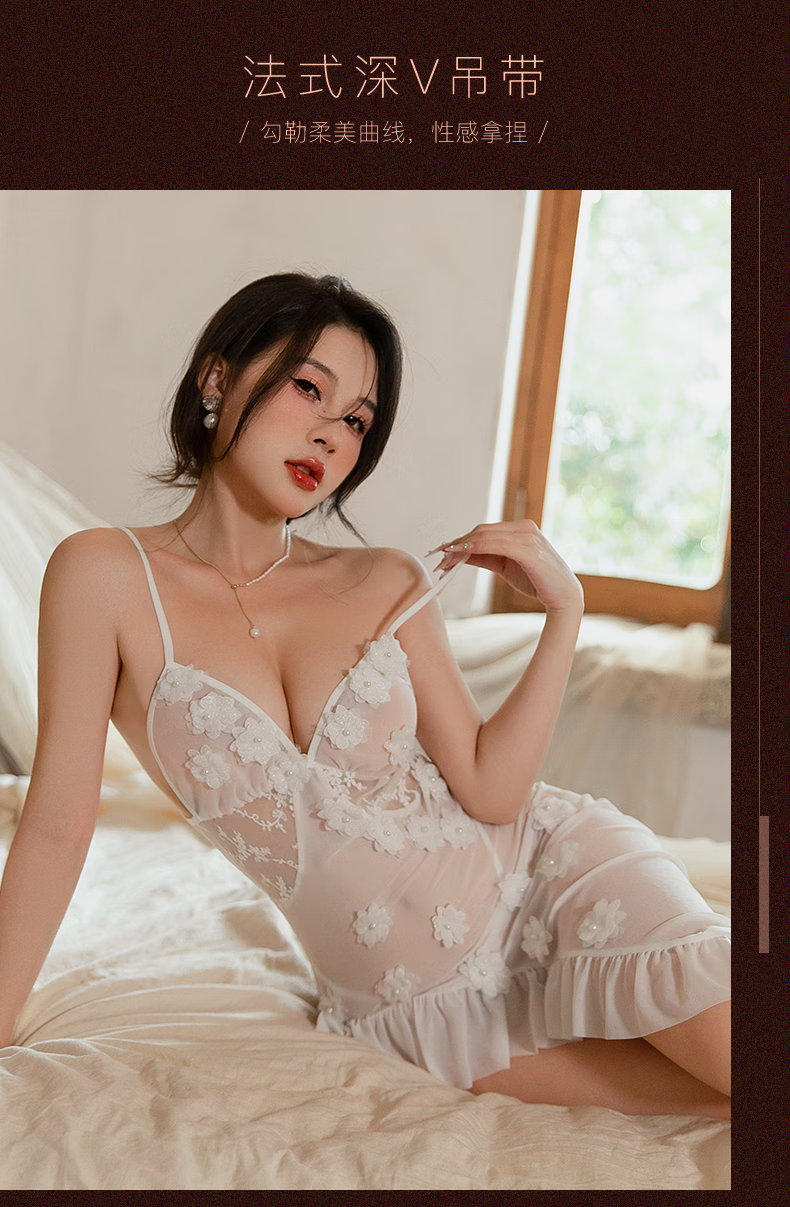【透视薄纱 深V吊带】杰士邦女神立体花朵性感高开衩睡裙