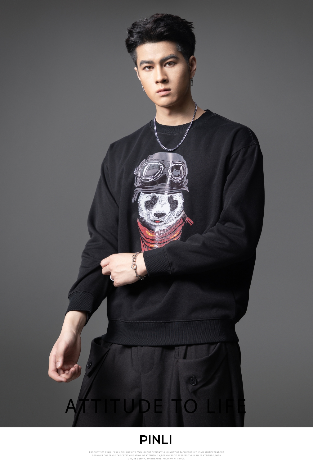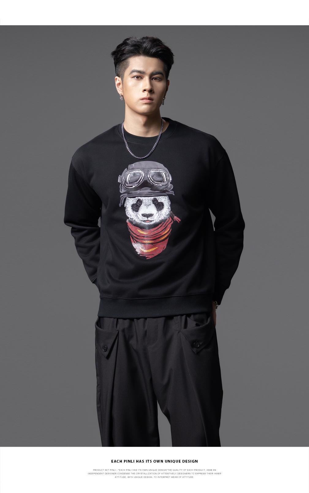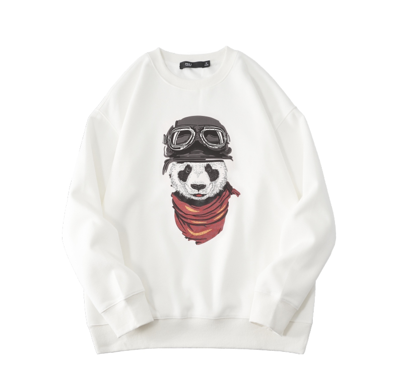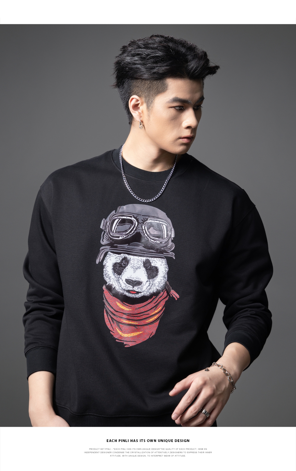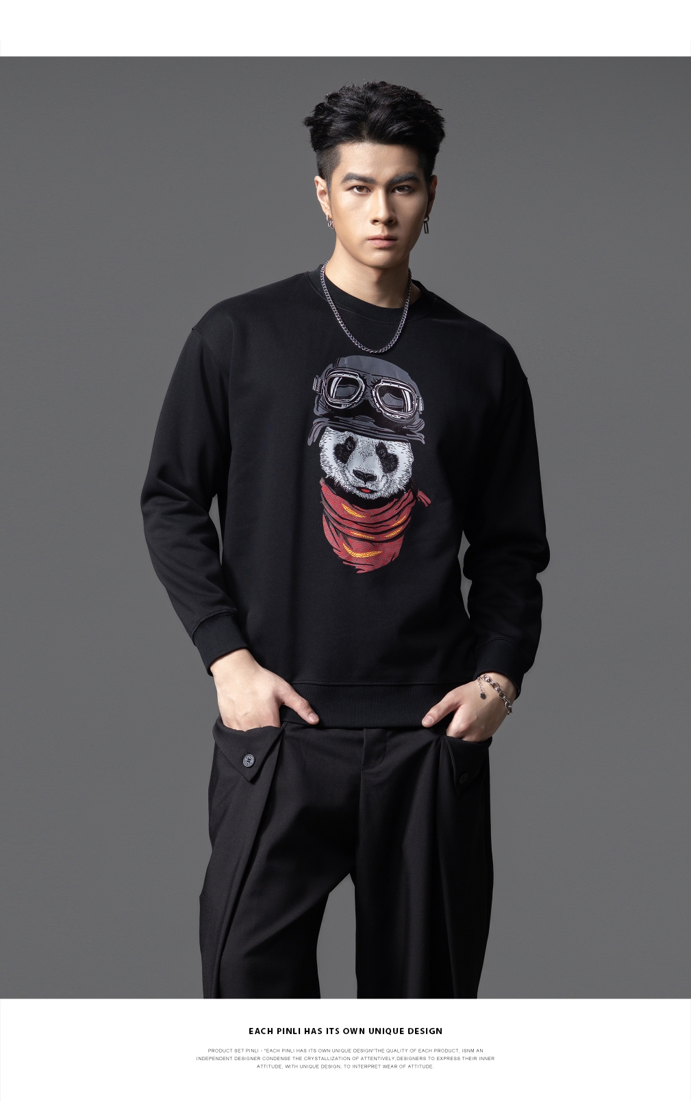 PINLI品立2025秋季新款印花熊猫套头卫衣男士潮牌落肩袖圆领上衣BG253109008