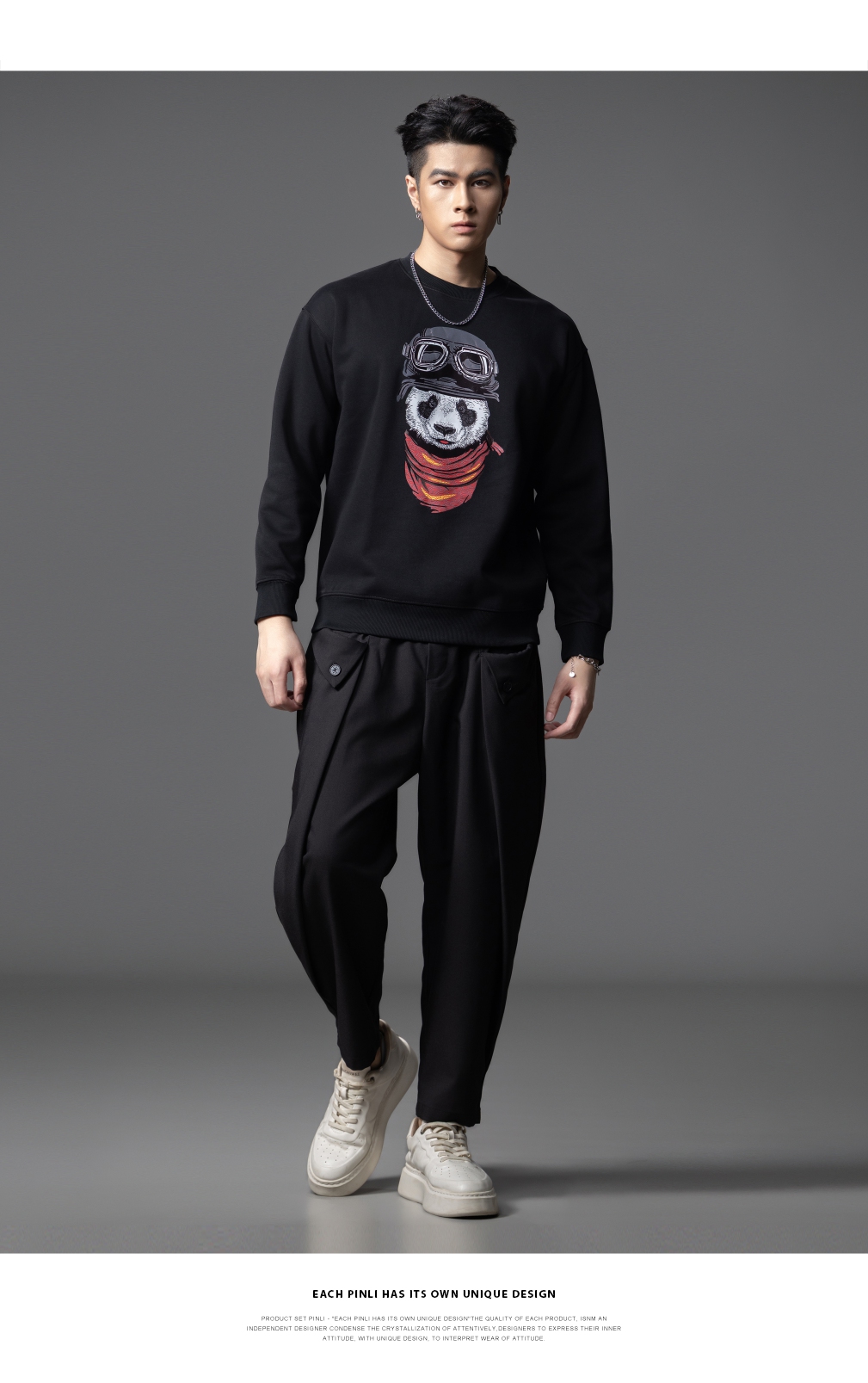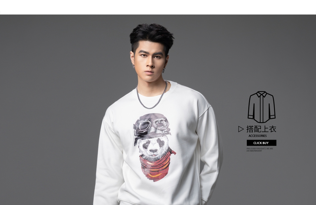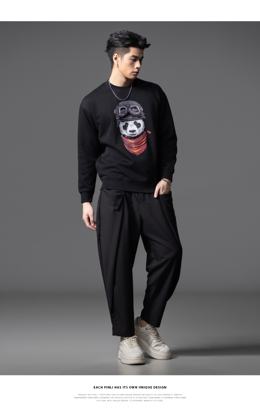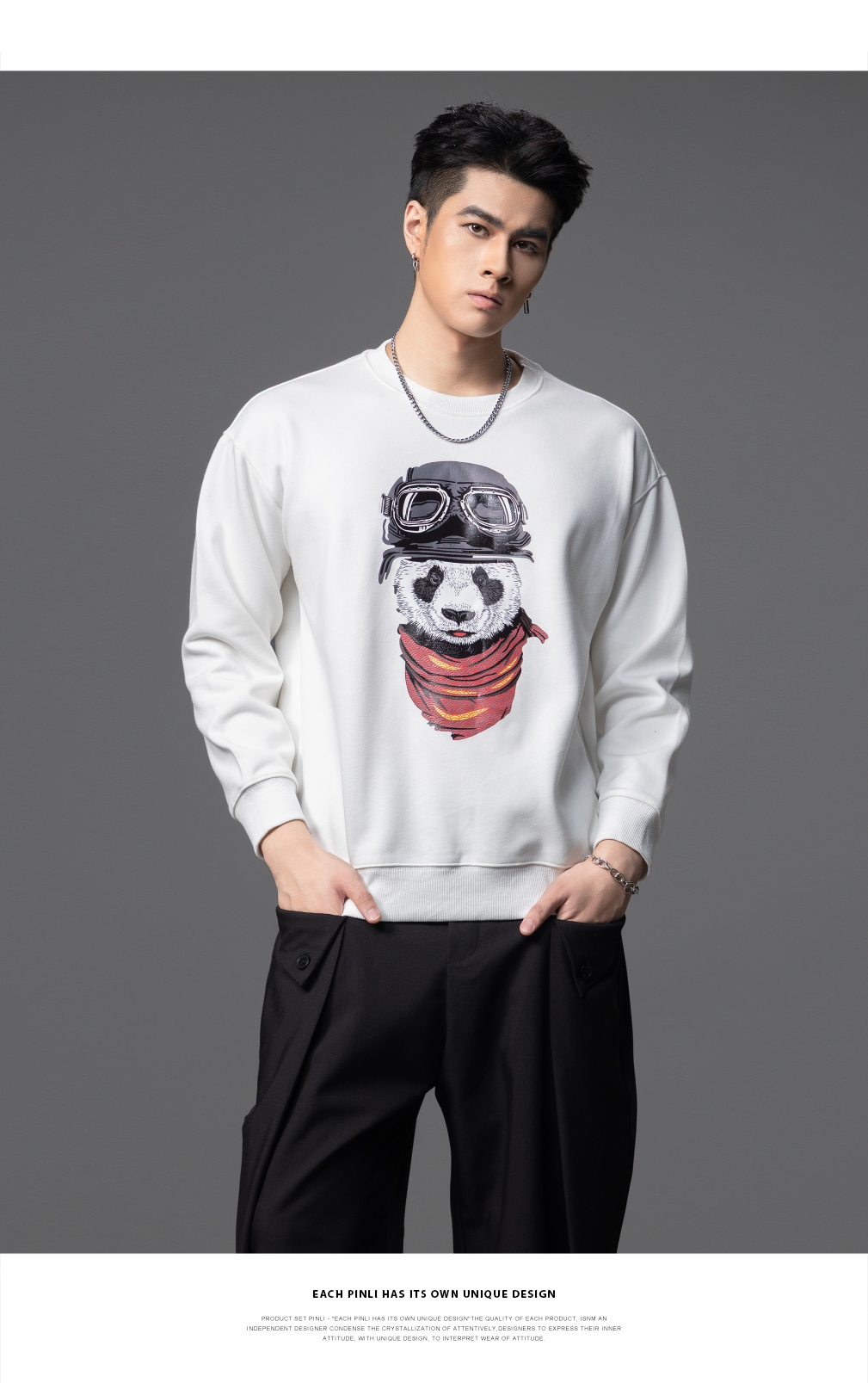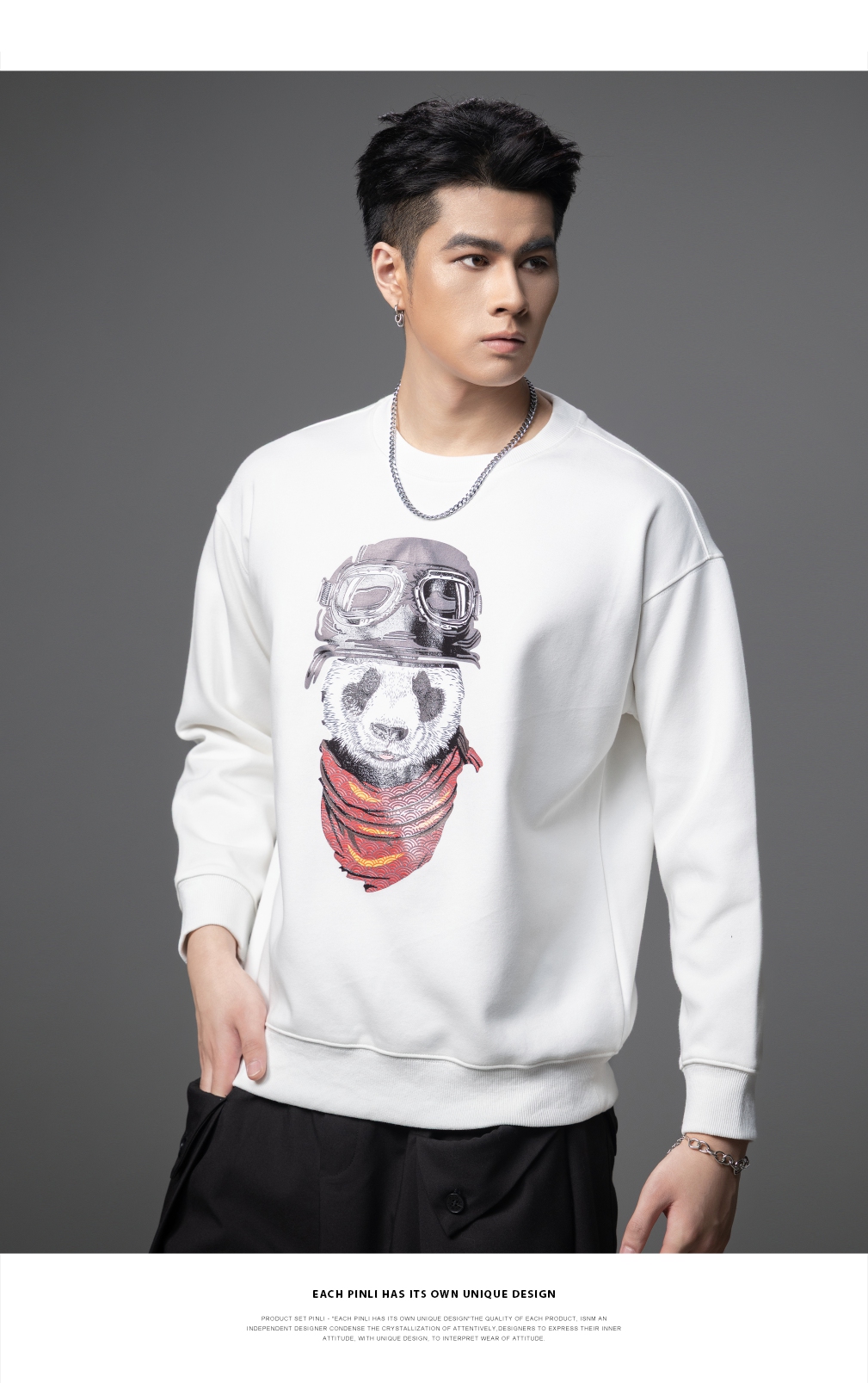 PINLI品立2025秋季新款印花熊猫套头卫衣男士潮牌落肩袖圆领上衣BG253109008