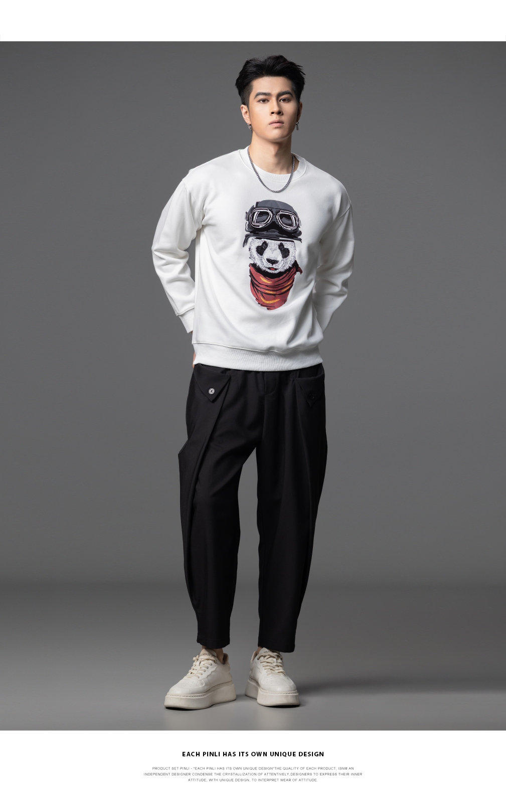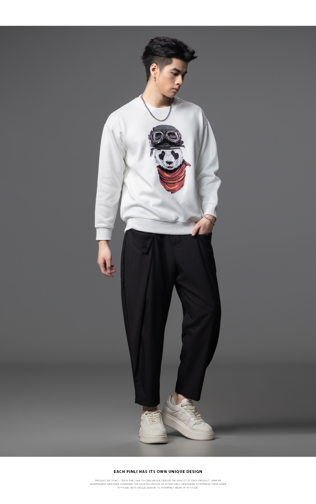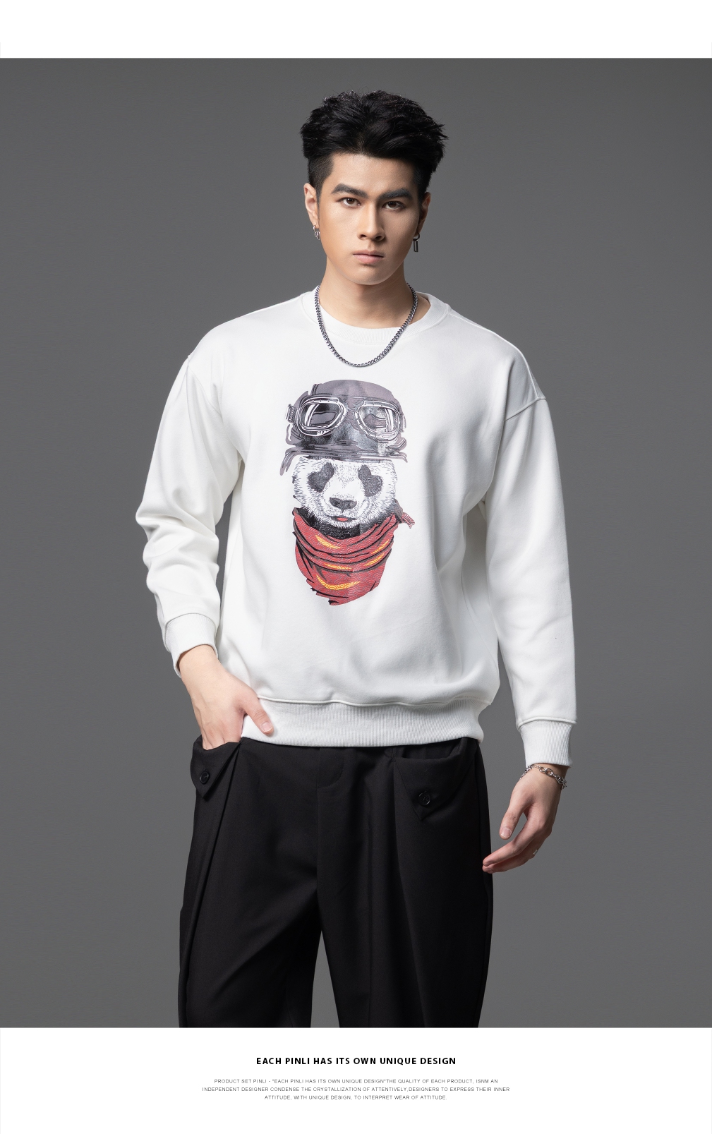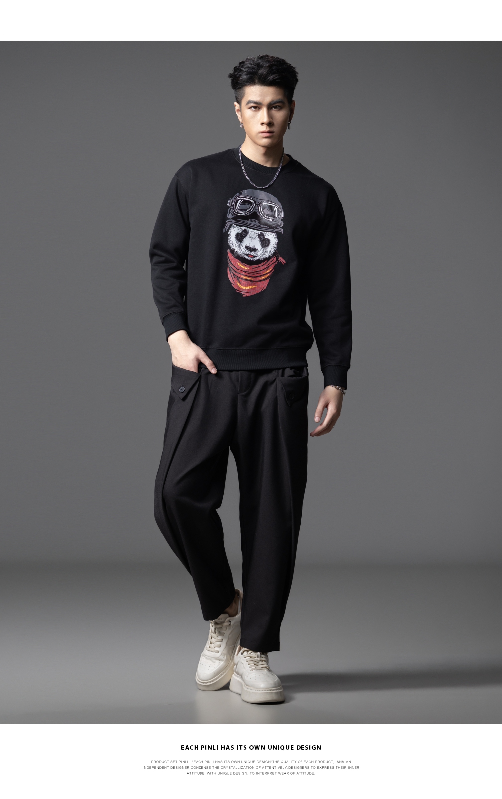 PINLI品立2025秋季新款印花熊猫套头卫衣男士潮牌落肩袖圆领上衣BG253109008