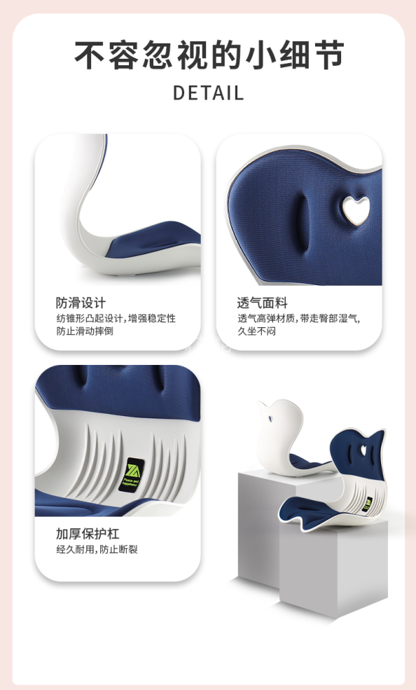 【使用方法】将身体挺直,尽量把臀部向后坐,贴合坐垫曲线