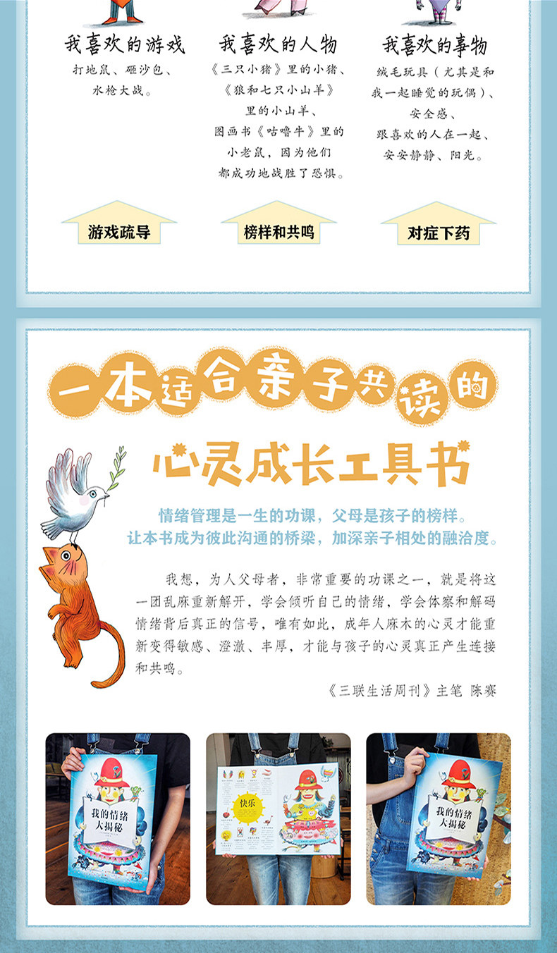 对一个小孩而言,识别情绪、应对压力的能力并不是与生俱来的,而是必须经历日常生活的种种锤炼才能习得。就锤炼这种技能而言,《我的情绪大揭秘》是一本很好的工具书。它以一种简洁、幽默、充满童趣的方式教孩子认识人类最基本的五种情绪:愤怒、悲伤、厌恶、恐惧、快乐—它们的“外貌特征”,它们引发的生理反应,它们喜欢的东西、讨厌的东西,它们的优点、缺点,以及我们应该如何应对。*后一点尤其难得,它并不将任何一种情绪当成“敌人”,而是告诉孩子,每一种情绪都有它的优点和缺点,比如愤怒,最具破坏力的情绪之一,“爱打架、爱挑衅,难以自控,像个典型的定时炸弹,而且一不小心可能变成仇恨”,但它同时也“喜欢伸张正义、知道如何表达自己的想法”。再比如快乐,算是最积极的一种情绪了,“乐观向上、充满活力,从不为琐事烦恼”,但也可能导致“不够谨慎”。 ——《三联生活周刊》主笔 陈赛 |