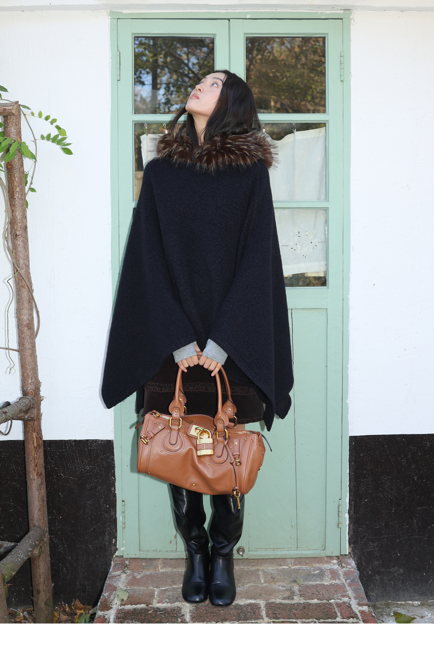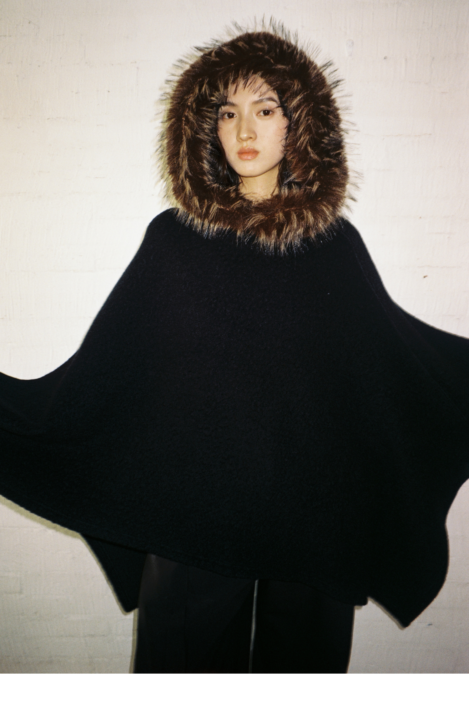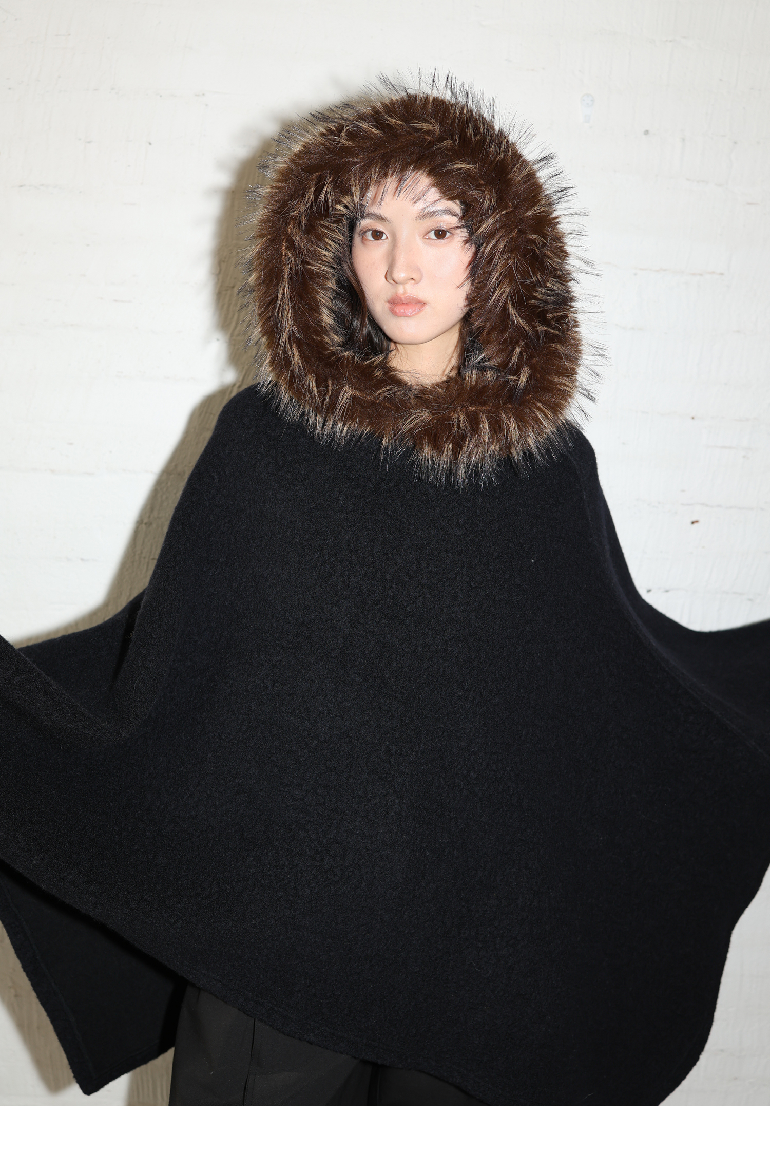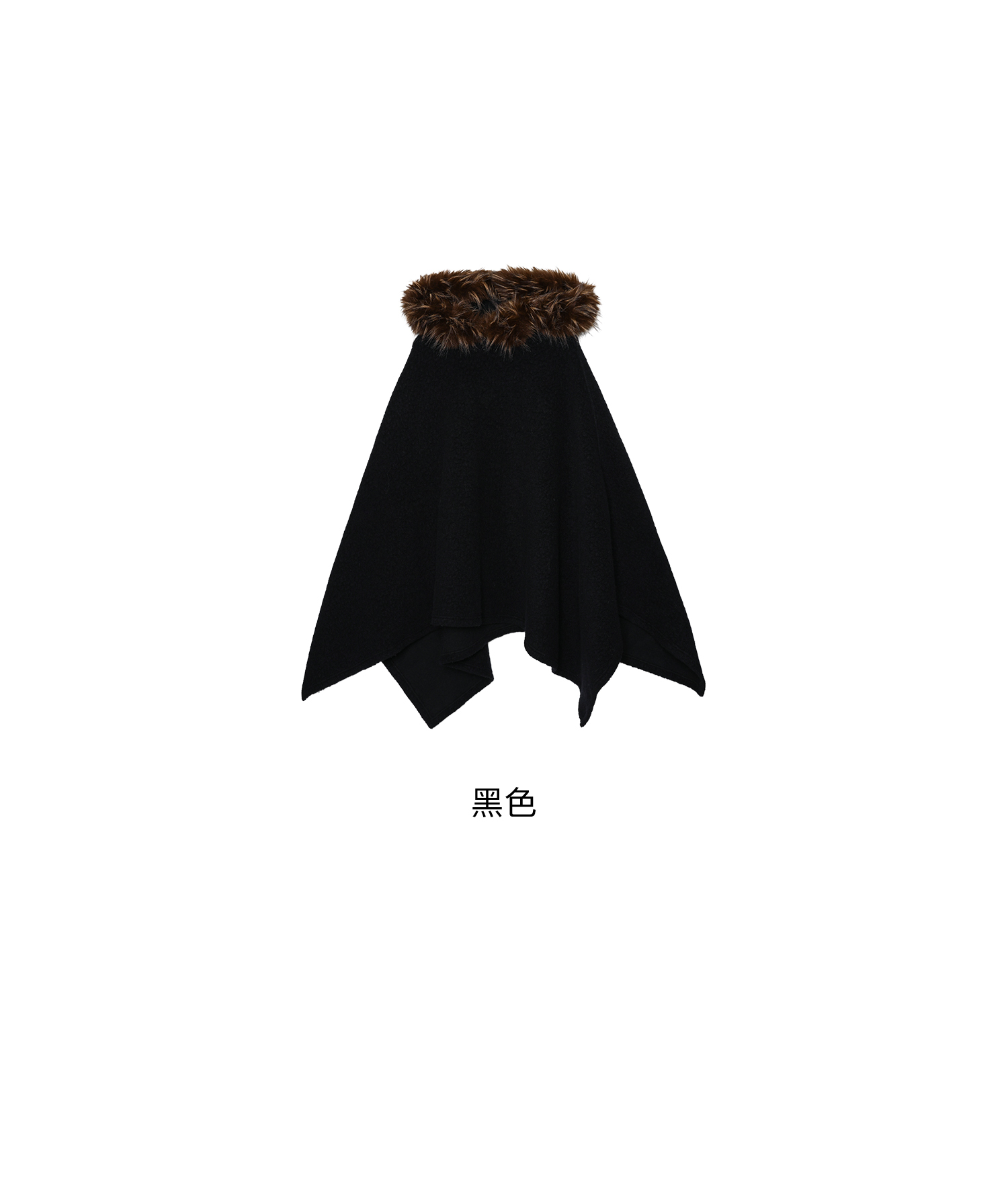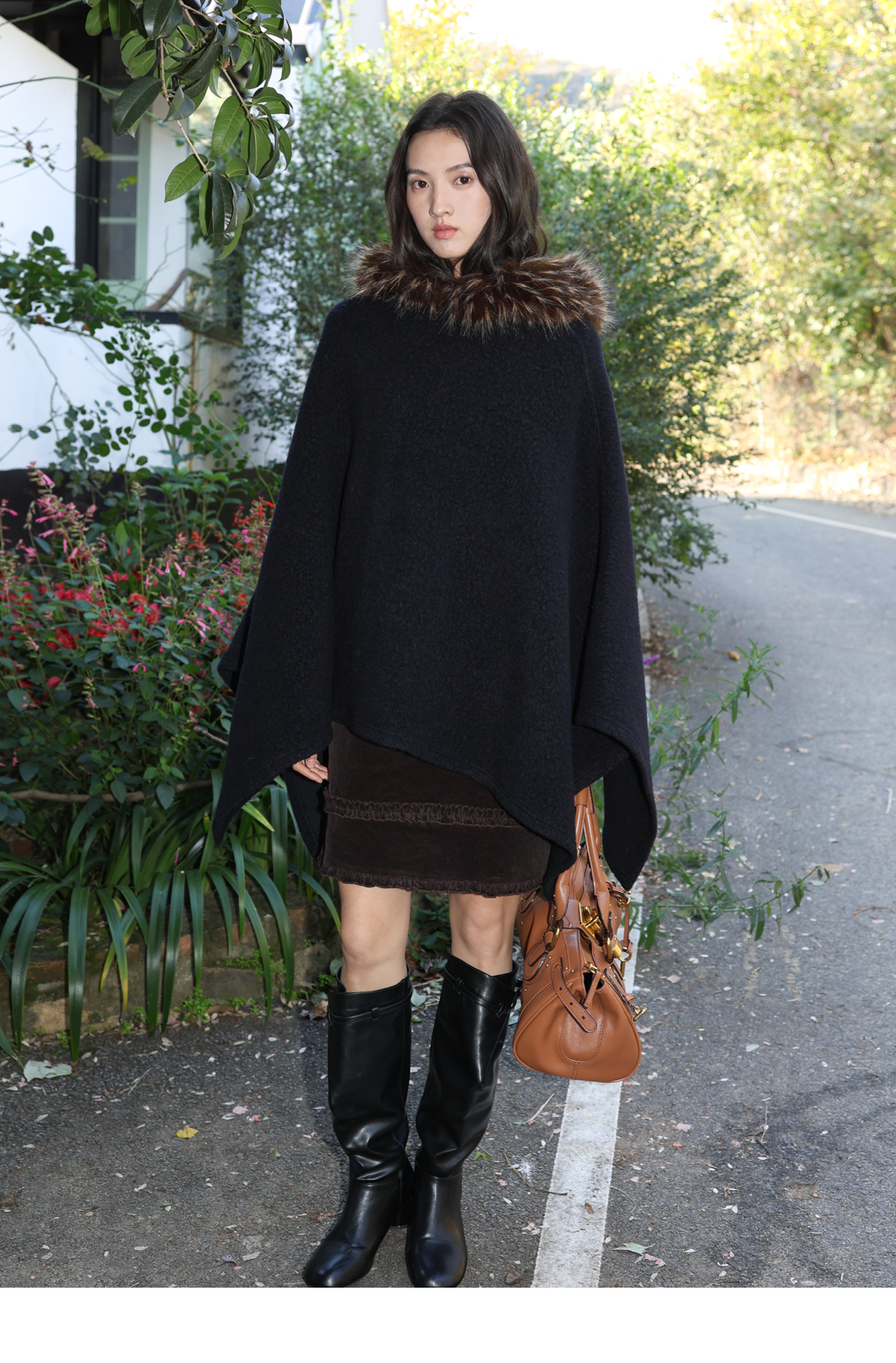 素舶 绵羊毛撞色环保皮草毛领防风保暖连帽斗篷外套毛呢大衣