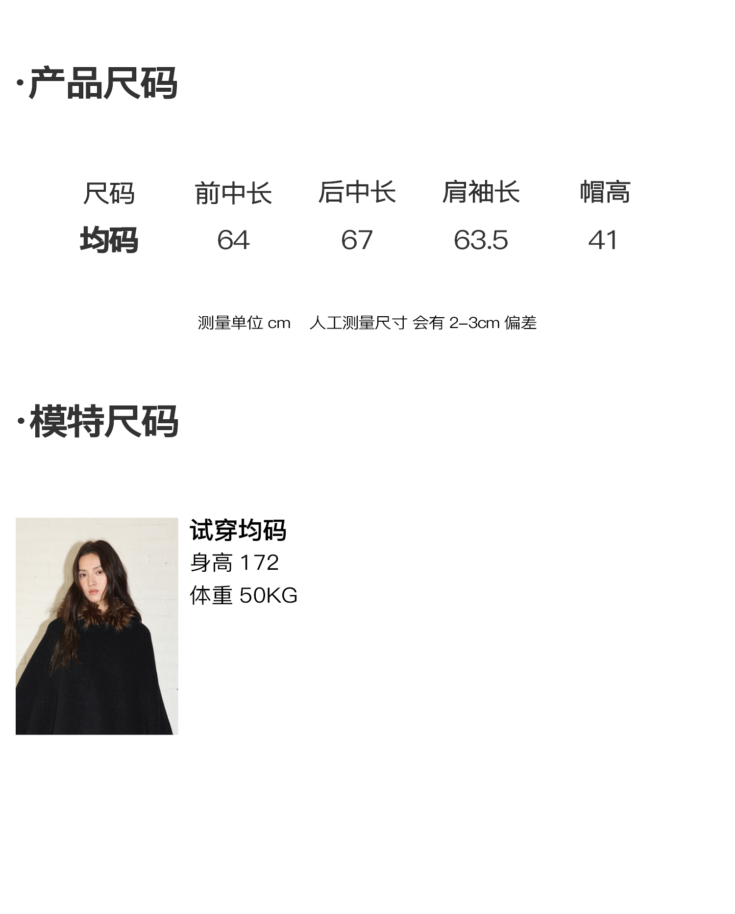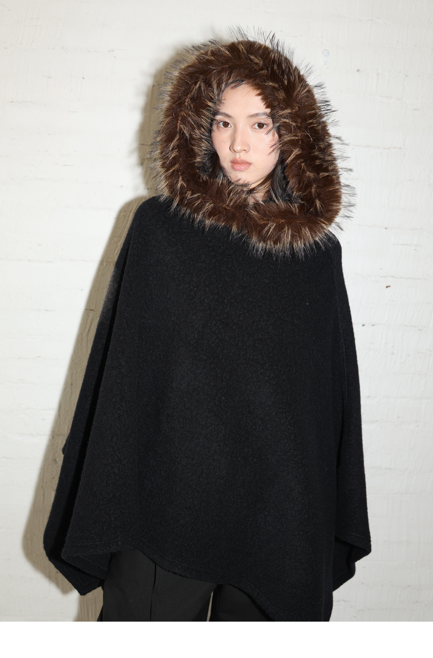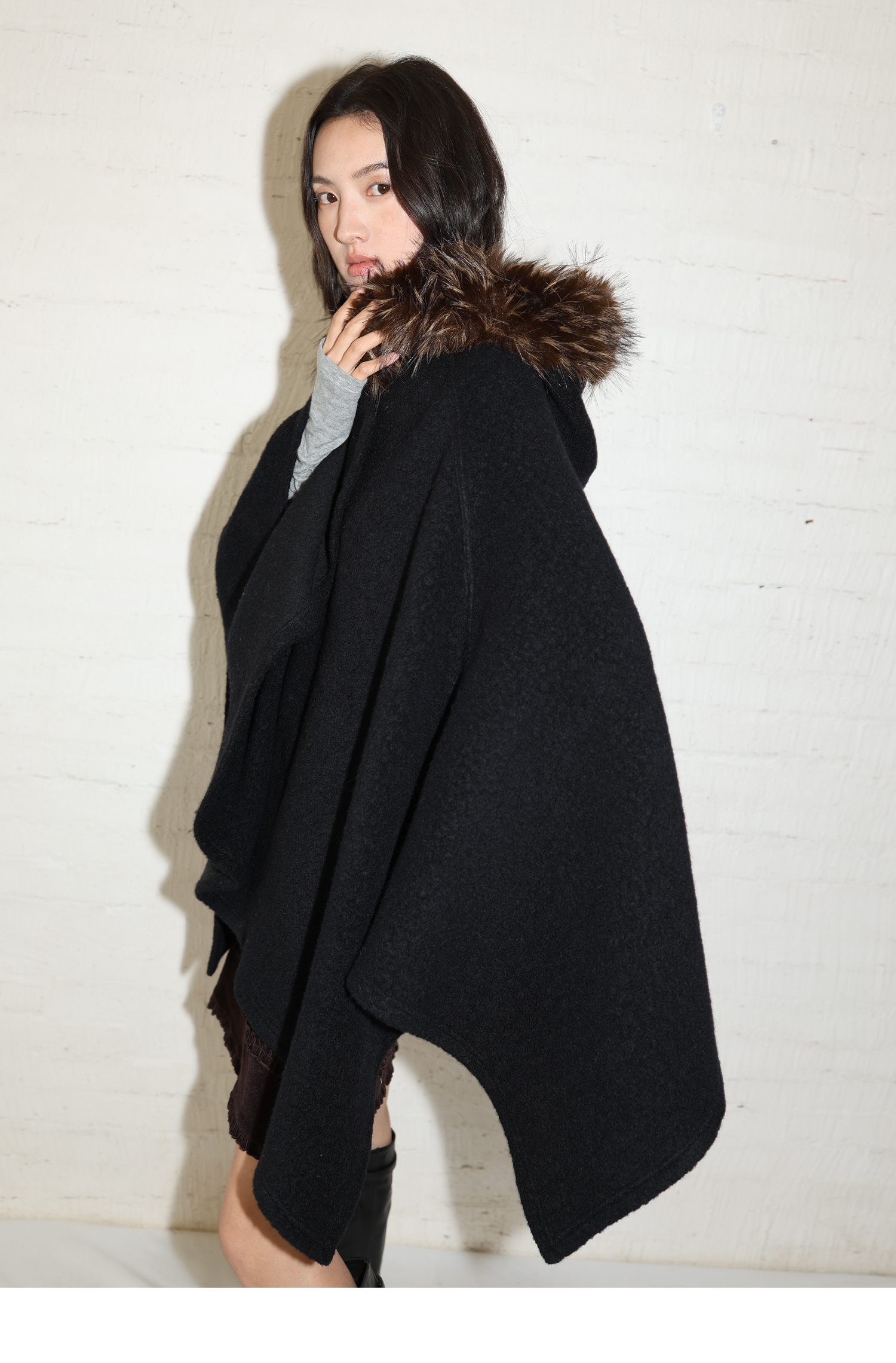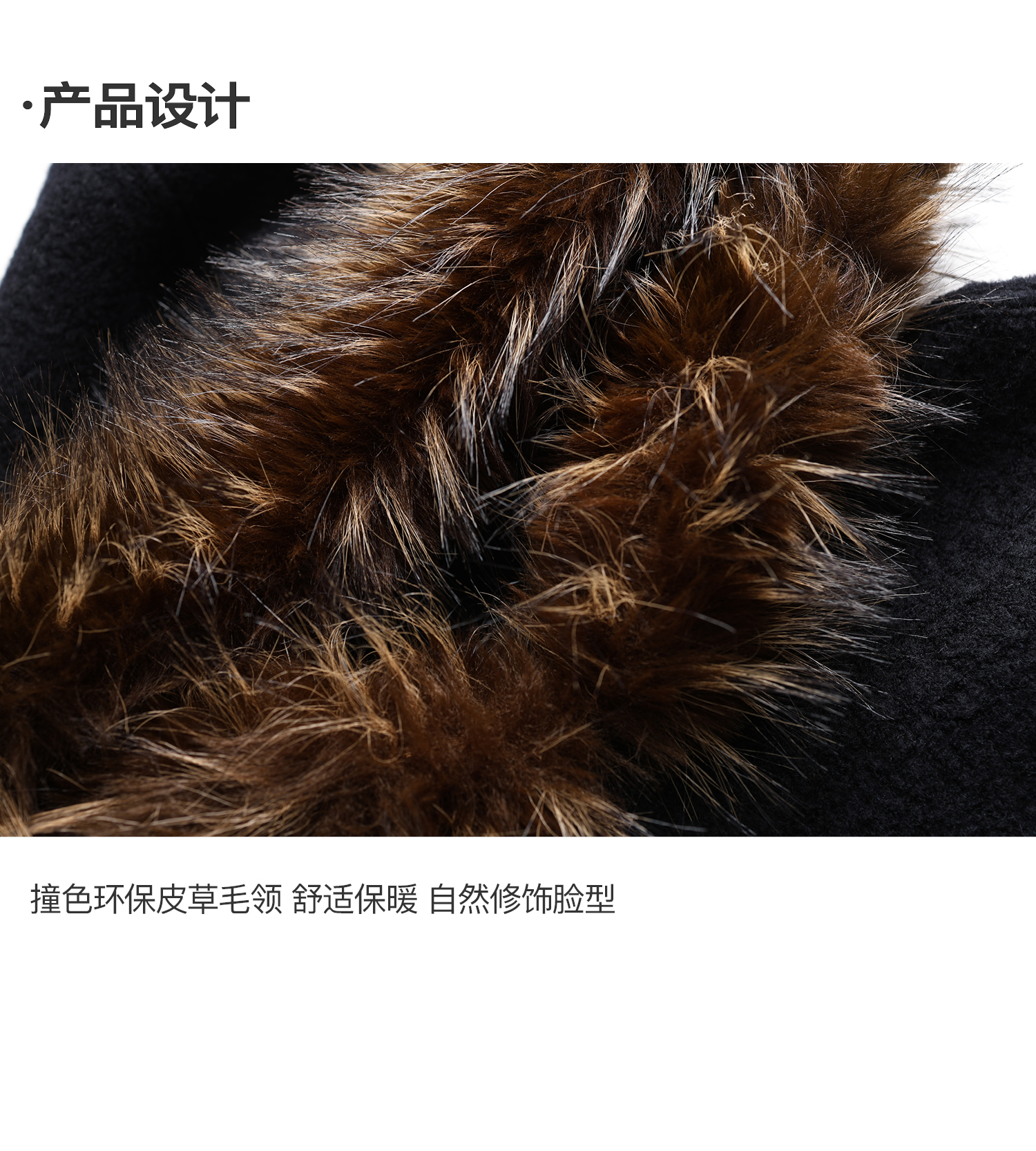 素舶 绵羊毛撞色环保皮草毛领防风保暖连帽斗篷外套毛呢大衣
