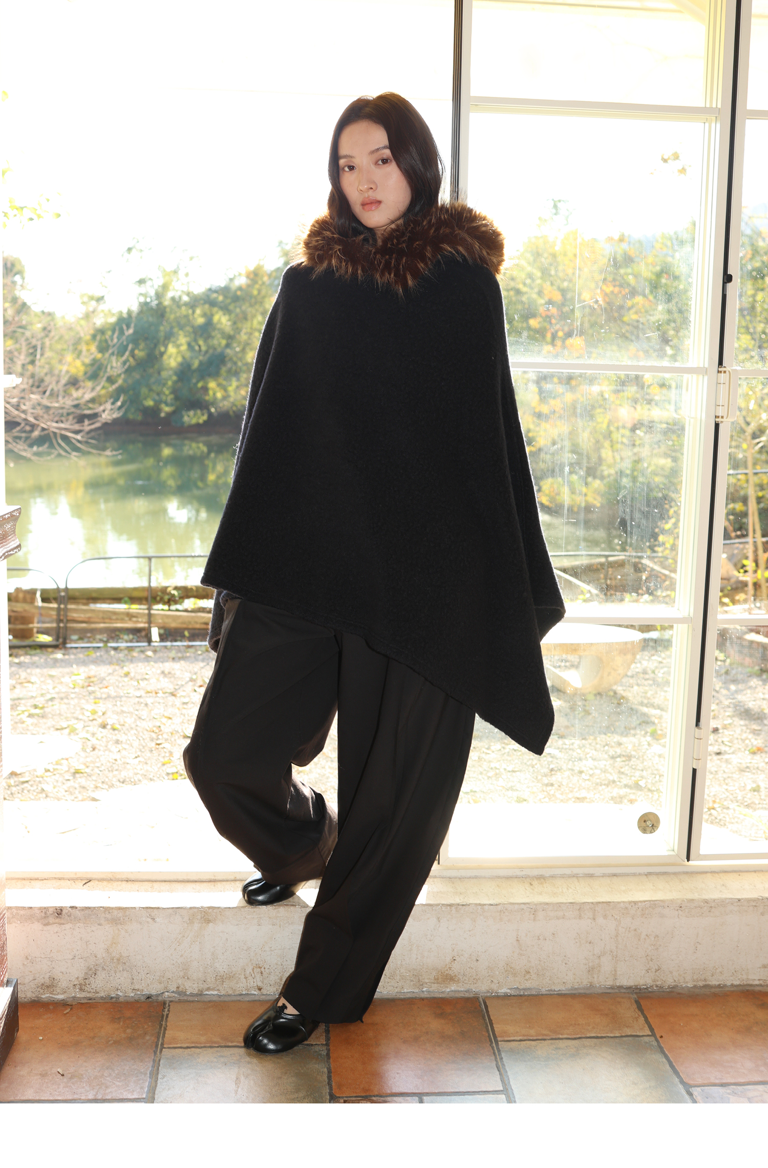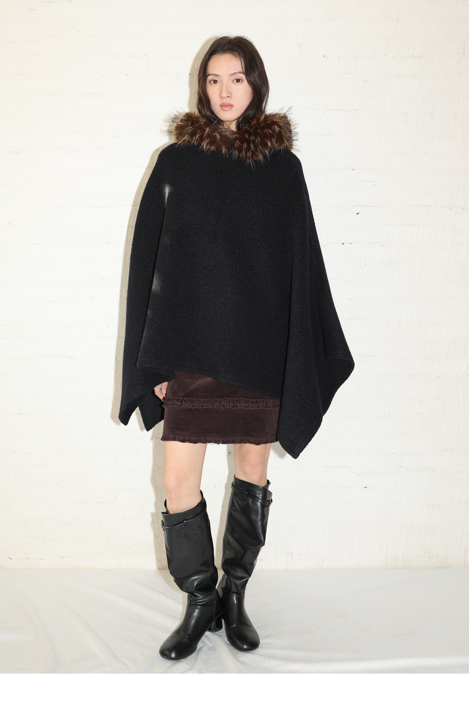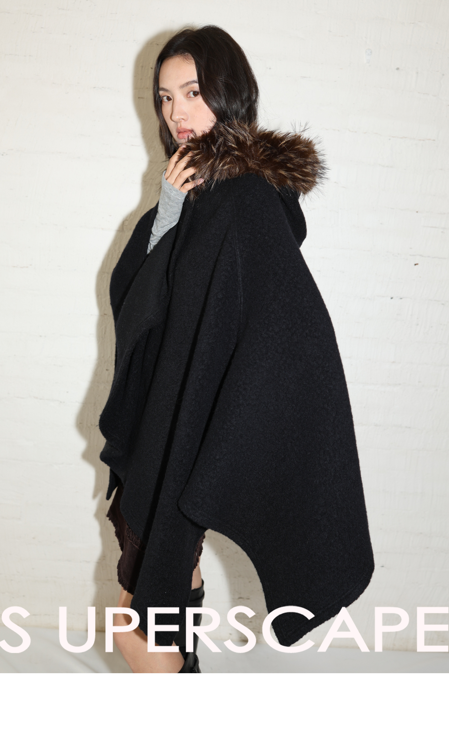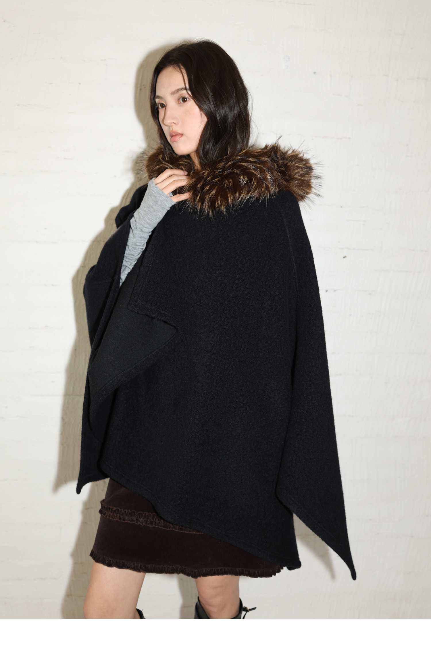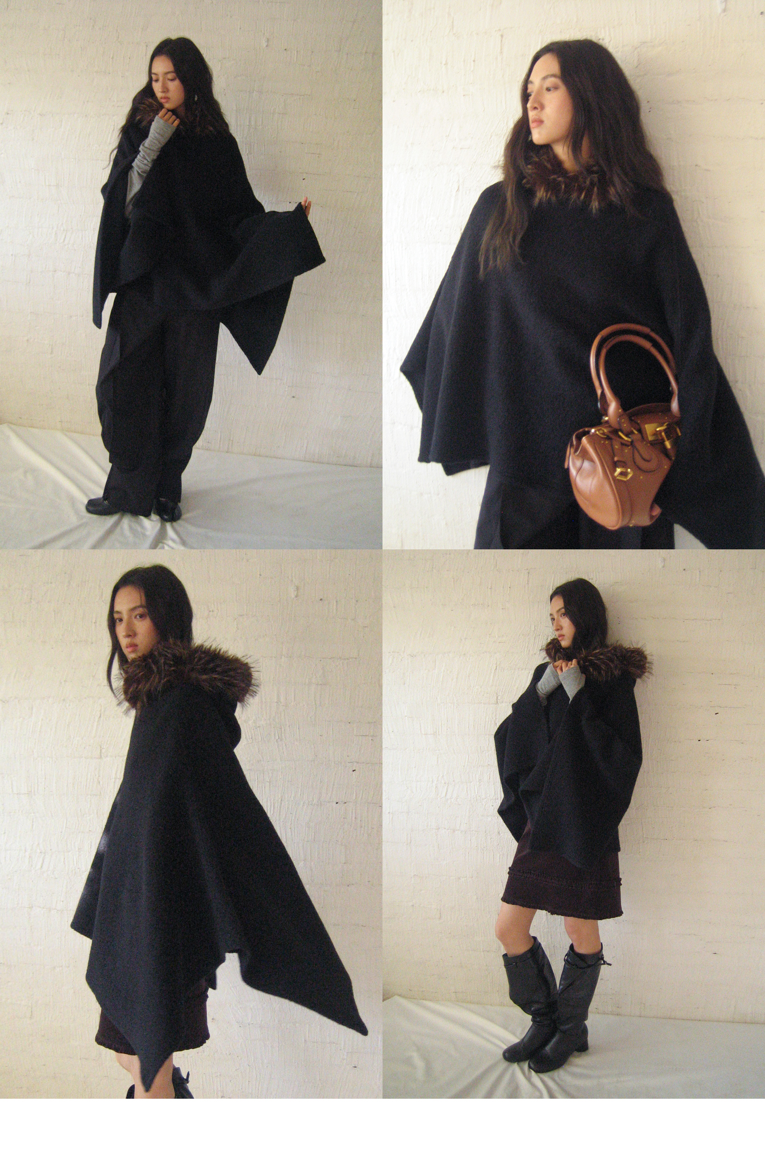 素舶 绵羊毛撞色环保皮草毛领防风保暖连帽斗篷外套毛呢大衣