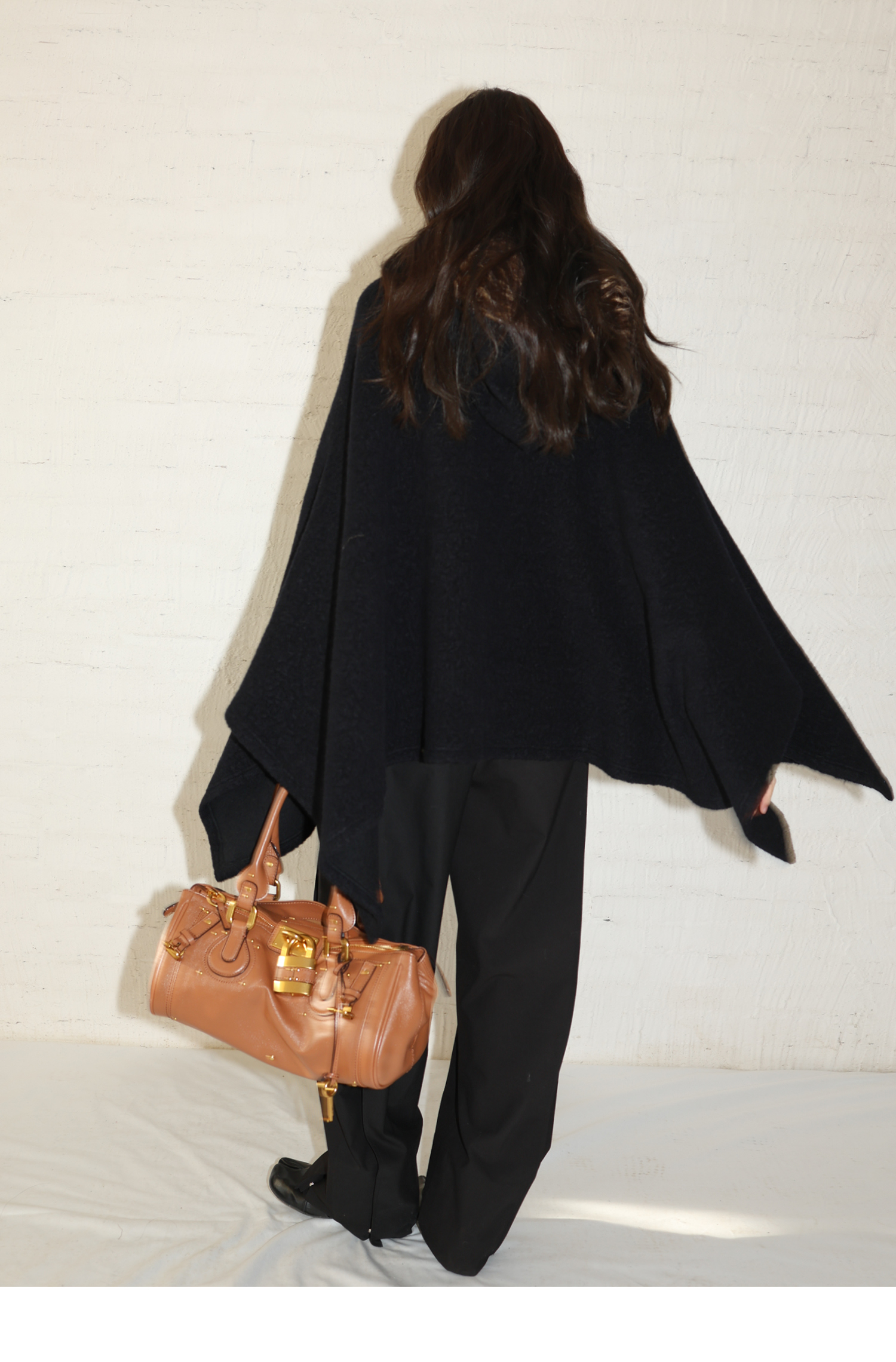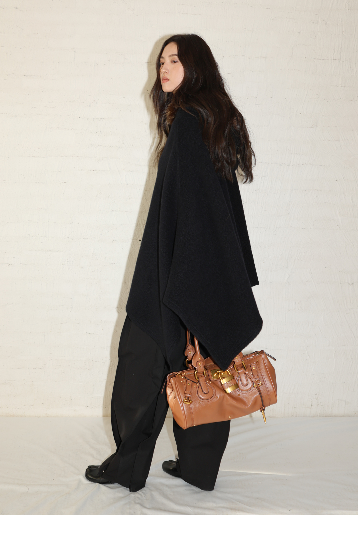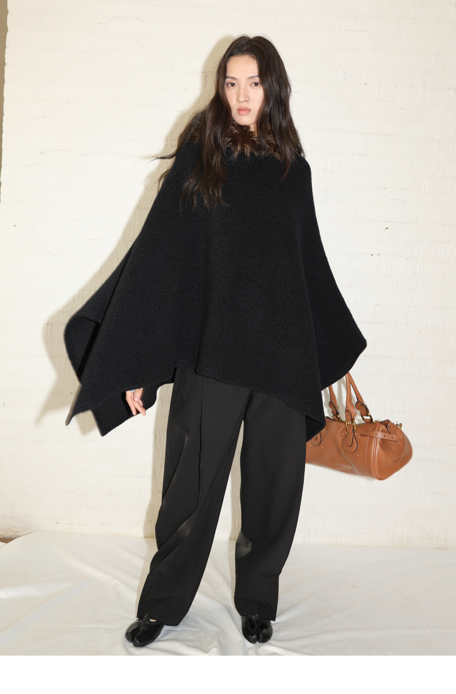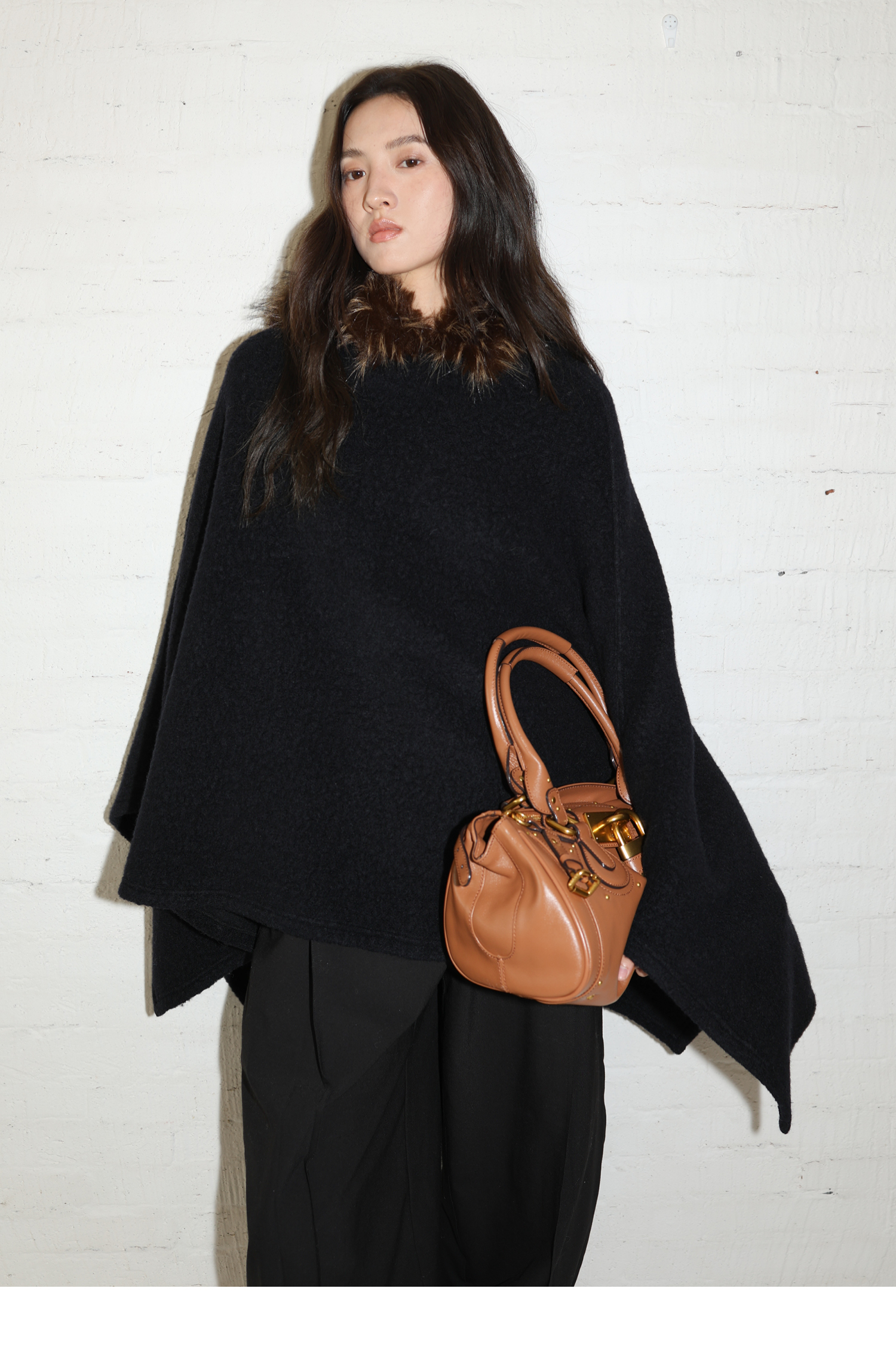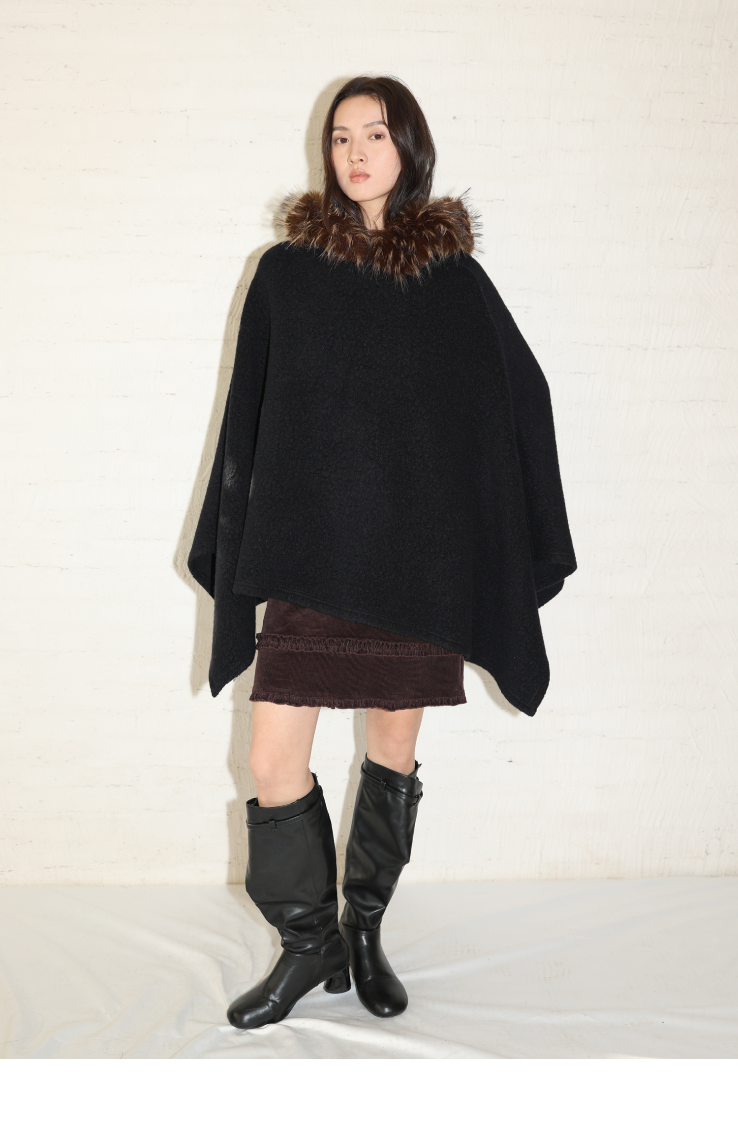 素舶 绵羊毛撞色环保皮草毛领防风保暖连帽斗篷外套毛呢大衣
