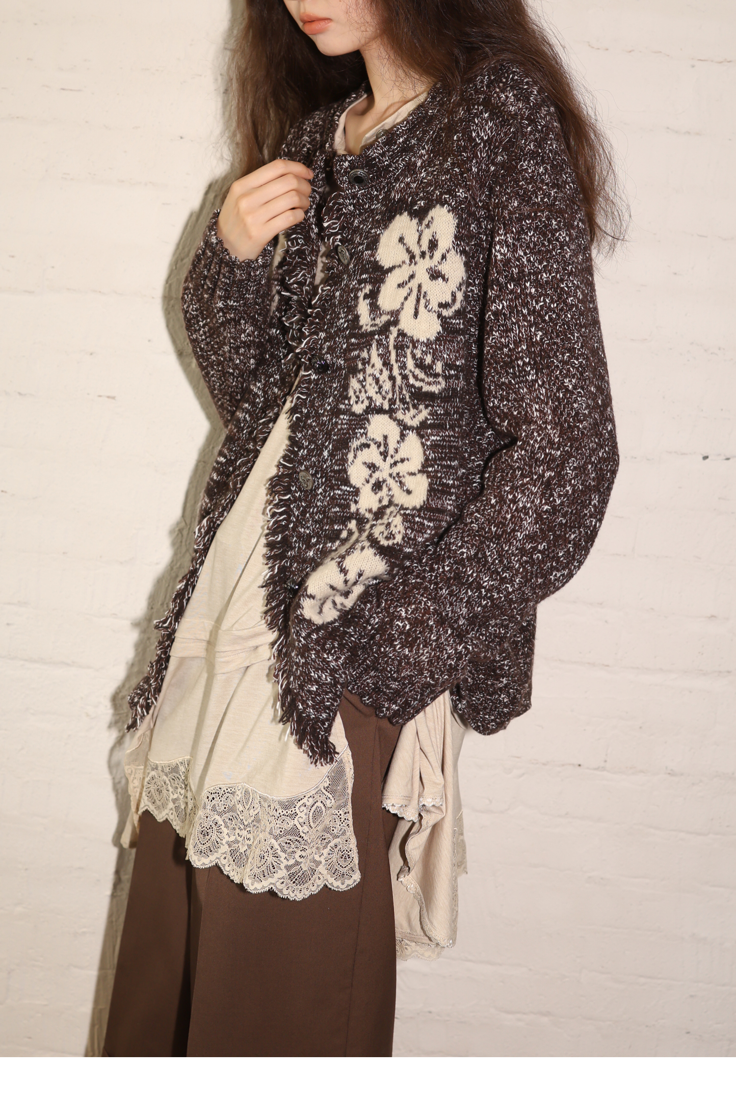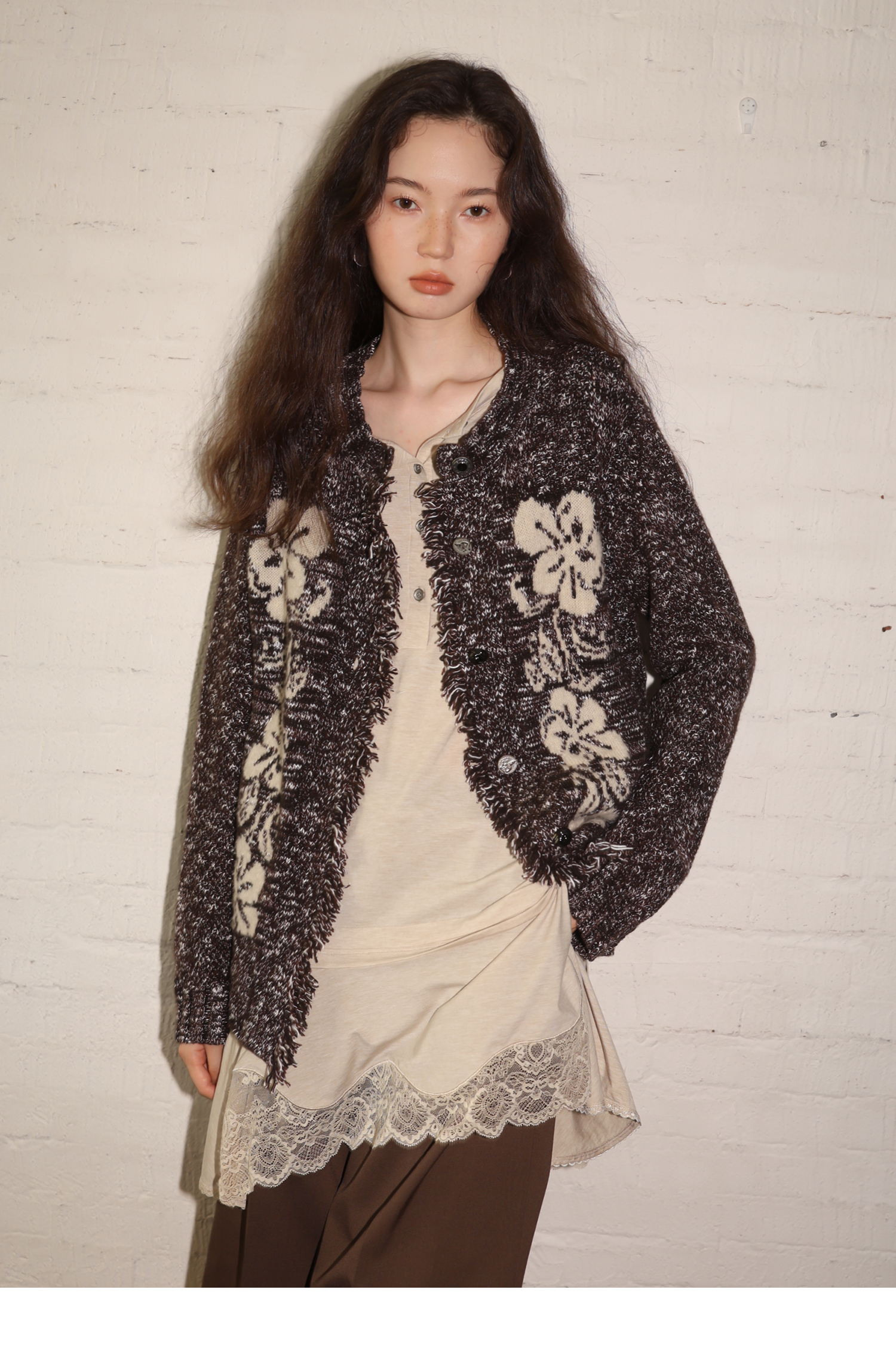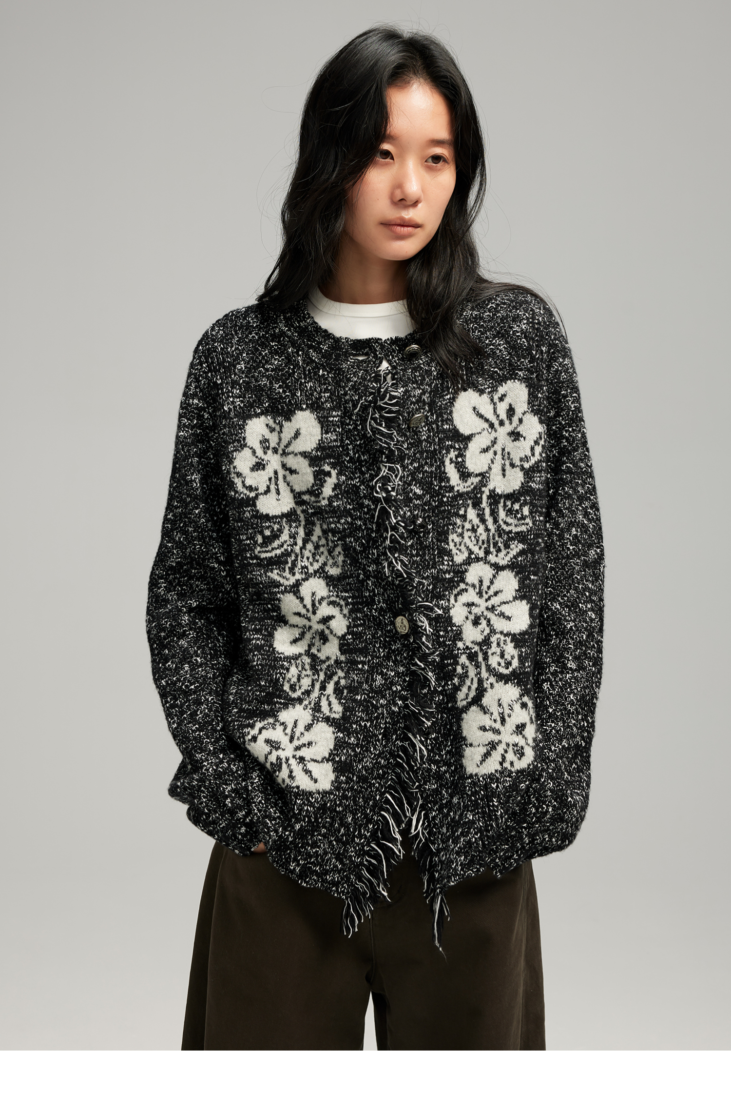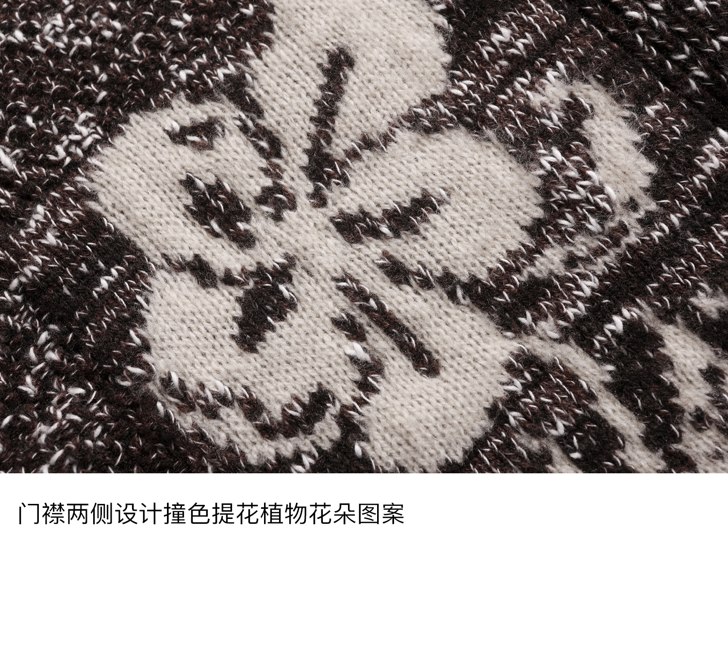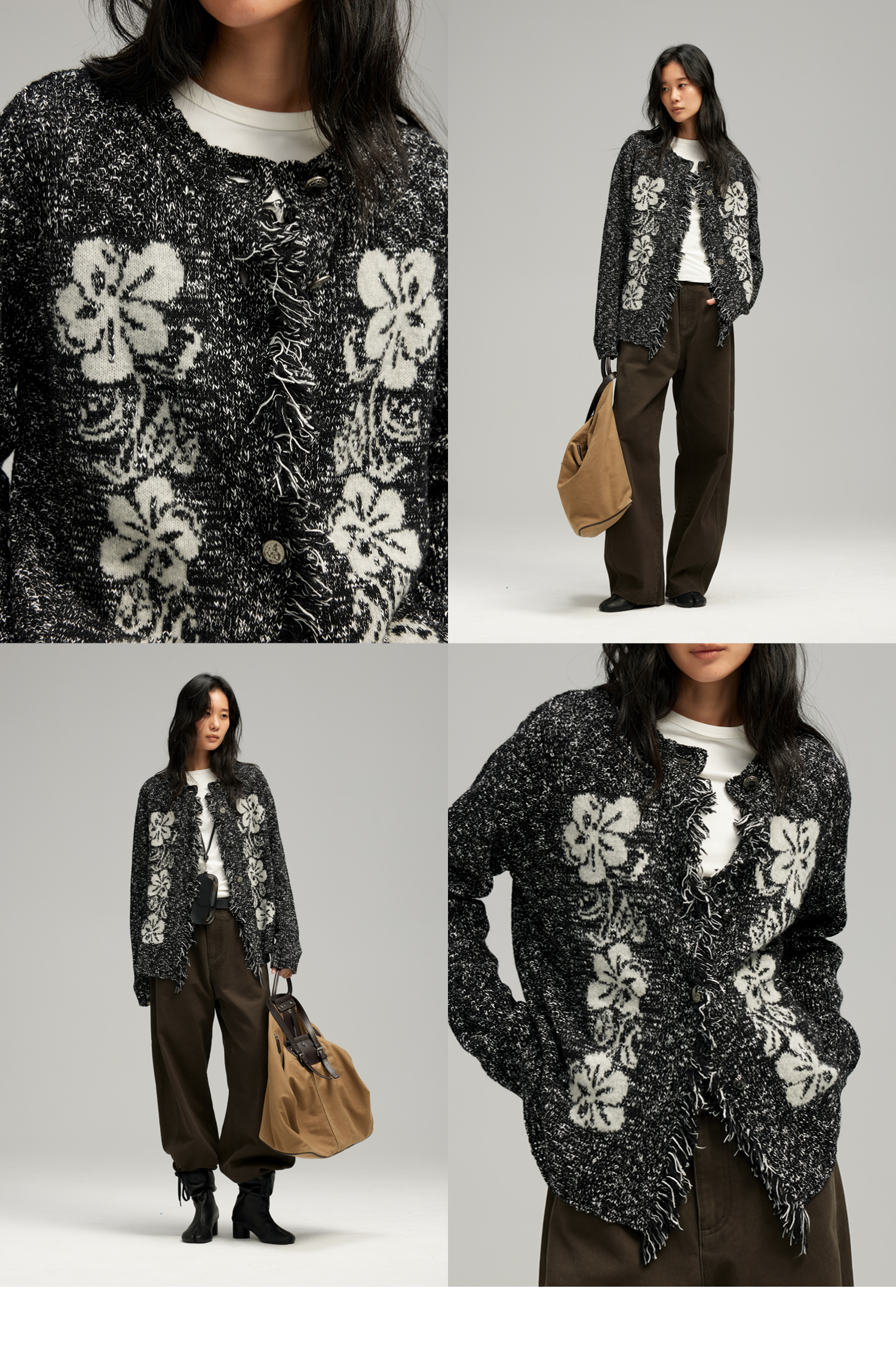 素舶 牦牛绒绵羊毛柔软细腻混色花朵提花撞色流苏小香针织开衫