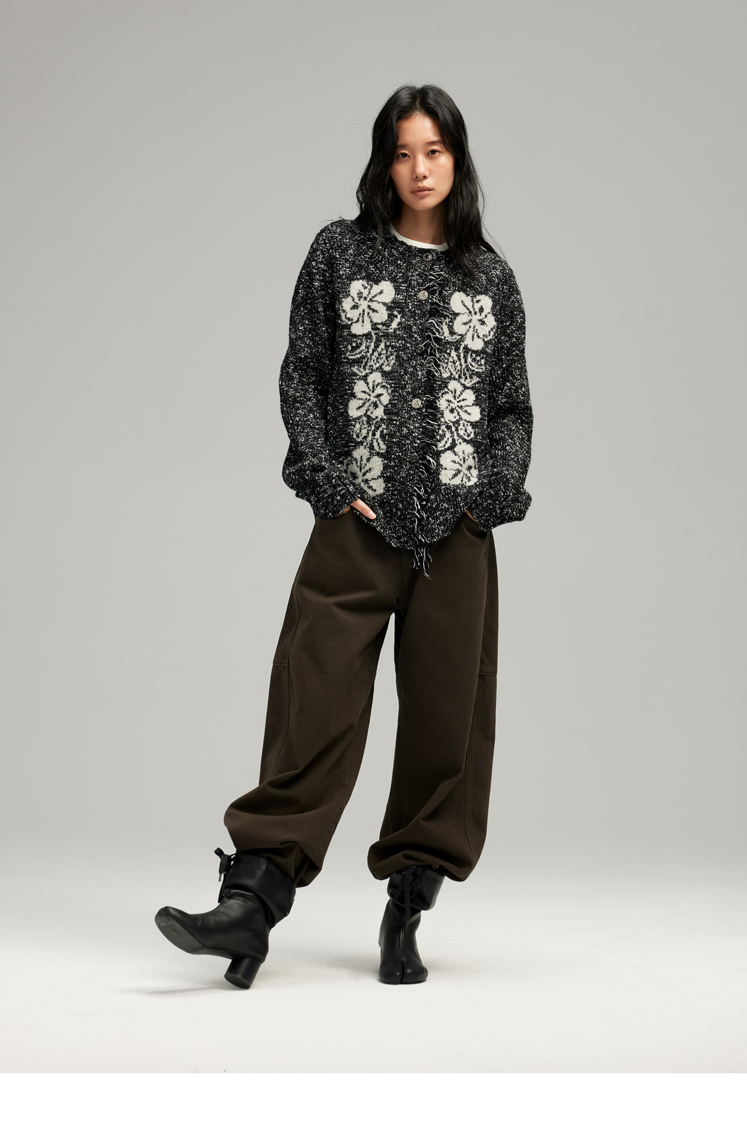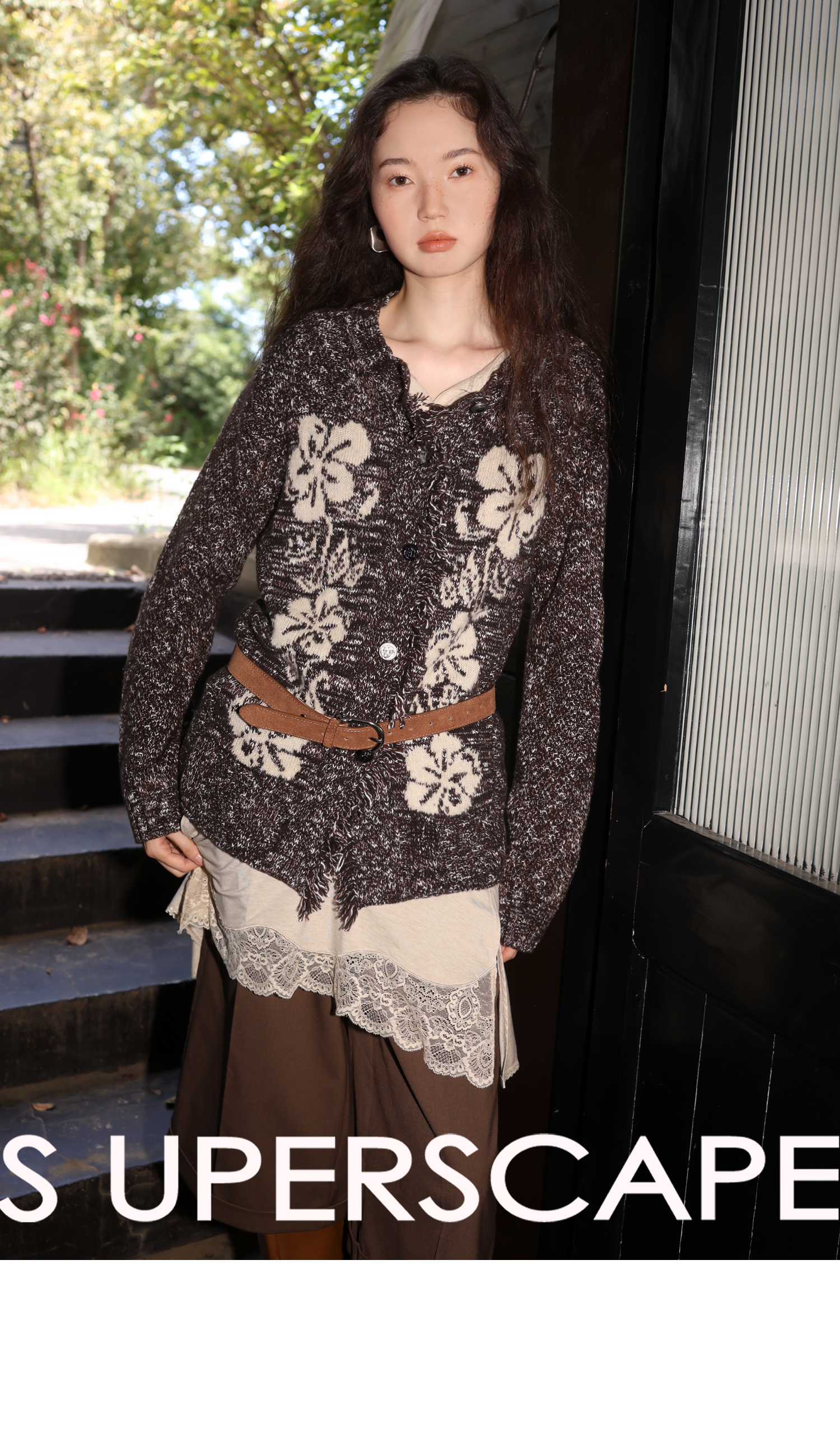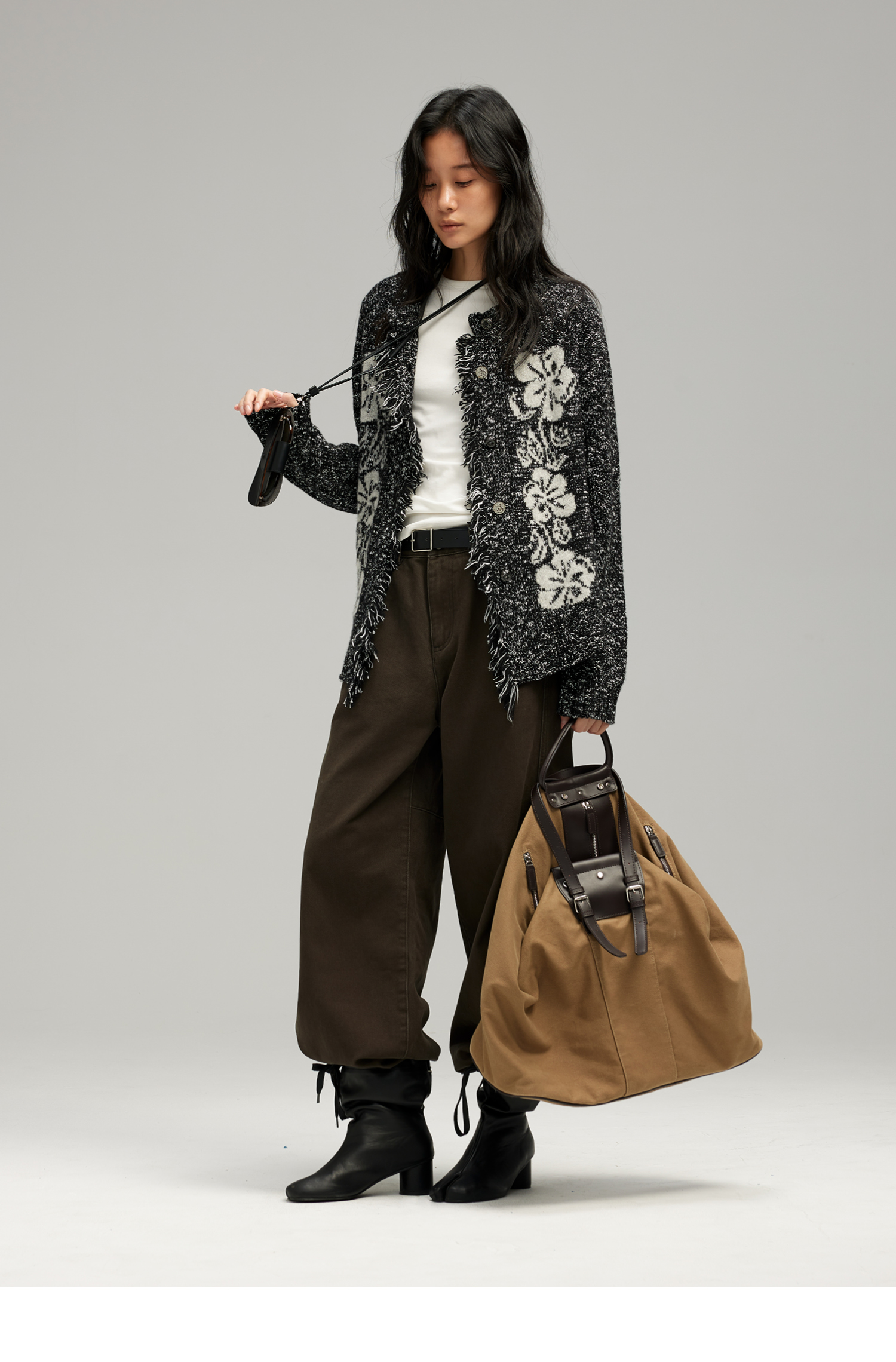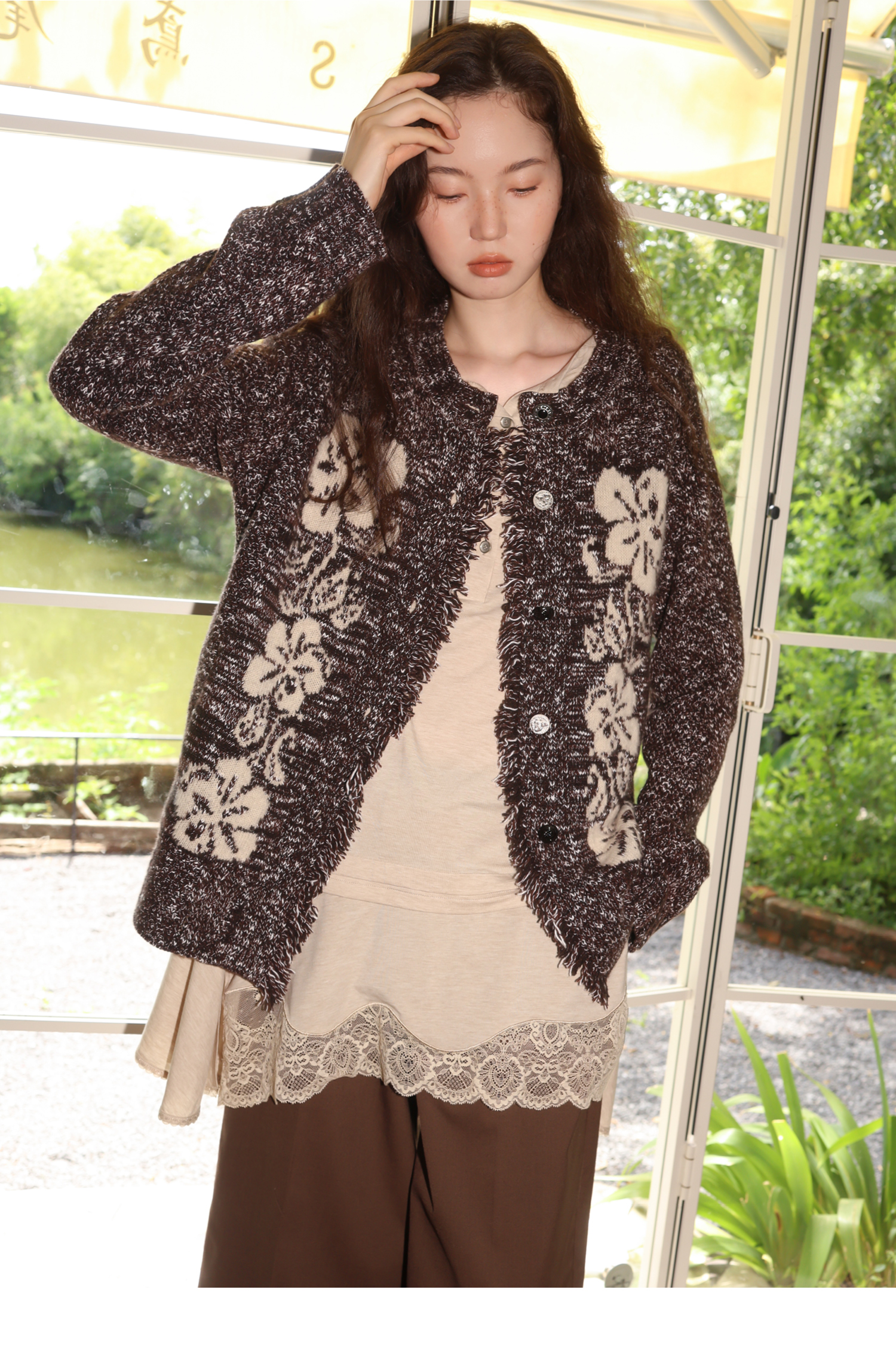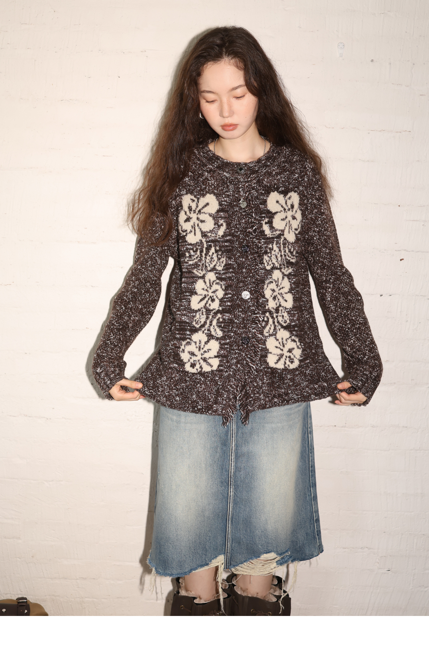 素舶 牦牛绒绵羊毛柔软细腻混色花朵提花撞色流苏小香针织开衫