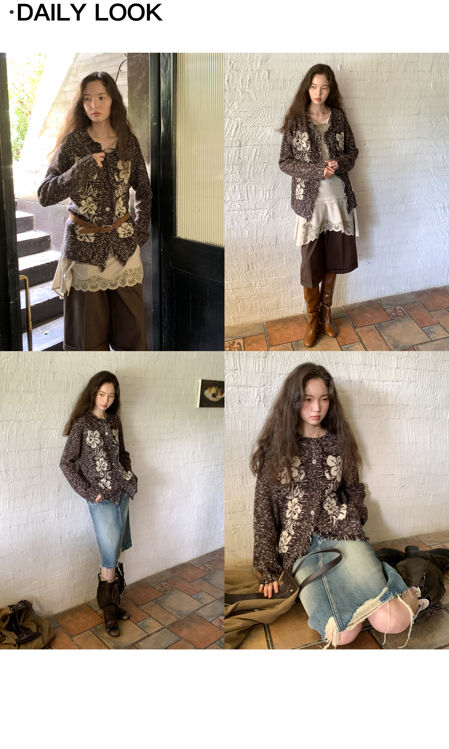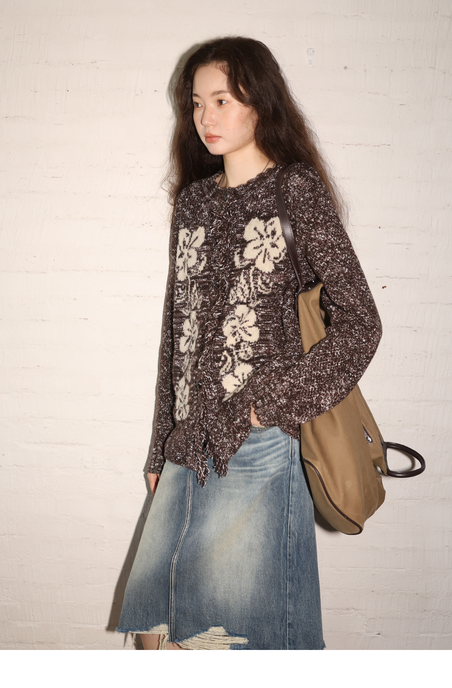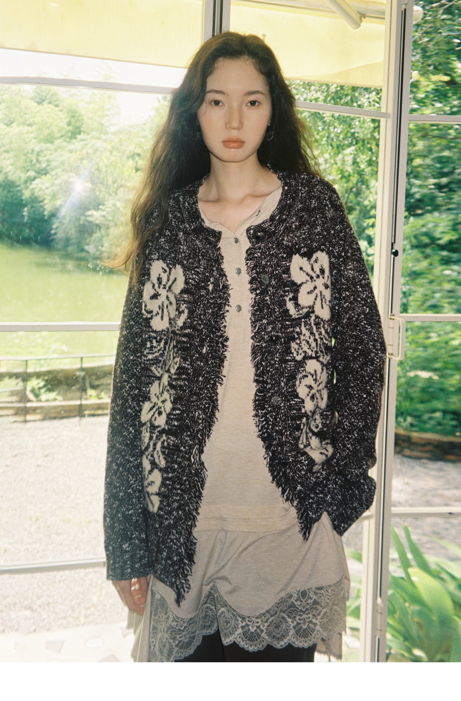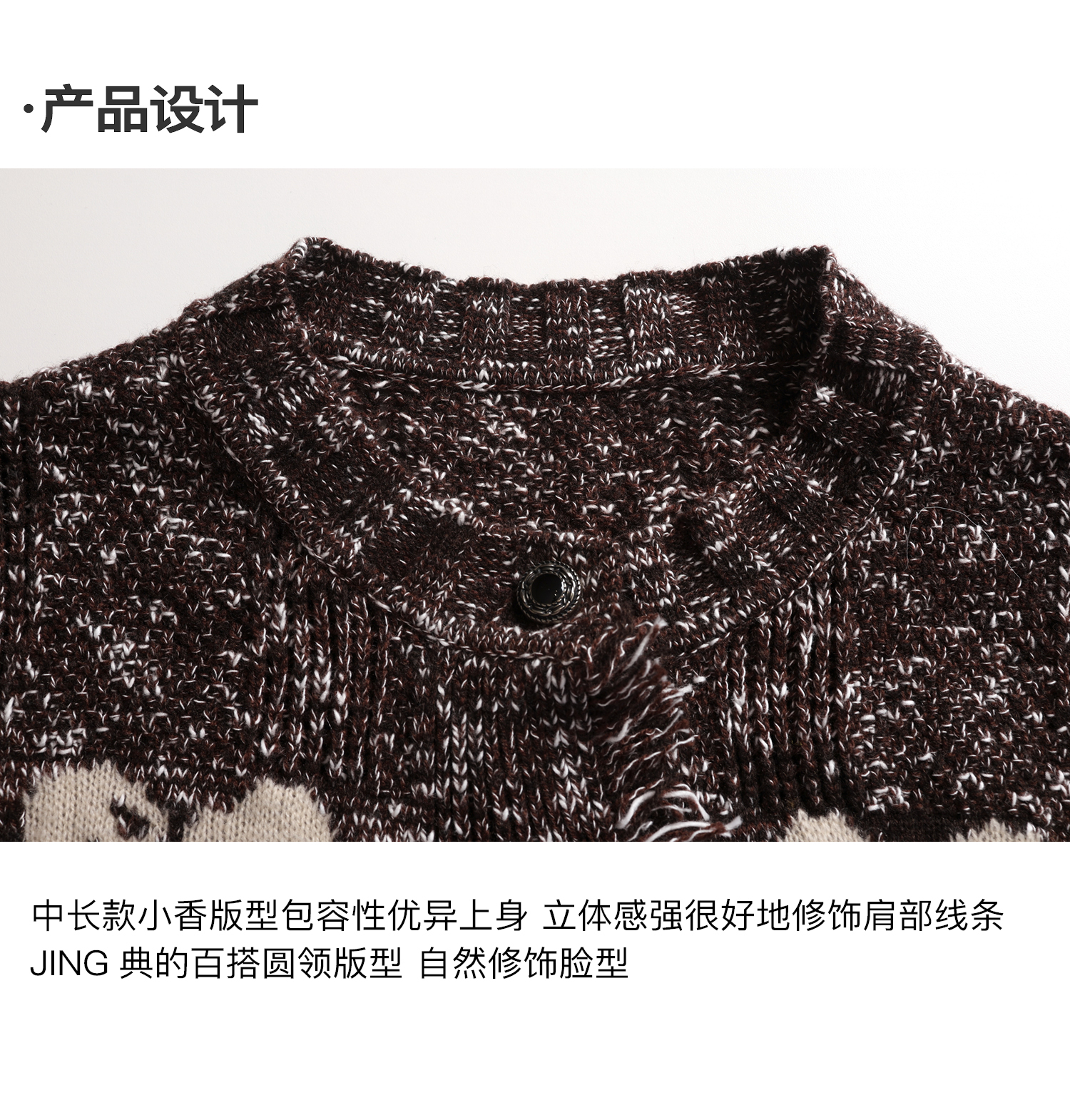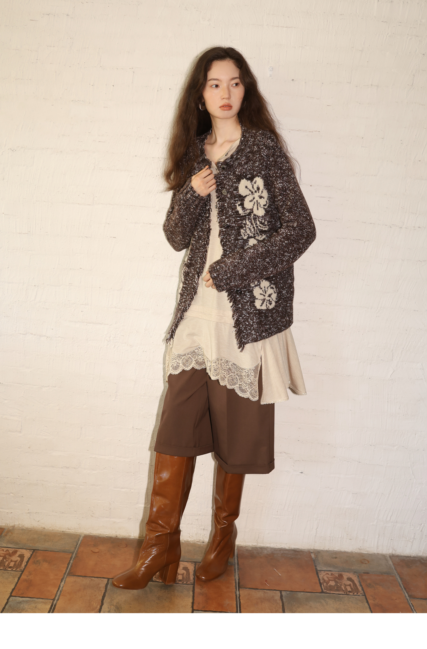 素舶 牦牛绒绵羊毛柔软细腻混色花朵提花撞色流苏小香针织开衫