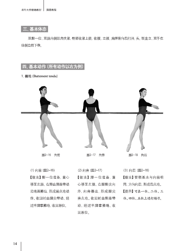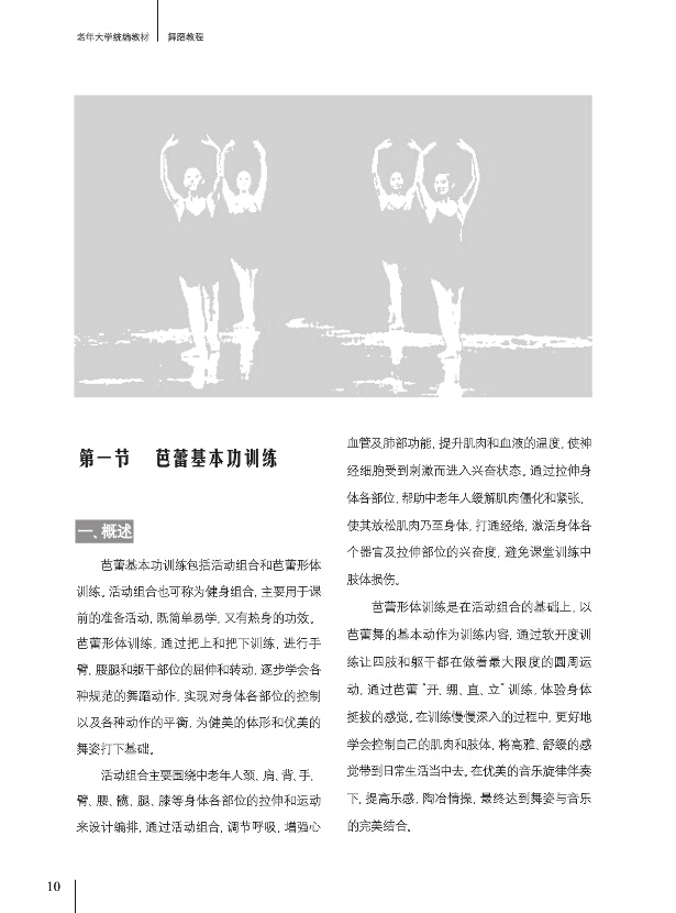 本教程作为老年大学形体舞蹈基础课程的统编教材,主要围绕老年大学形体舞蹈课“教什么,如何教?学什么,如何学?”的问题,通过对教学内容和教学方法的选择和合理设计,突出老年大学形体舞蹈教学的针对性、科学性和规范性。本书有选择地利用各种舞蹈的动作组合,包括芭蕾基训、古典舞身韵、民族民间舞蹈的动作元素,通过科学合理的训练方式,引领中老年朋友寻找表现美的方式和方法,学会运用舞蹈这一艺术形式感受生活、感悟生命,使精神体悟更加空灵和高尚。在编写过程中,我们力图做到采用通俗易懂的语言,设计科学合理的动作,遵循循序渐进的原则,通过从单一元素到训练组合再到表演组合的学习,不断提高中老年朋友对于舞蹈的表现能力,通过知识的拓展同时提高欣赏美和体验美的能力。